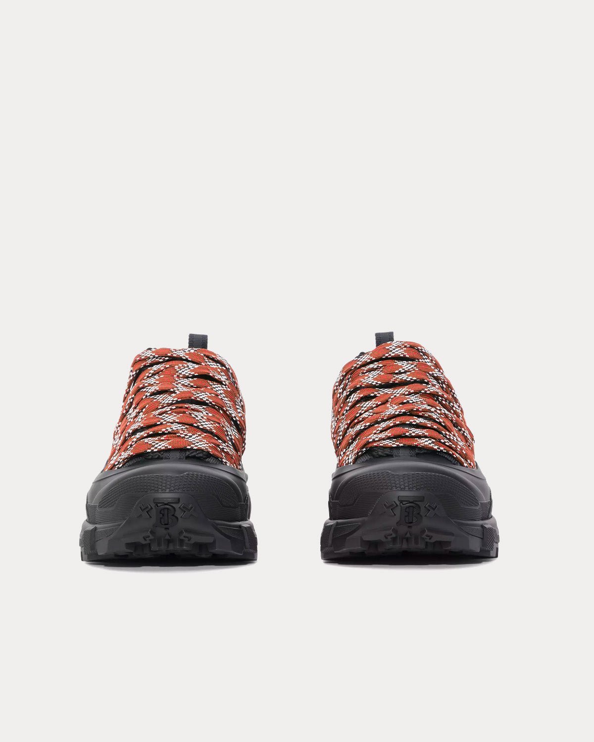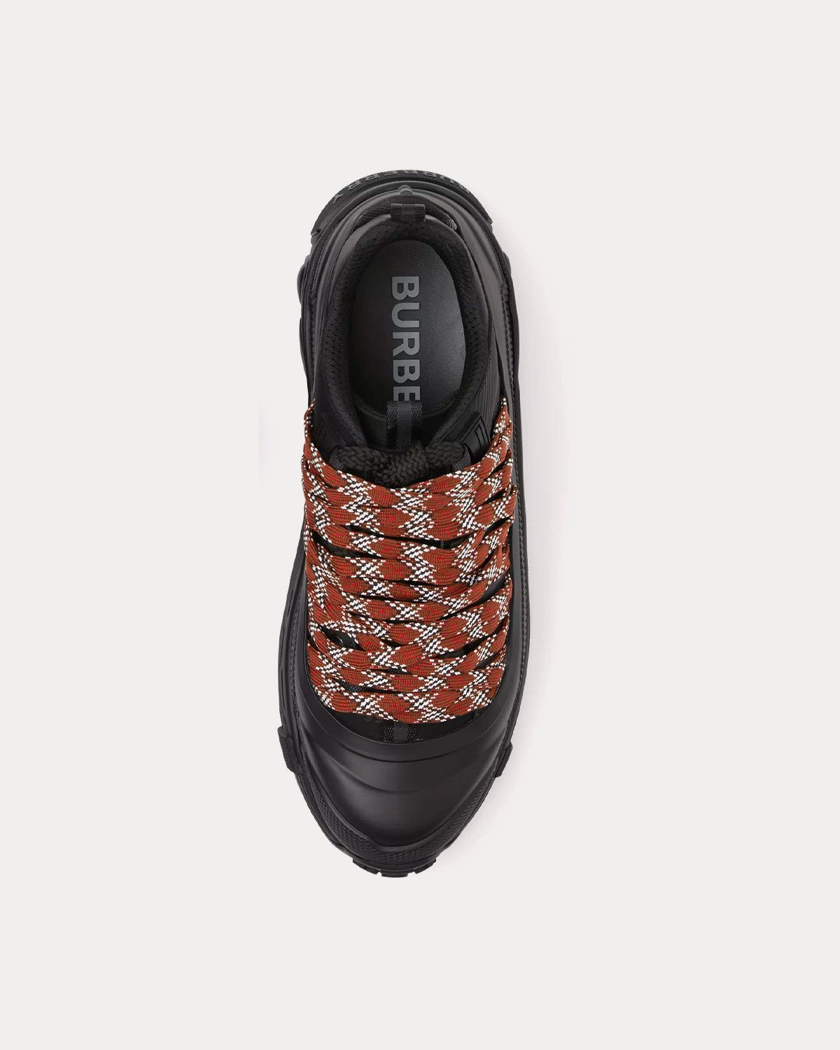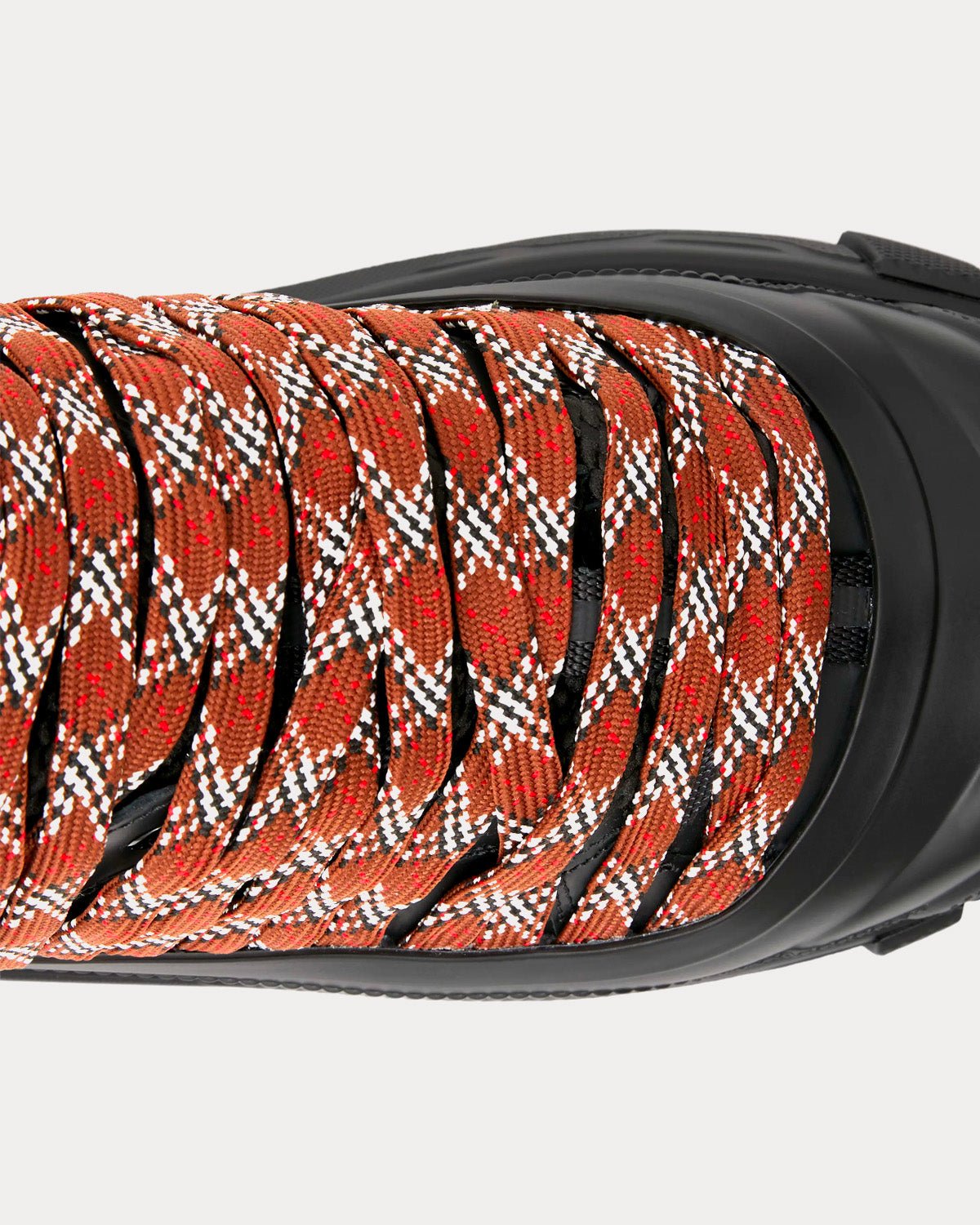 Baskets Burberry du dĂ©filĂ©, confectionnĂ©es en cuir et nylon, ornĂ©es de lacets Ă©pais croisĂ©s pour une finition texturĂ©e. Elles sont surmontĂ©es d’un surchaussure mat inspirĂ© des bottes de pluie et d’une semelle croisĂ©e rappelant notre emblĂ©matique motif Ă  carreaux. Ce modèle a Ă©tĂ© prĂ©sentĂ© pour la première fois dans la collection homme automne-hiver 2022 de Riccardo Tisci.