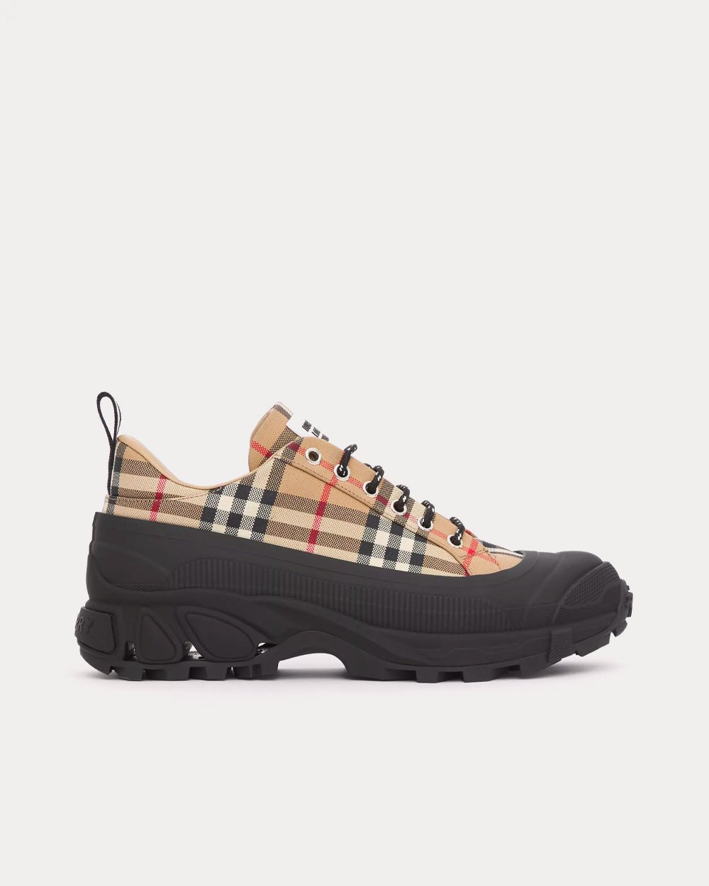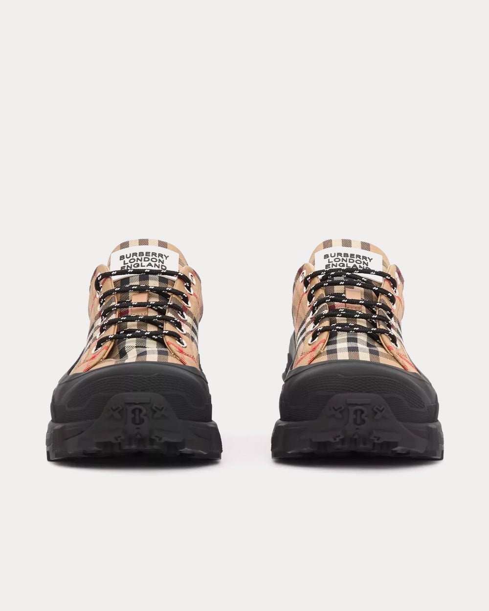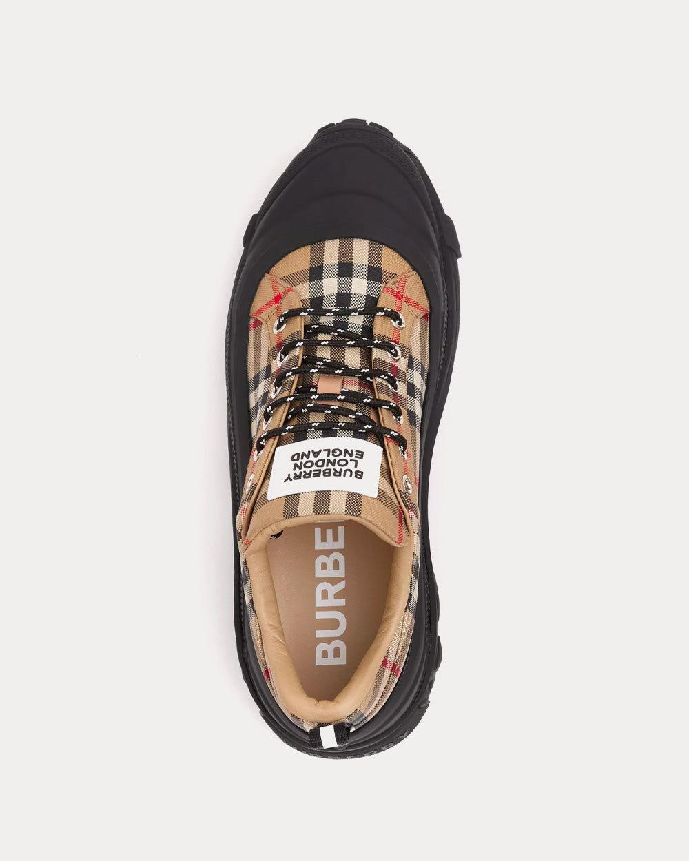 Baskets Burberry de défilé, confectionnées en coton à motif Vintage Check. Elles sont ornées d’un sur-chaussure mat inspiré des bottes de pluie et d’une semelle à détails croisés faisant référence à notre motif à carreaux emblématique.