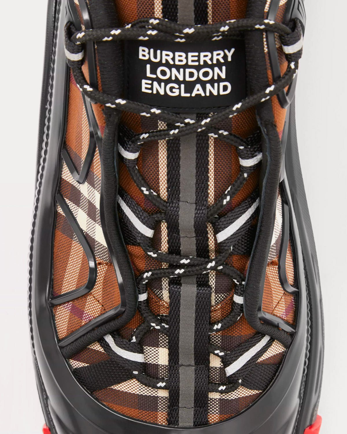 Baskets Burberry de défilé en coton biologique, ornées d’un imprimé Vintage Check. Elles sont surmontées d’un surchaussure bicolore mat inspiré des bottes de pluie et d’une semelle à détails croisés faisant référence à notre emblématique motif à carreaux.