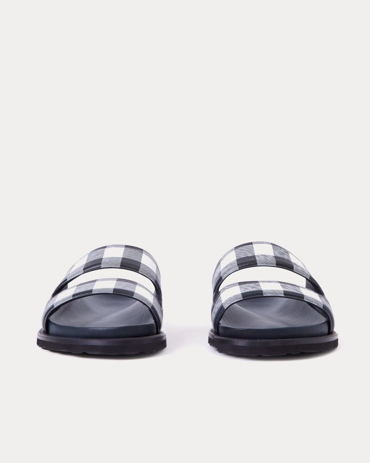 Les claquettes pour hommes BurberryCheck présentent le motif à carreaux Burberry bleu, une tige en polyuréthane et coton, une doublure en cuir de mouton, une semelle extérieure en caoutchouc et une semelle intérieure profilée pour plus de confort. Fabriquées en Italie.
