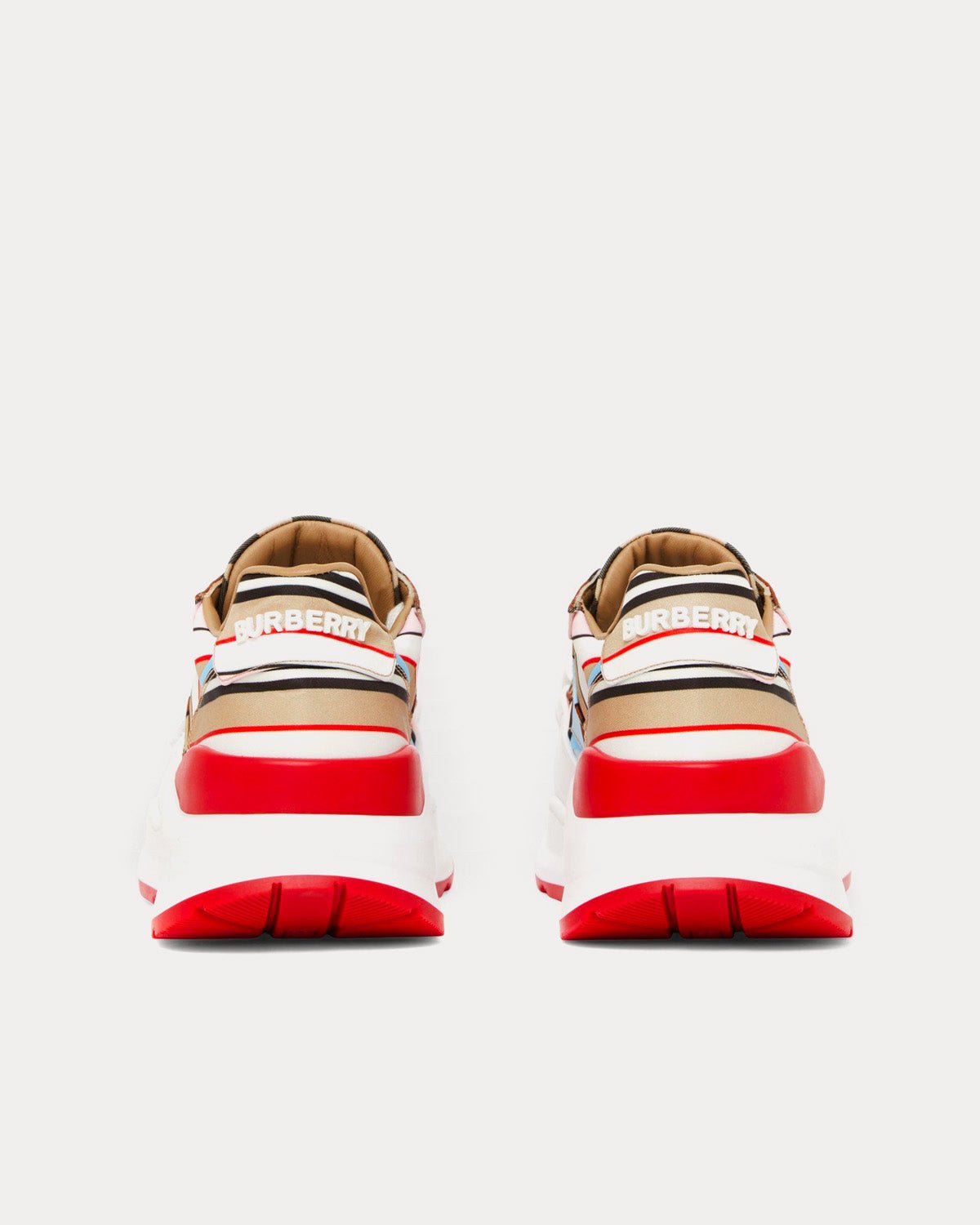 Baskets épaisses Burberry revisitées avec la bande emblématique et le motif à carreaux signature, déclinés dans un motif géométrique color-block. Doublées de cuir et de daim, elles reposent sur une semelle incurvée accentuée et ornées de notre logo.