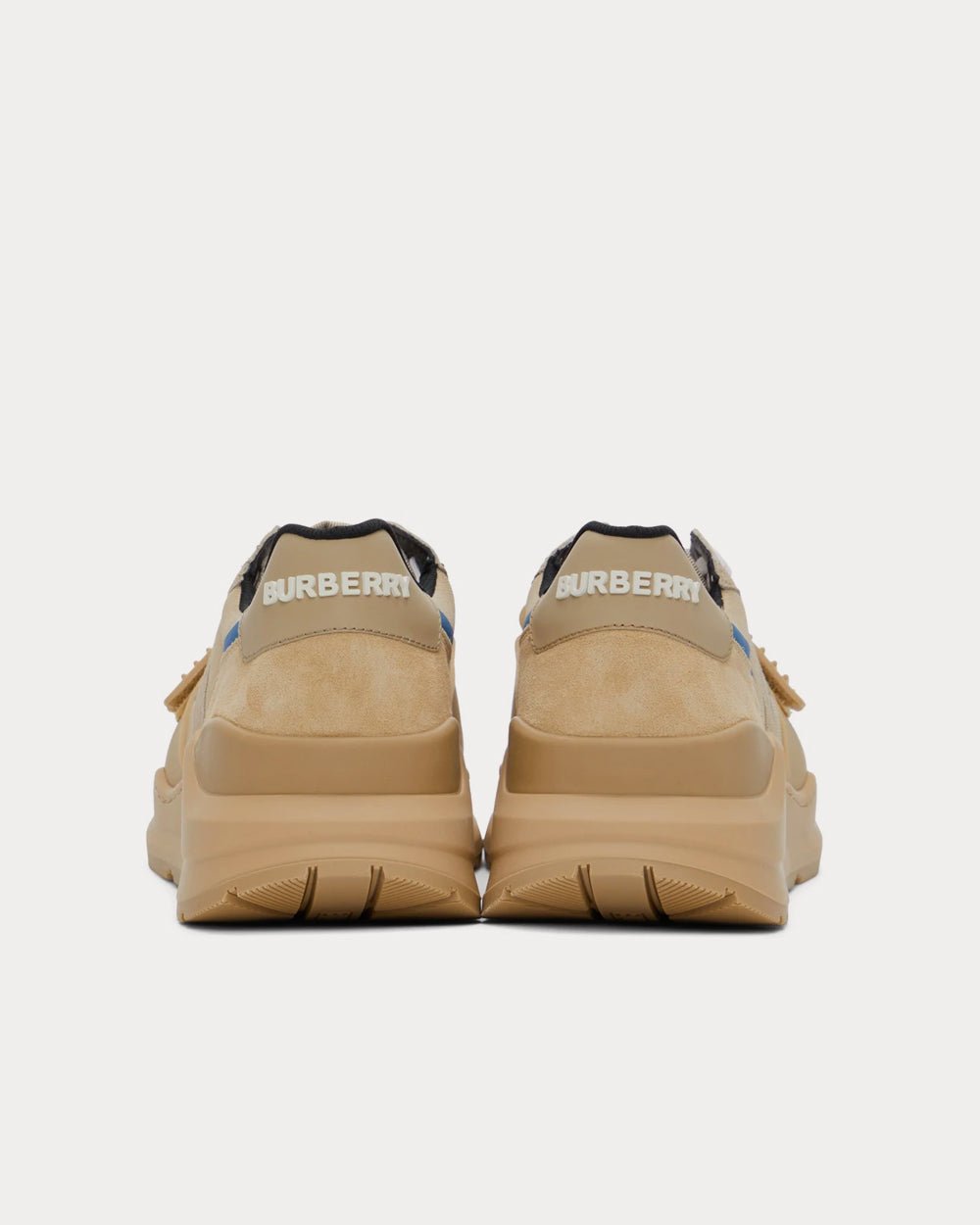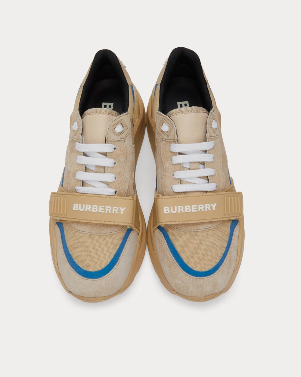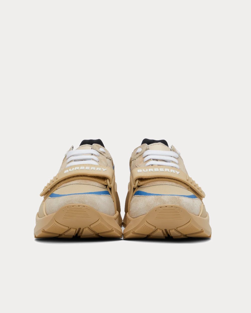 Baskets basses à empiècements en daim et toile beiges. Bordures caoutchoutées ton sur ton et bandes réfléchissantes bleues sur l’ensemble. Bout rond. Fermeture à lacets blanche. Languette et col rembourrés. Bride Velcro caoutchoutée réglable avec logo blanc sur l’empeigne. Logo caoutchouté blanc sur le talon caoutchouté ton sur ton. Semelle intermédiaire en caoutchouc ton sur ton. Semelle extérieure crantée en caoutchouc ton sur ton. Ferrures ton sur ton.