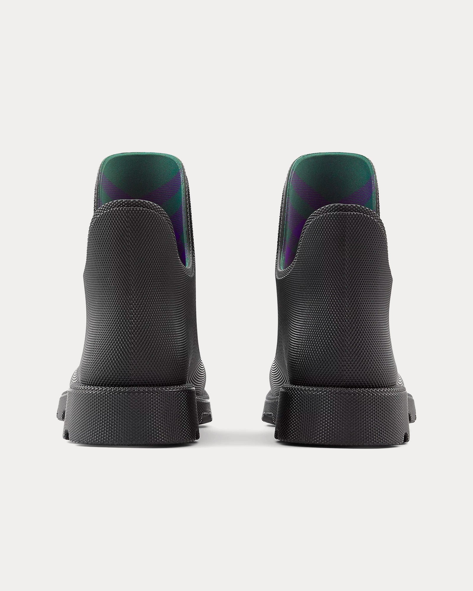 Les bottes basses Burberry Rubber Marsh pour hommes en noir présentent une tige en caoutchouc, un bout arrondi, une doublure Burberry Check et un lettrage Burberry sur la semelle.