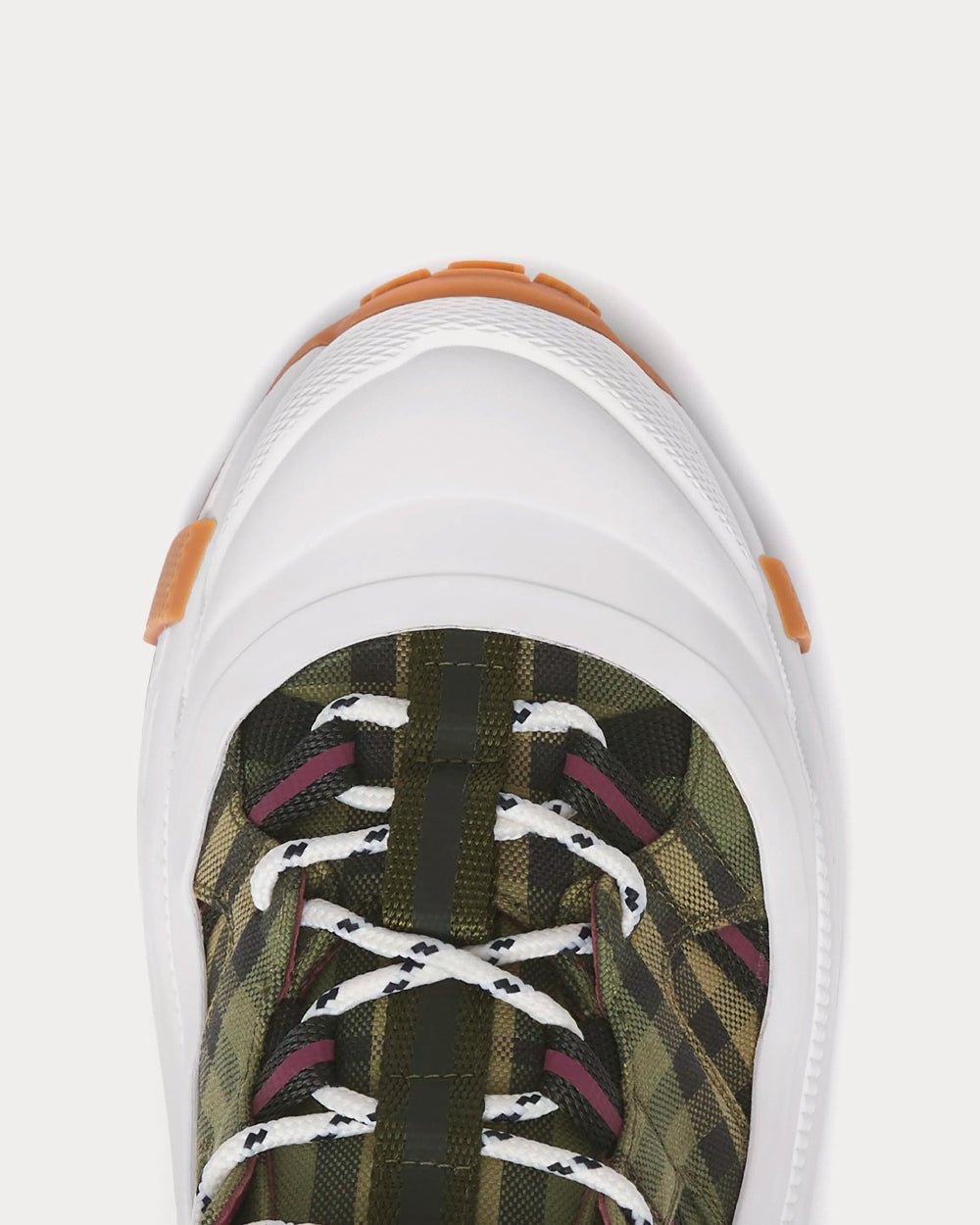 Notre sneaker de défilé est confectionnée en coton à carreaux avec des finitions en cuir. Elle est ornée d’un sur-chaussure mat inspiré des bottes de pluie et d’une semelle à détails croisés faisant référence à notre emblématique motif à carreaux.