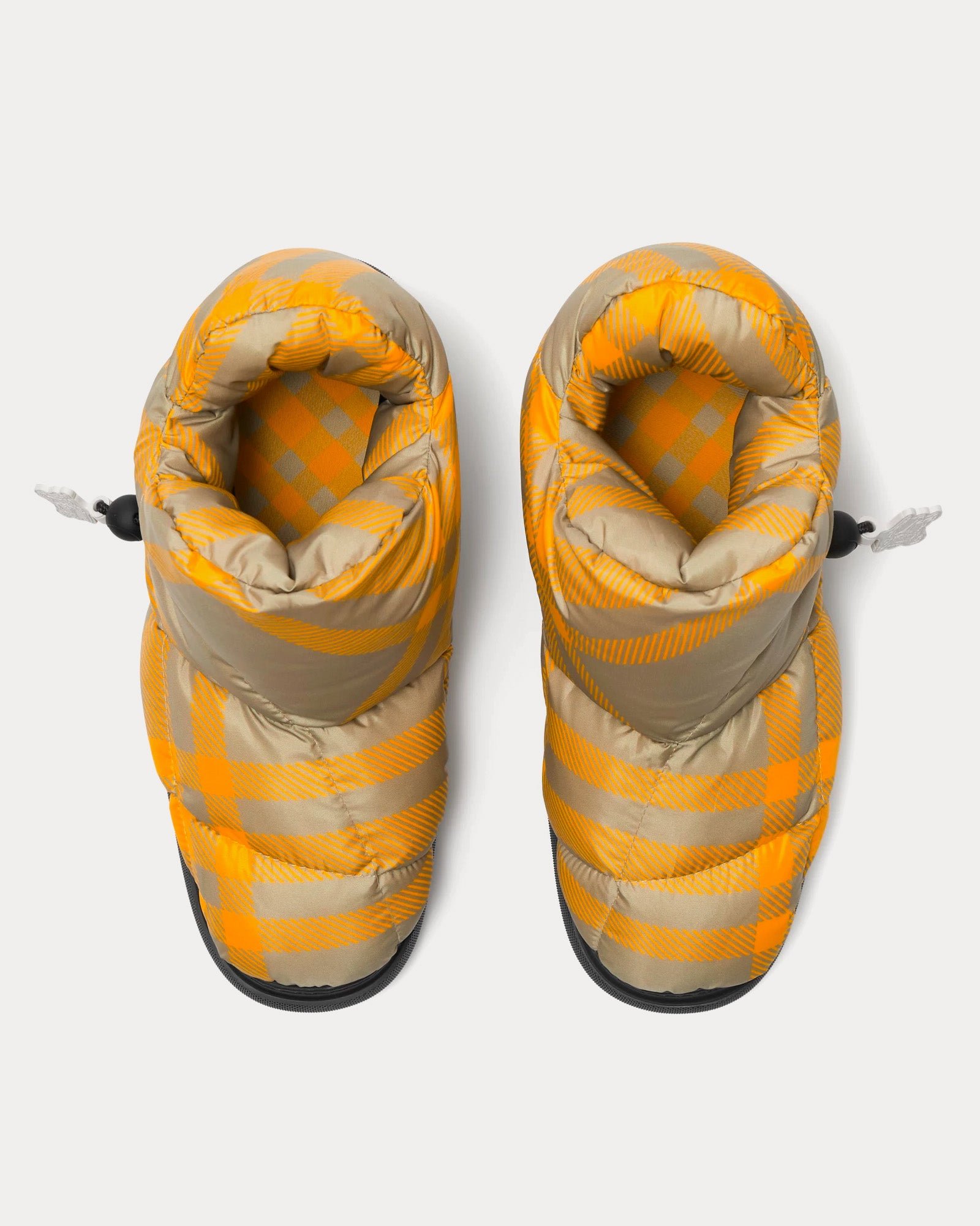 Les bottines basses BurberryCheck Pillow pour femmes en jaune sont dotées de fermetures à cordon, de bouts arrondis, de semelles intérieures Burberry Check, d’un lettrage Burberry sur les semelles et d’étiquettes Equestrian Knight Design.