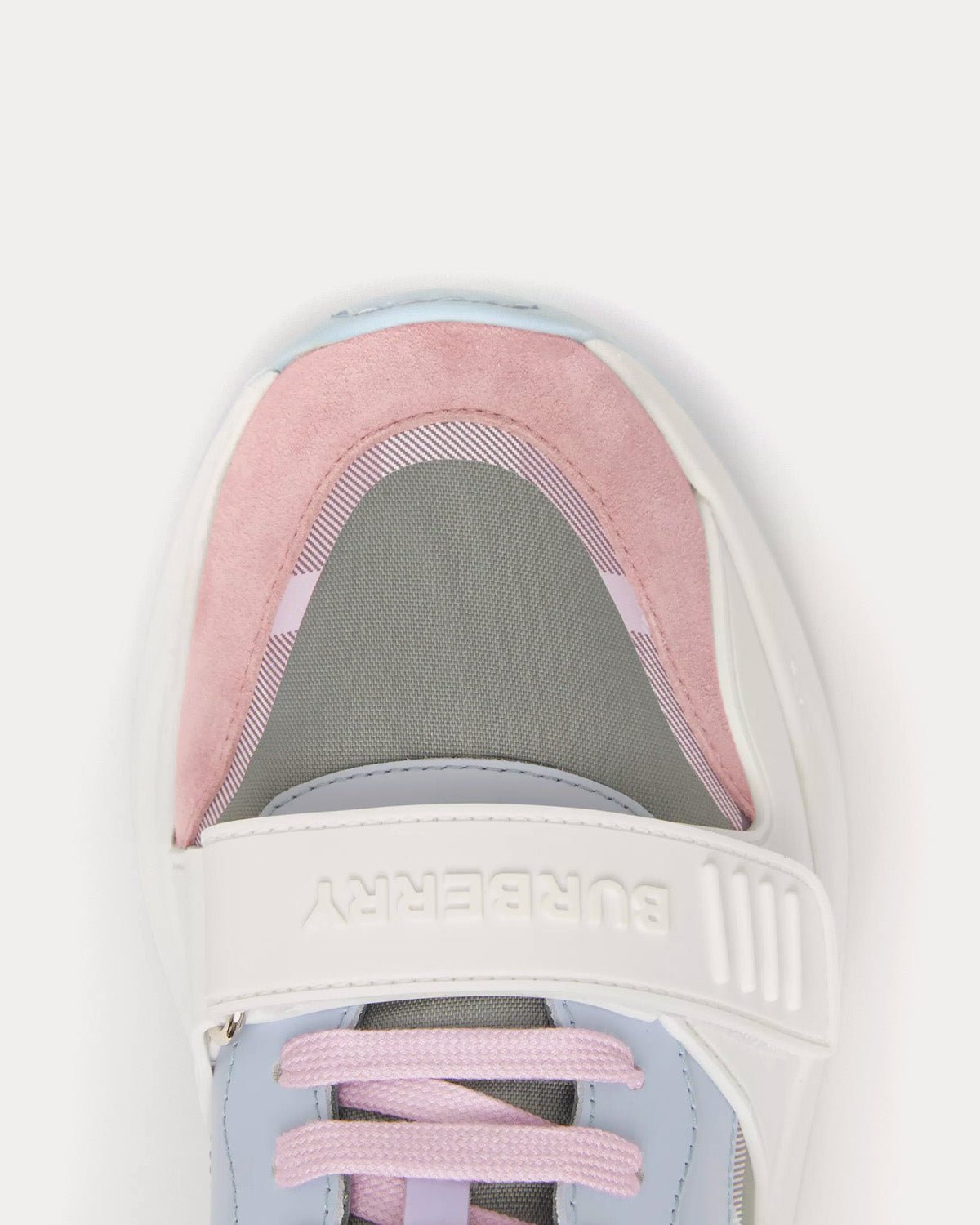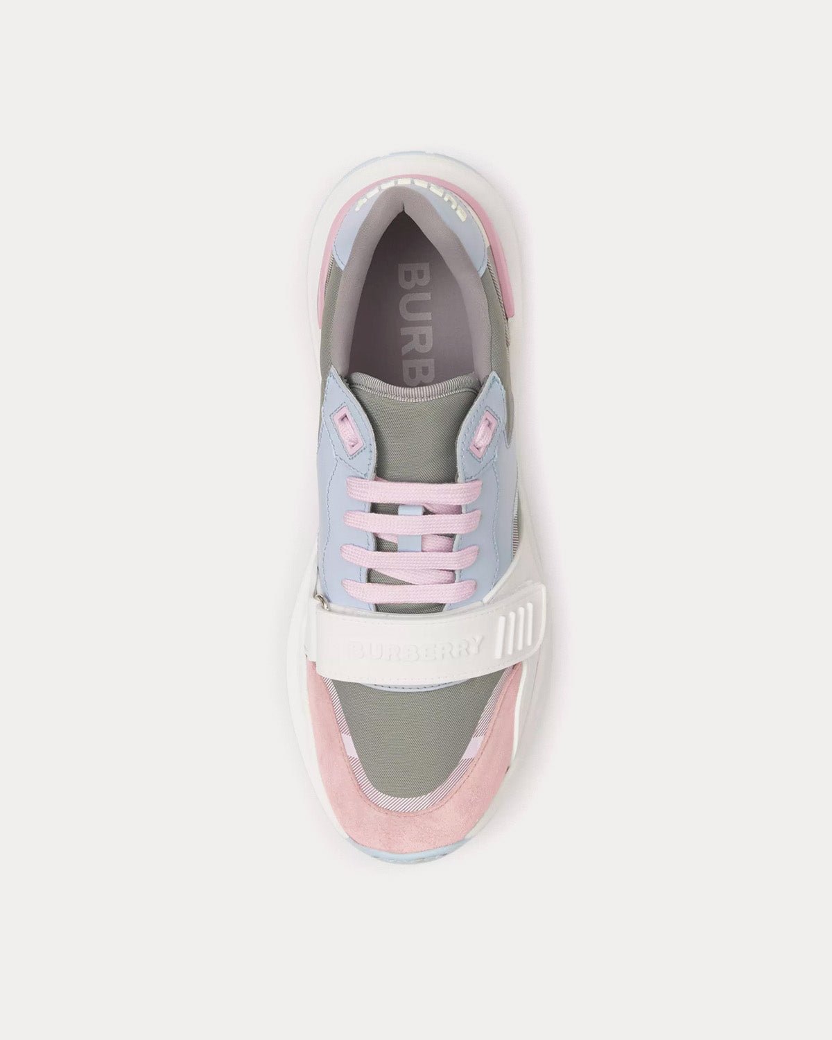 Baskets épaisses Burberry revisitées en cuir, daim et nylon à carreaux. Elles reposent sur une semelle incurvée accentuée et ornées de notre logo.