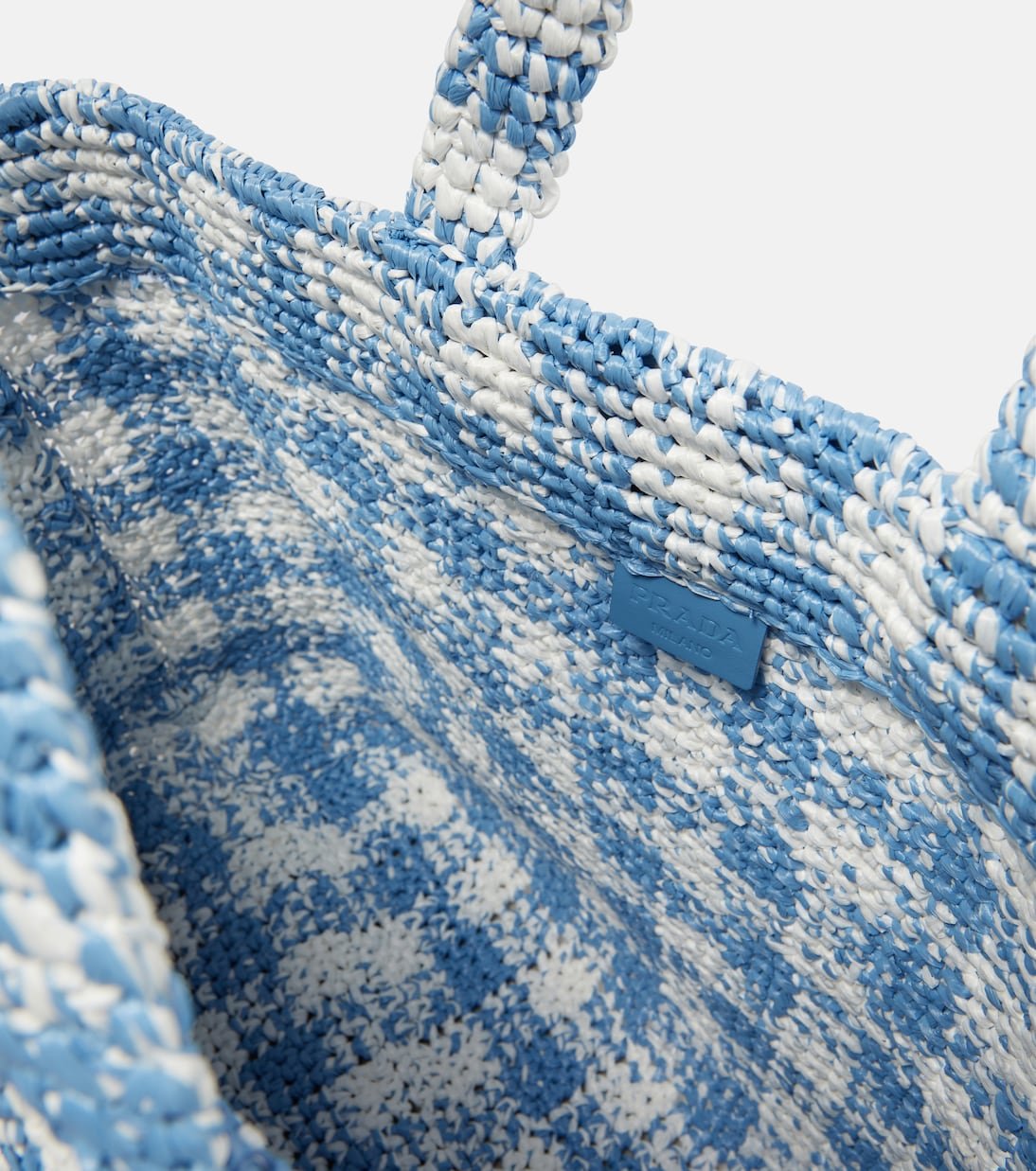 Ce cabas à effet raphia de Prada sera le compagnon idéal de vos journées décontractées. Il présente un tissage ajouré et est surmonté d’un triangle brodé du logo de la maison sur le devant.