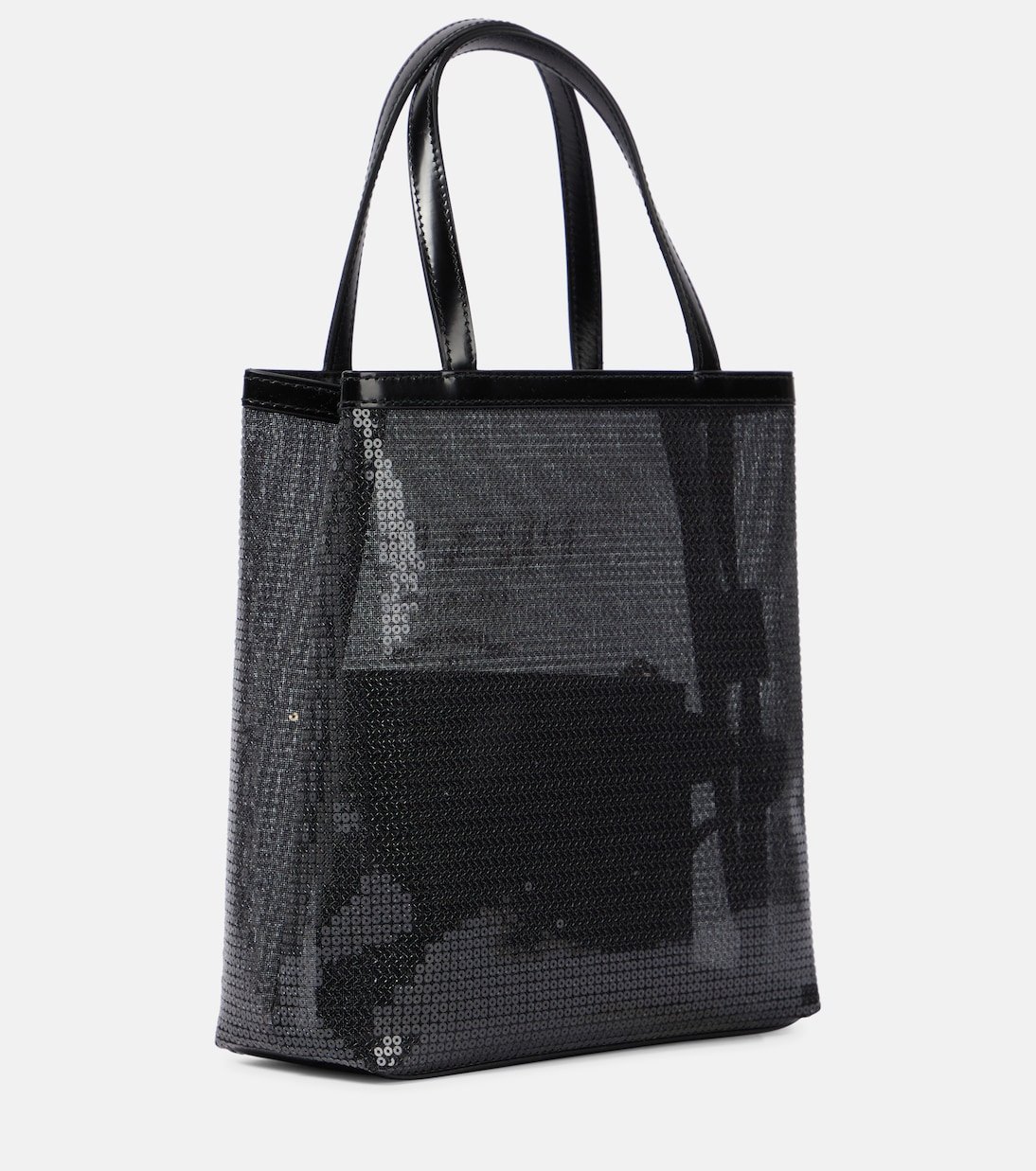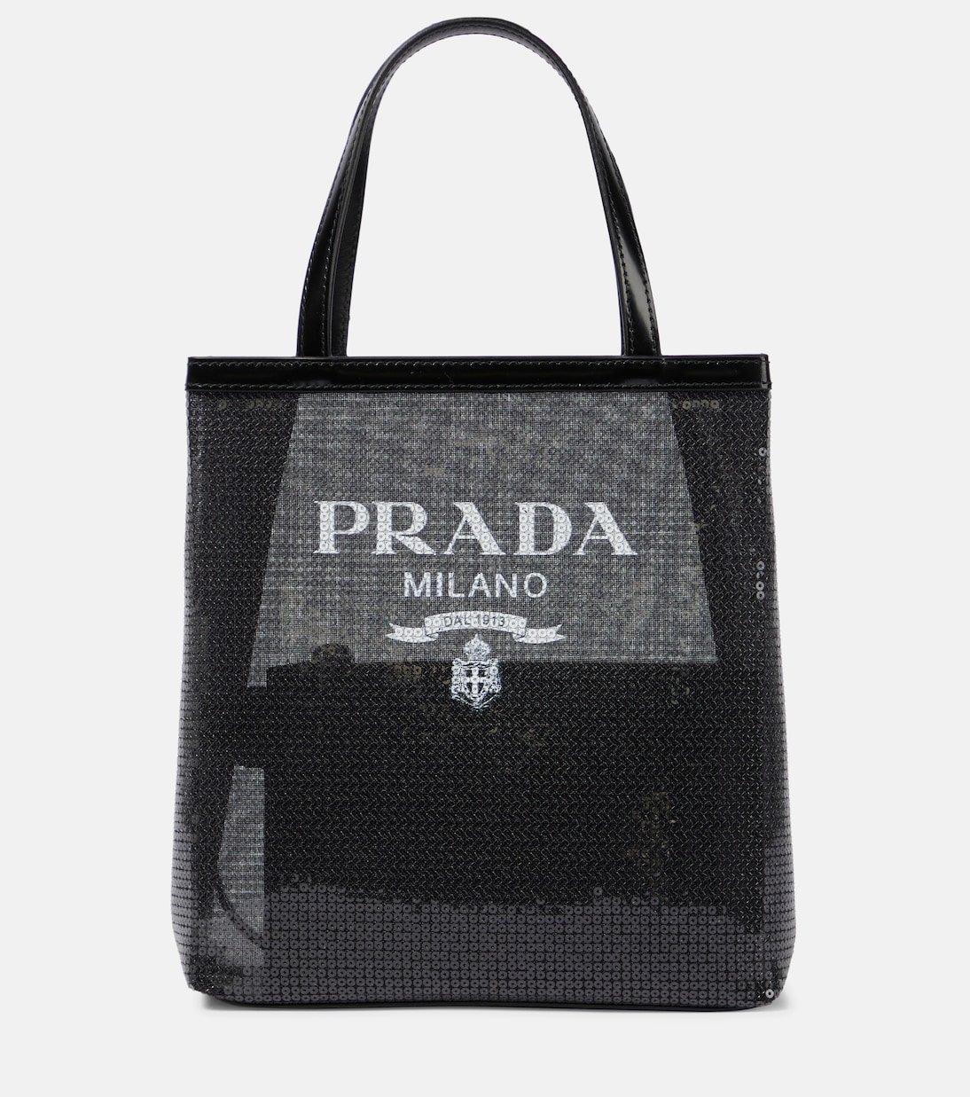 Prada relève un essentiel minimaliste de sa touche luxueuse avec le cabas en résille Small. Ce modèle semi-transparent recouvert de sequins noirs est imprimé du logo de la maison et possède une pochette intérieure zippée.