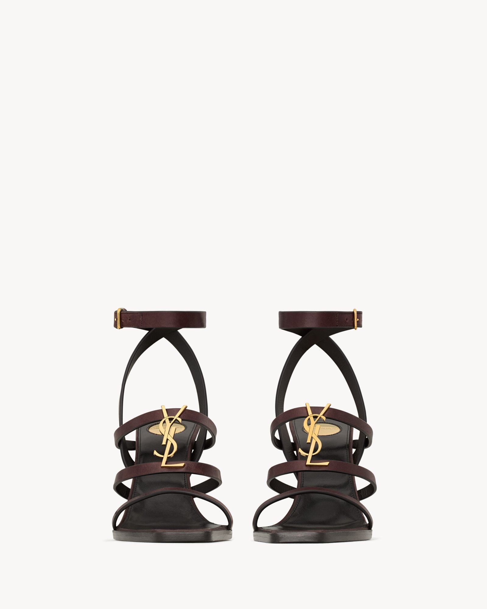 Sandales munies de brides multiples, d’un bout carré et d’un talon compensé recouvert, ornées du CASSANDRE et d’une bride cheville ajustable.