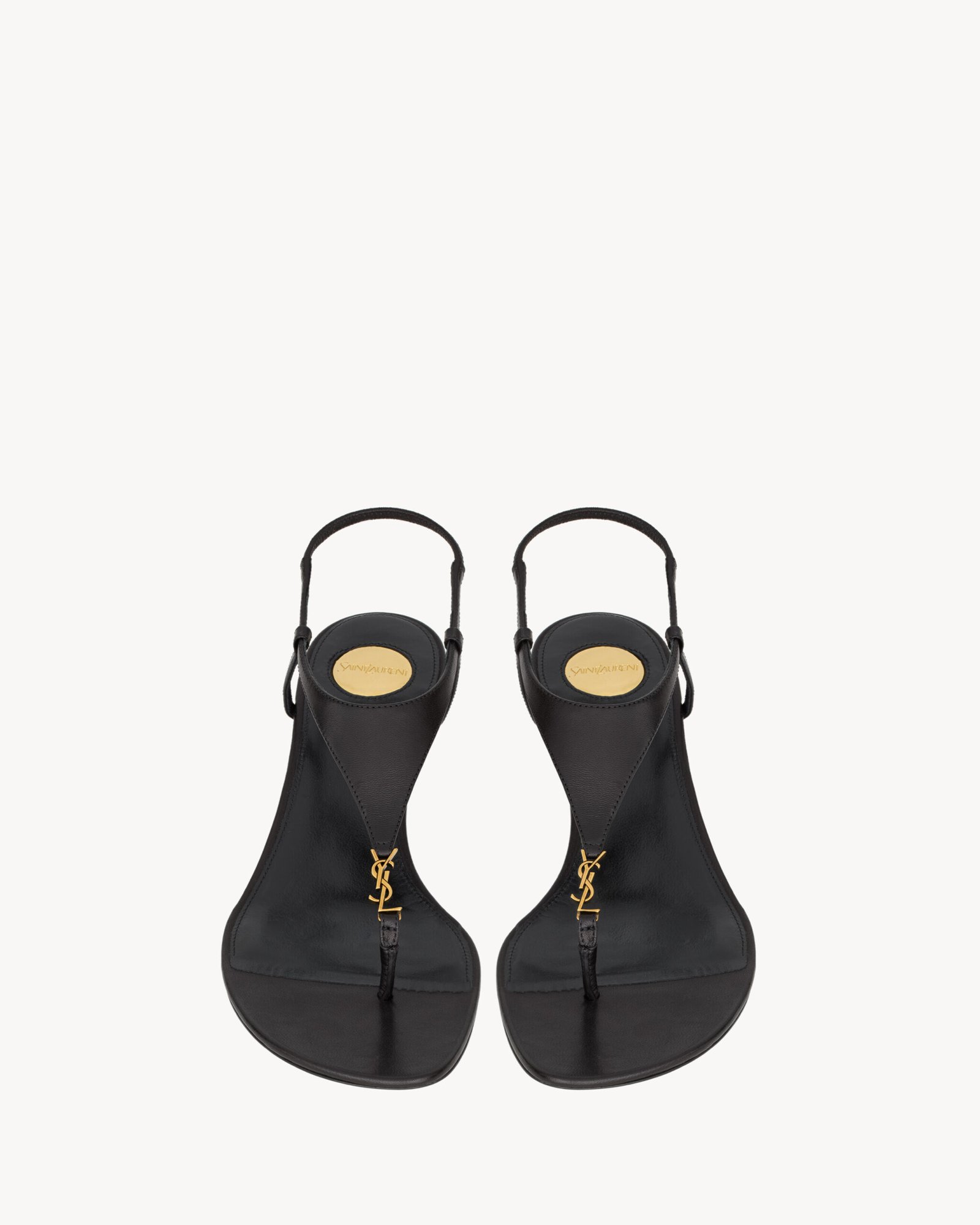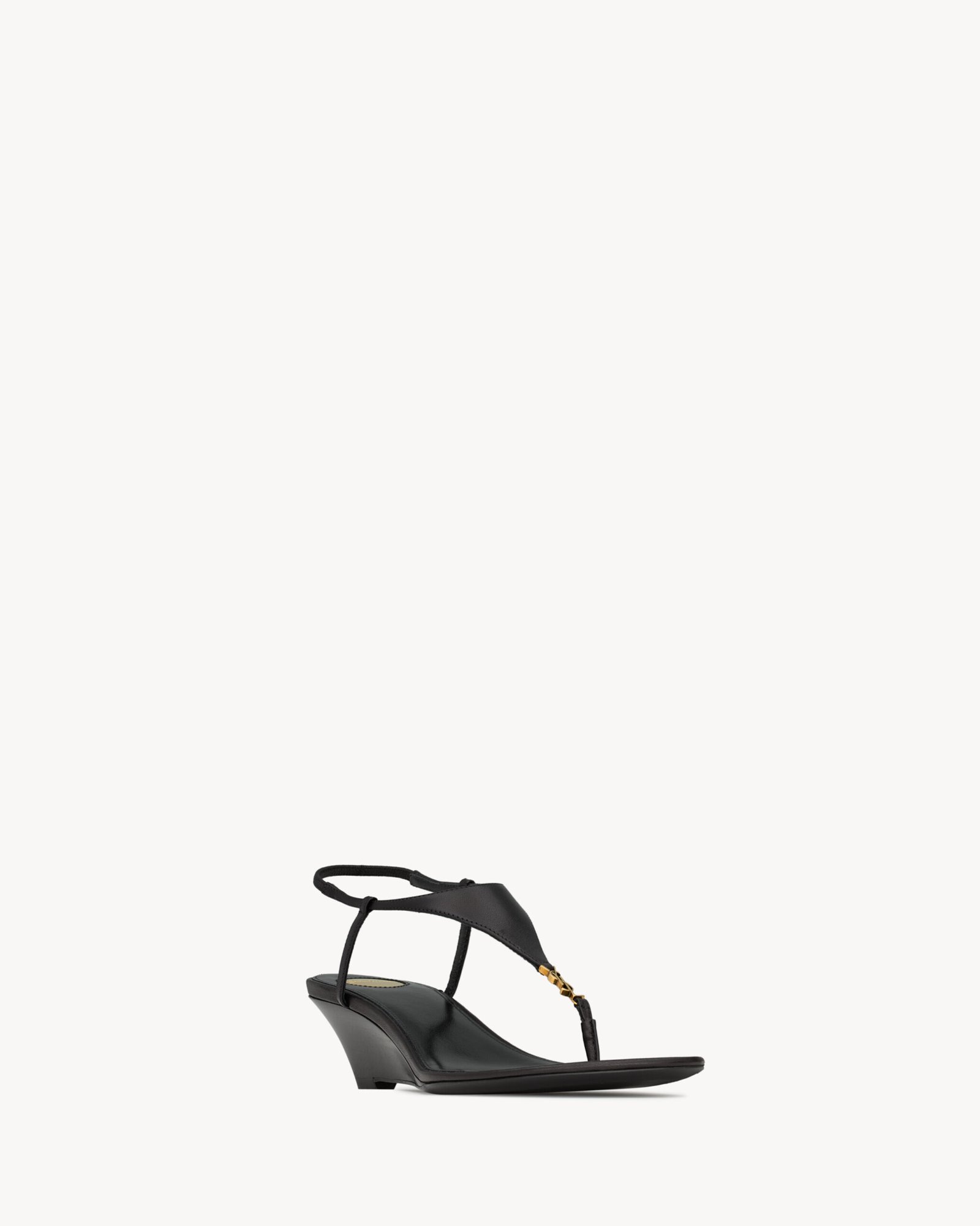 Sandales à talon compensé munies d’une tige triangulaire ornées d’un CASSANDRE en métal, d’une bride cheville élastique et d’un bout en amande.
