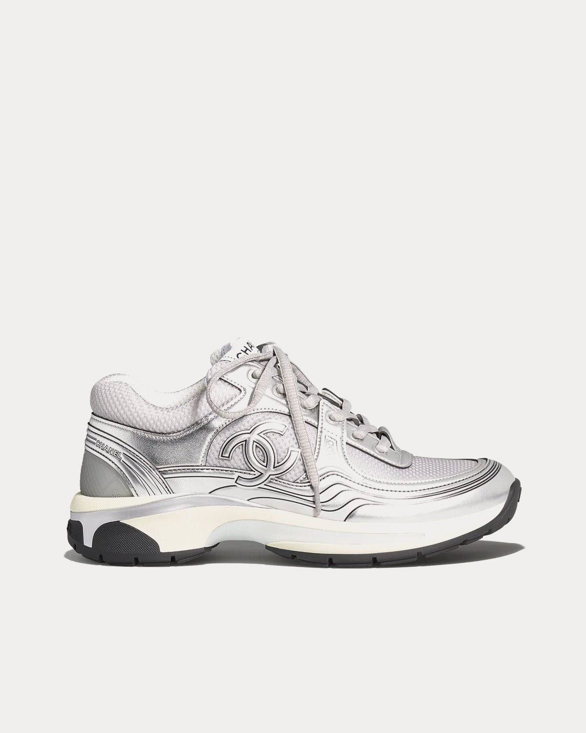 Baskets Chanel en tissu et laminé gris clair et argenté de la collection Croisière 2022/23. Disponibles uniquement dans les boutiques Chanel.