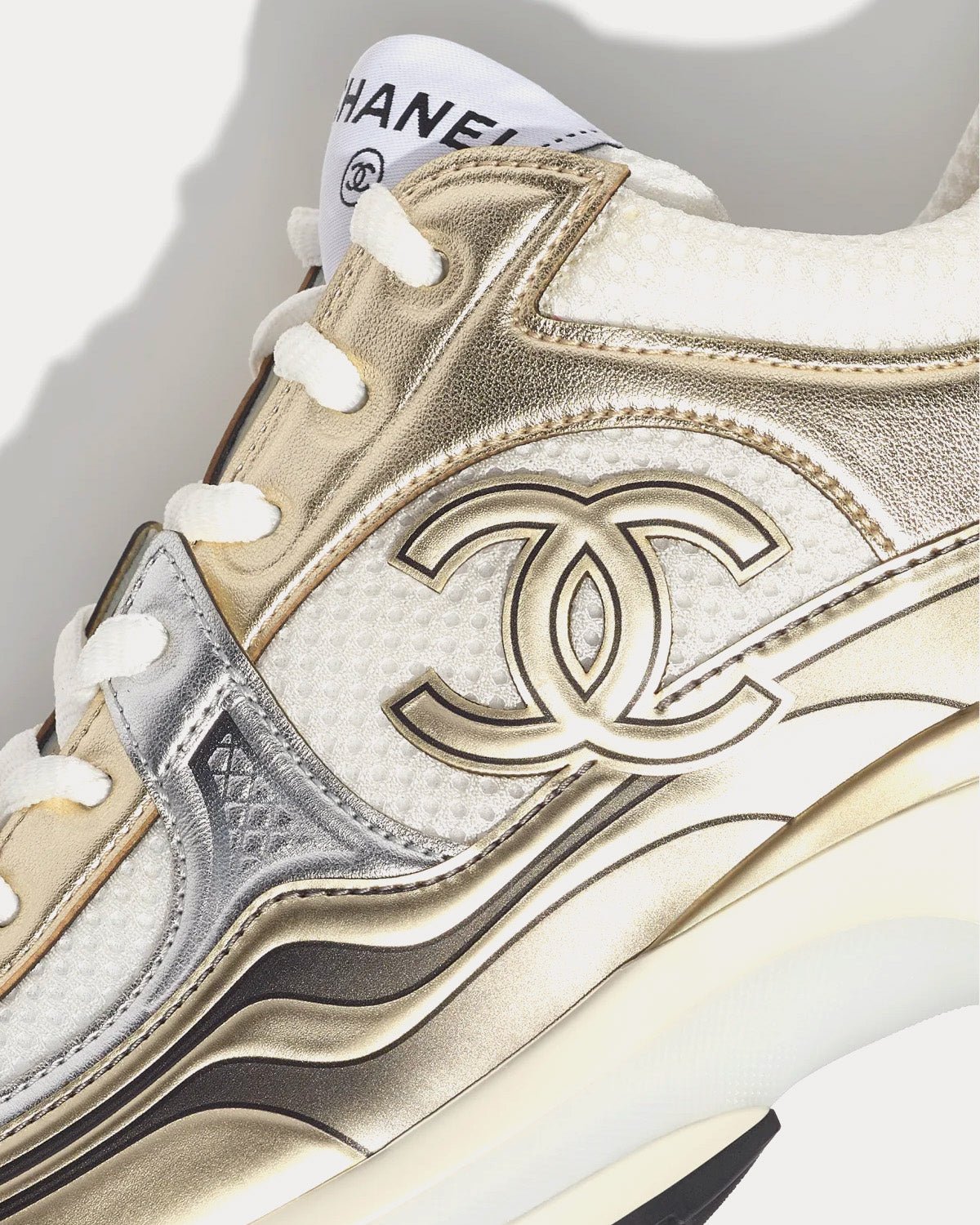 Baskets basses Chanel en tissu et laminé blanc, doré et argenté