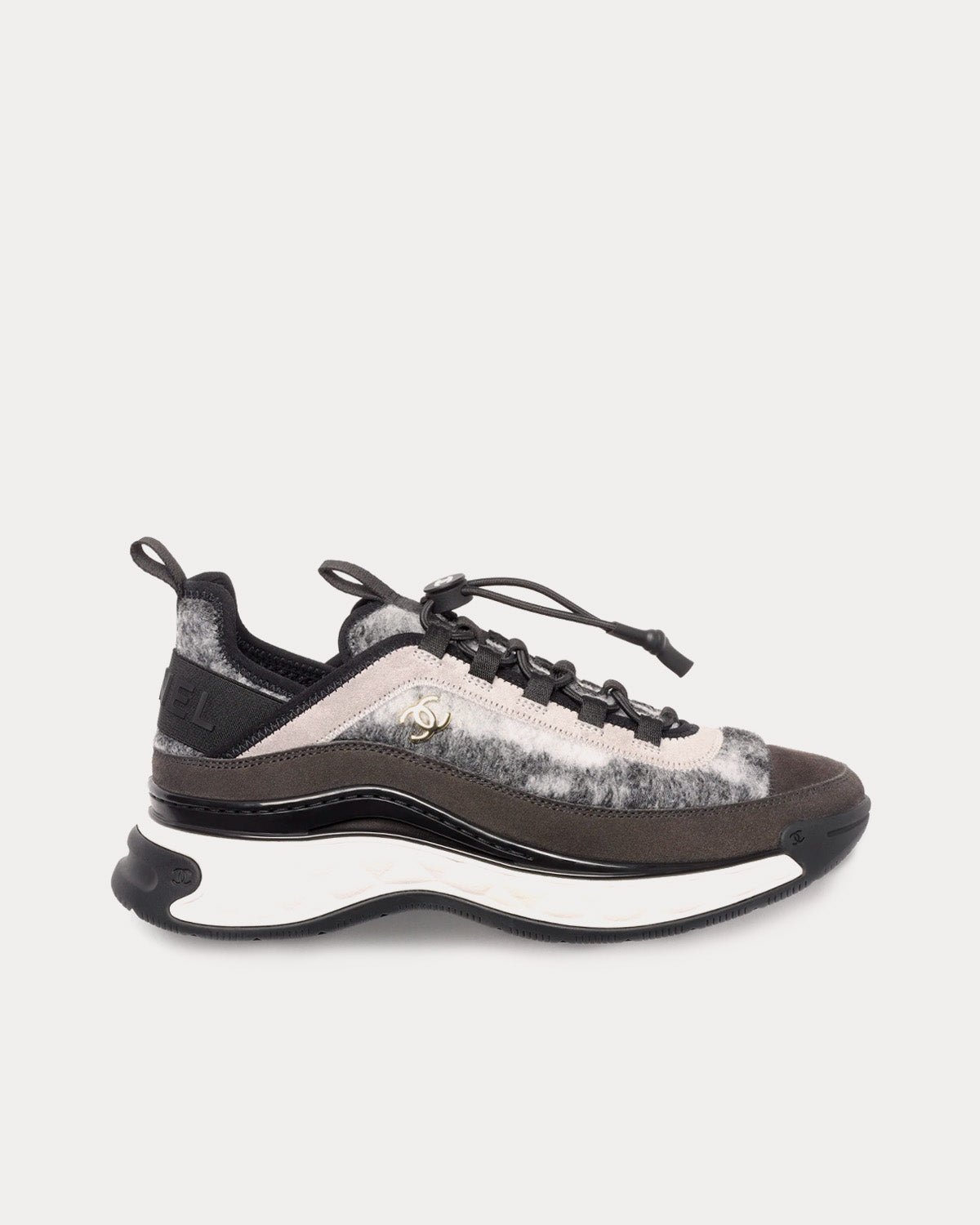Baskets Chanel en cuir de veau velours et tissu gris/gris foncé/gris clair. Collection automne-hiver 2022/23. Disponibles exclusivement dans les boutiques Chanel du monde entier.