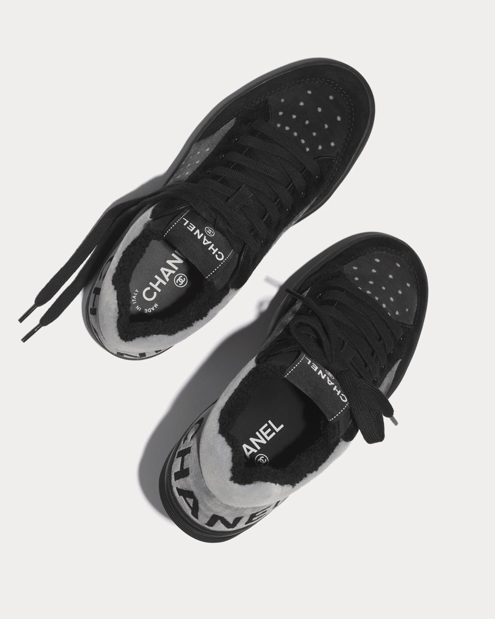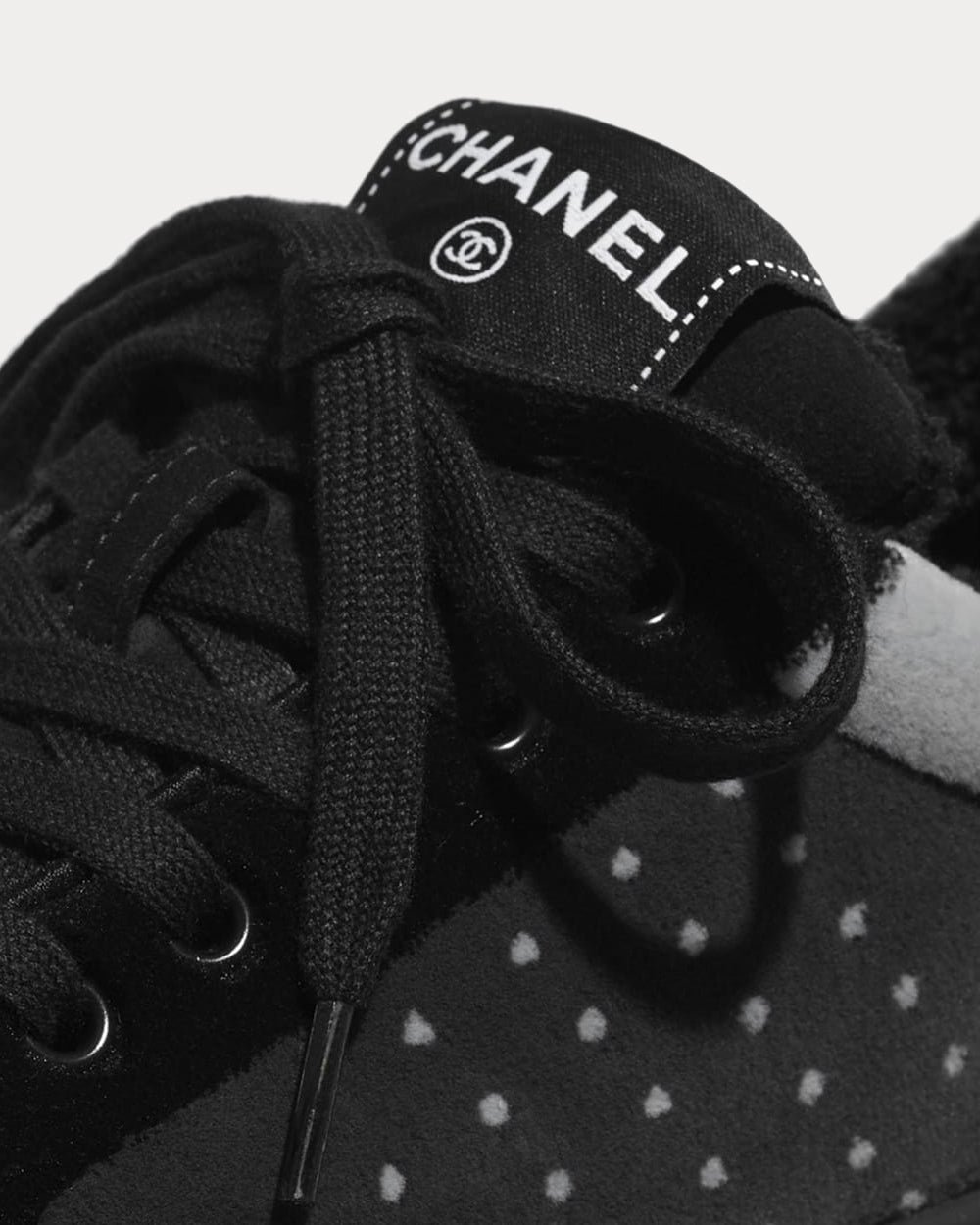 Les baskets basses Chanel en cuir de veau tissu et daim sont issues de la pré-collection automne-hiver 2021/22 et sont disponibles dans les boutiques Chanel dans un coloris gris.