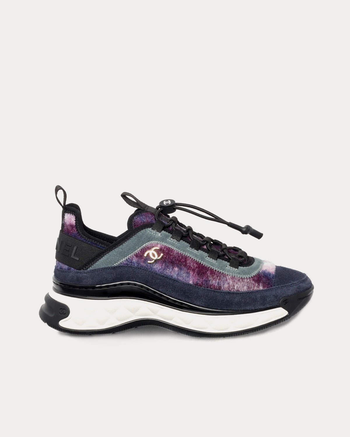 Baskets Chanel en cuir de veau velours et tissu violet/bleu foncé/gris. Collection automne-hiver 2022/23. Disponibles exclusivement dans les boutiques Chanel du monde entier.