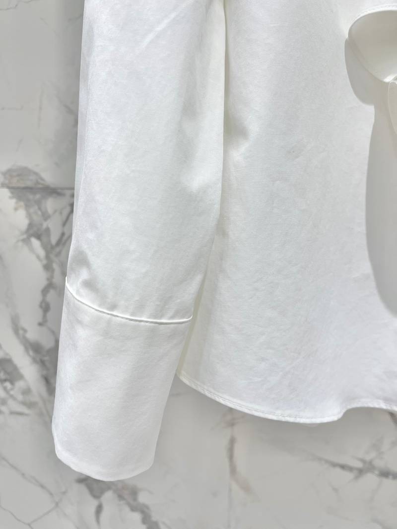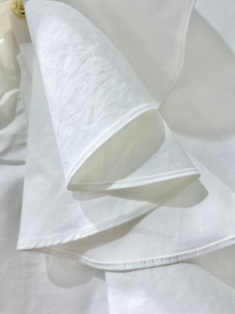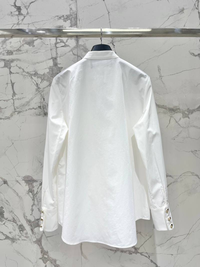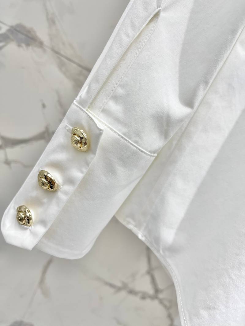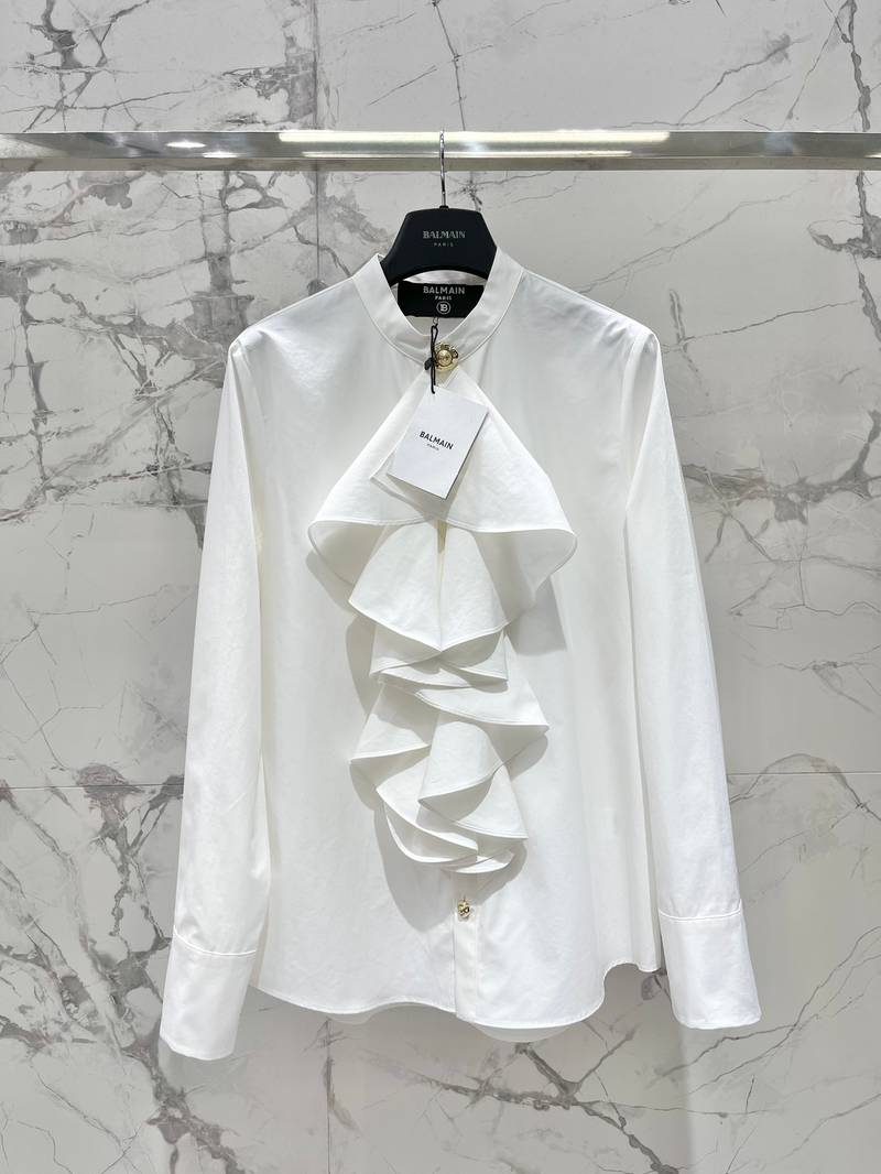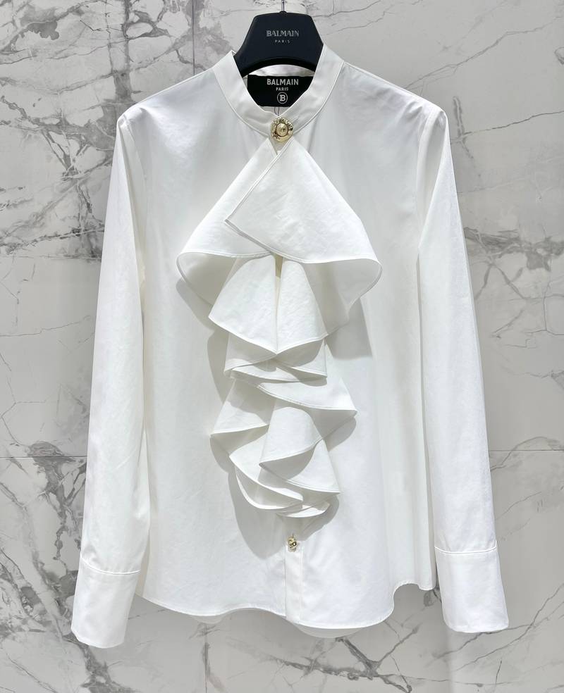Chemise Balmain blanche élégante avec volants couture et boutons dorés signature pour un style chic et sophistiqué.