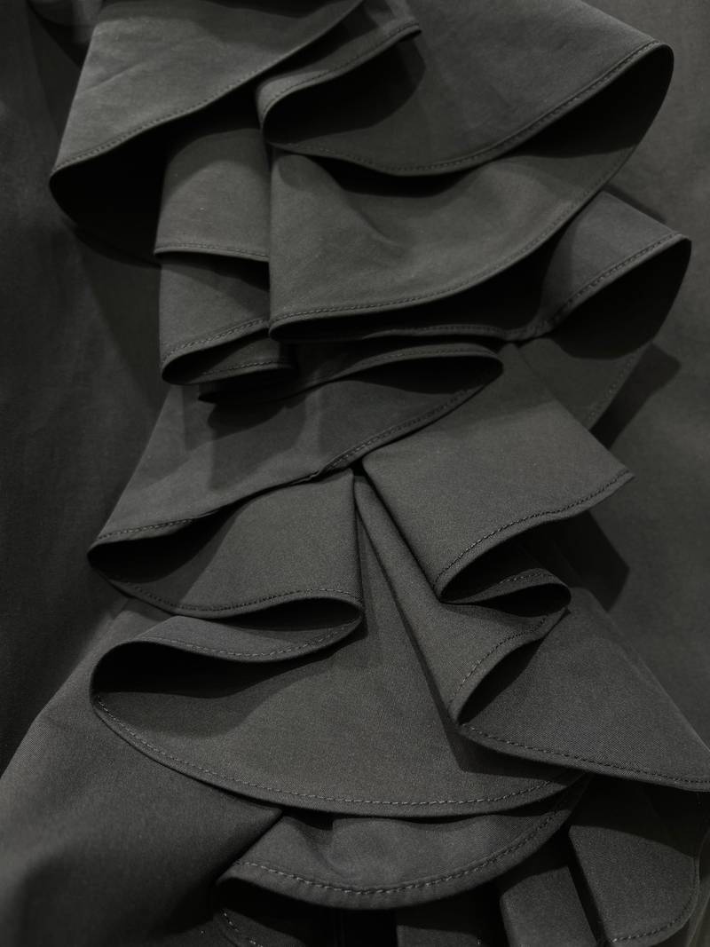 Son design se distingue par une cascade de volants majestueux sur le devant, apportant du volume et une allure couture immédiatement reconnaissable. Le col montant est sublimé par un bouton bijou doré signature, ajoutant une touche luxueuse et raffinée.