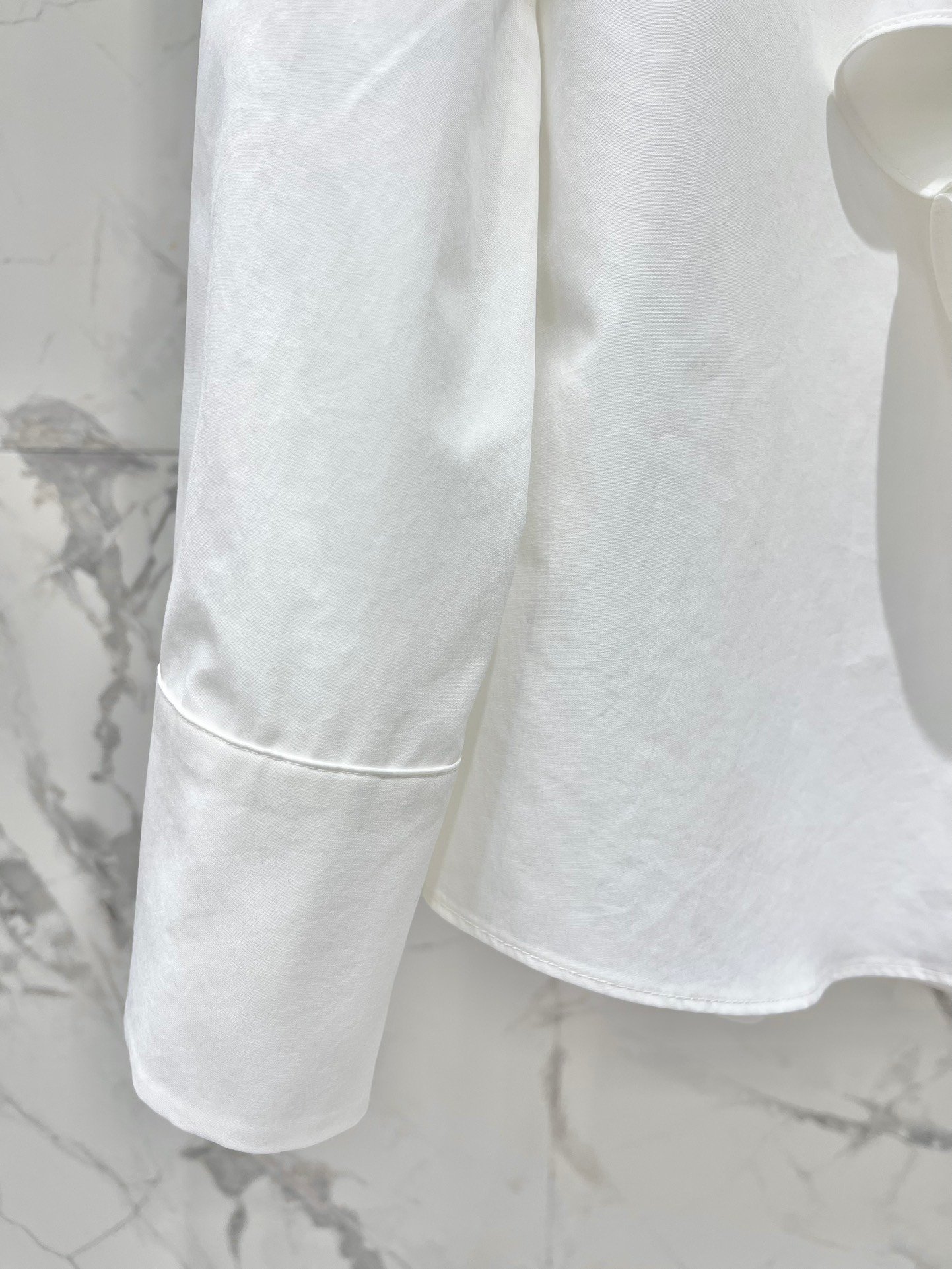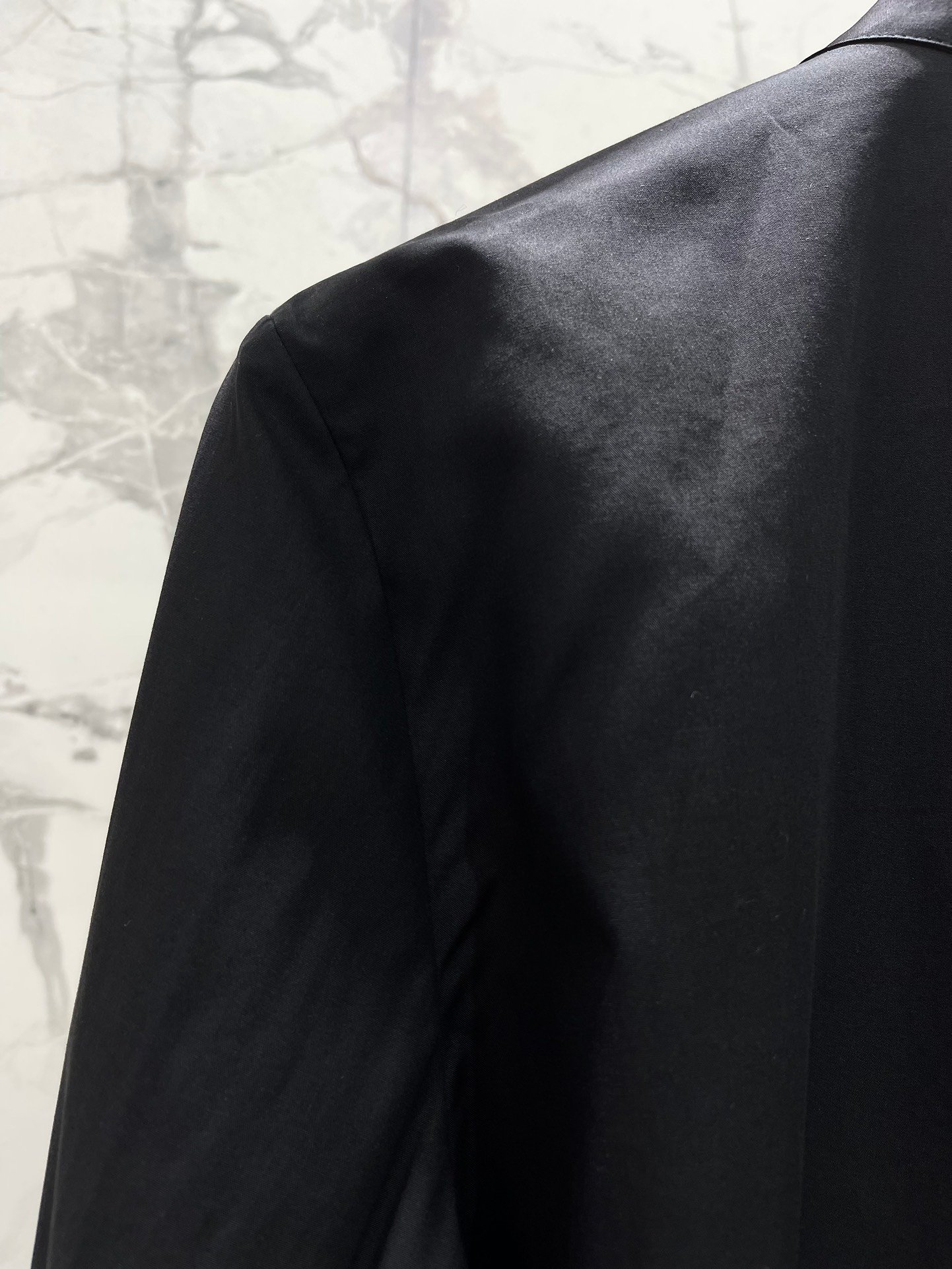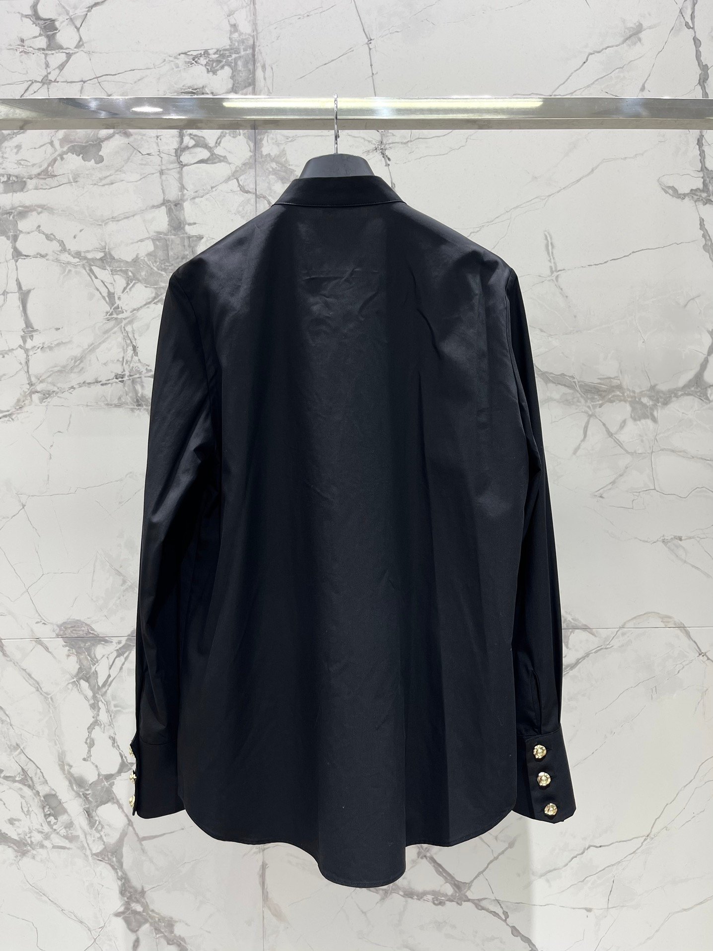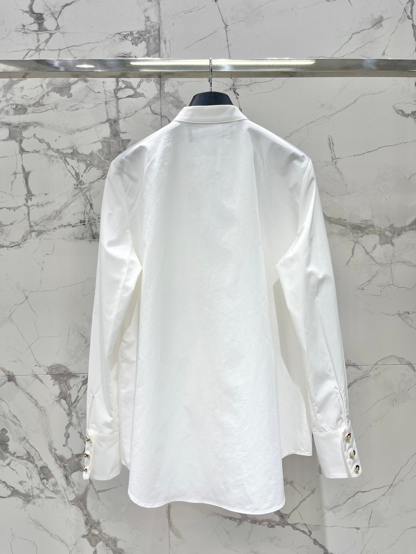 Les poignets sont également ornés de boutons dorés travaillés, renforçant l’identité premium de la pièce. Sa coupe fluide et légèrement structurée épouse parfaitement la silhouette tout en garantissant un confort optimal.