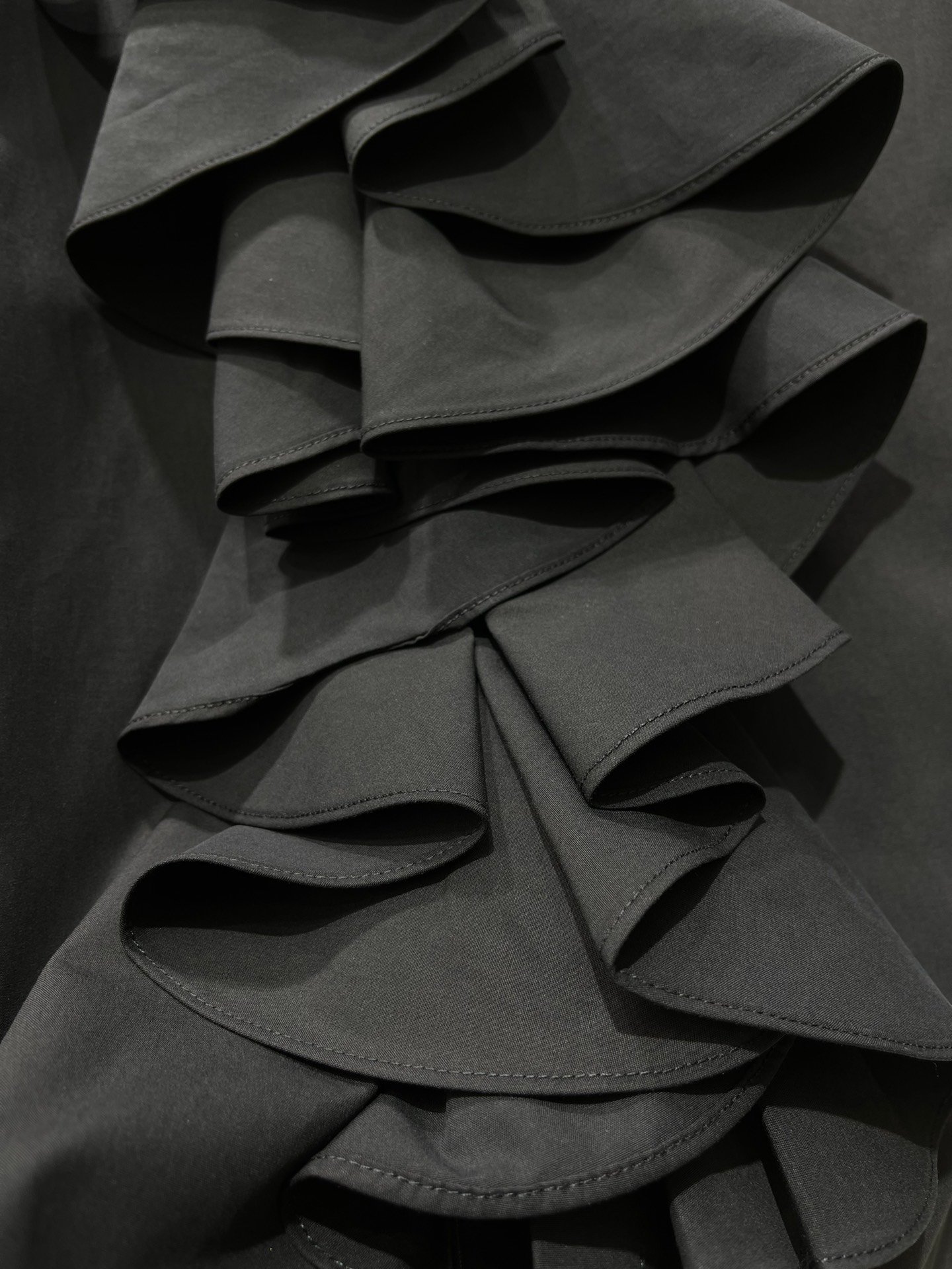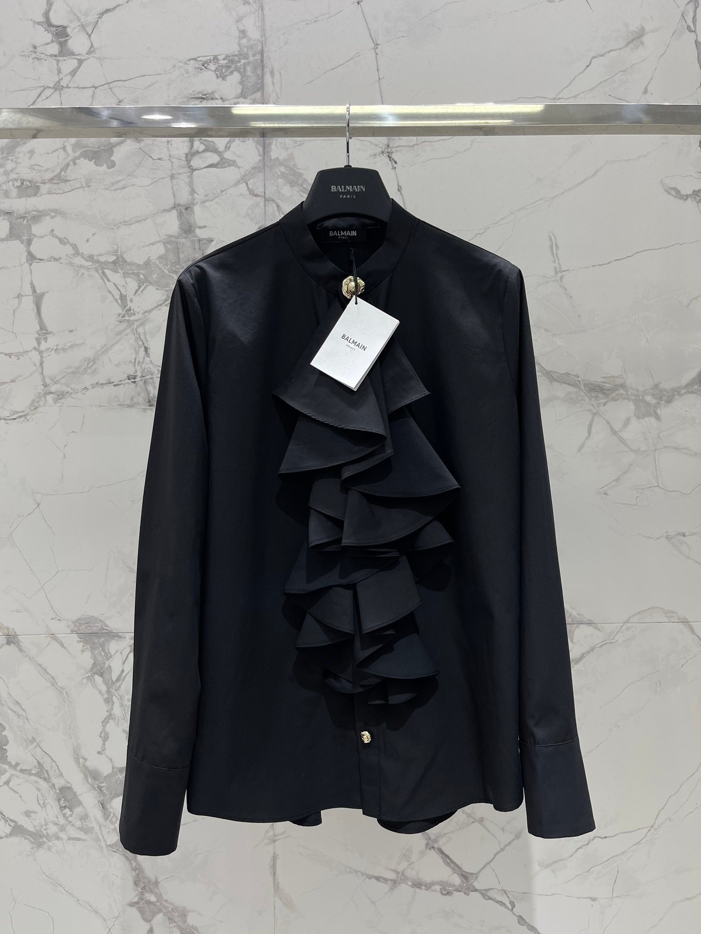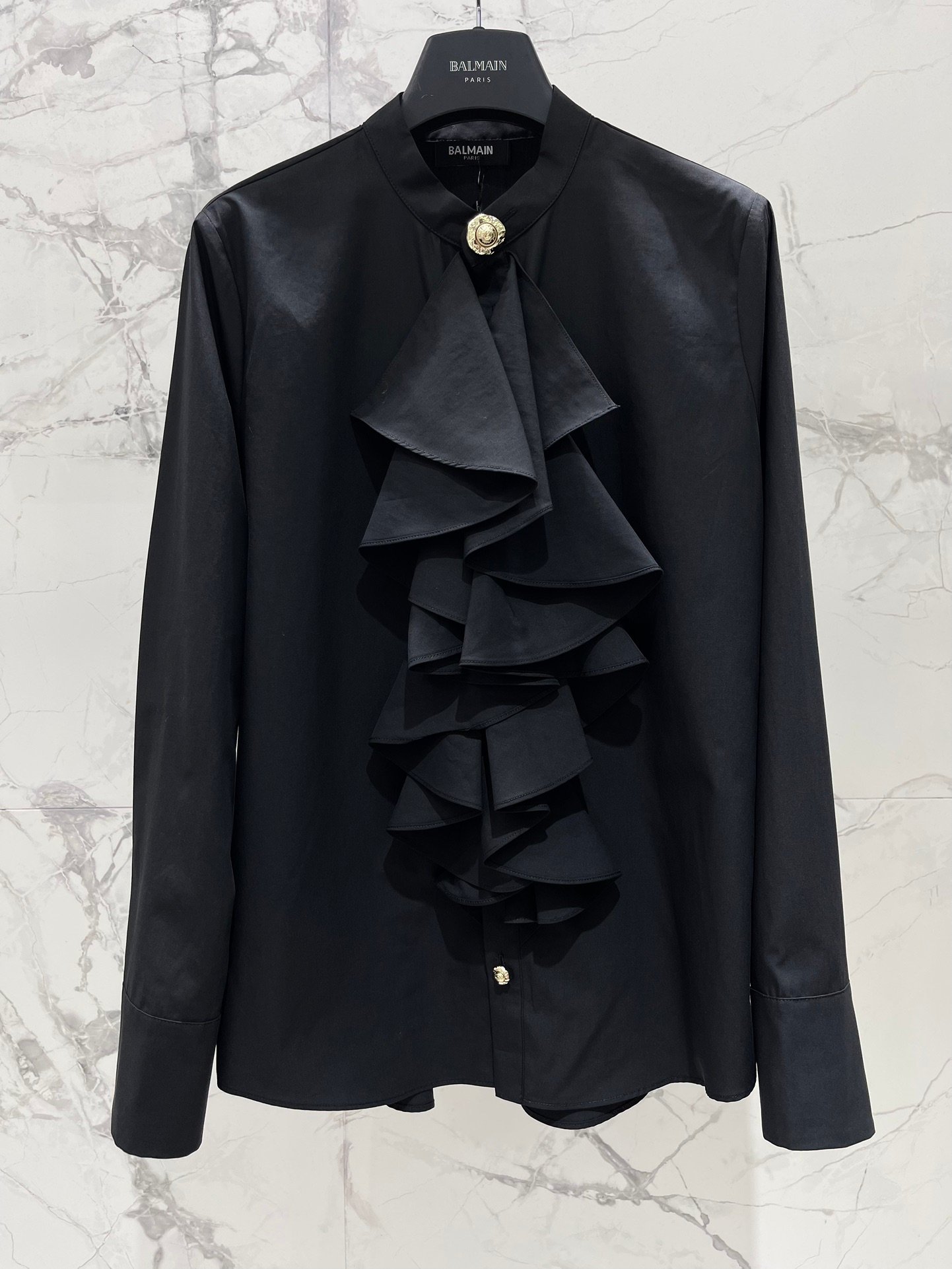 Son design se distingue par une cascade de volants majestueux sur le devant, apportant du volume et une allure couture immédiatement reconnaissable. Le col montant est sublimé par un bouton bijou doré signature, ajoutant une touche luxueuse et raffinée.
