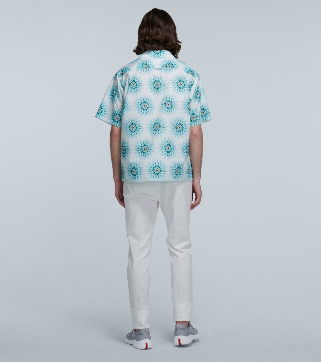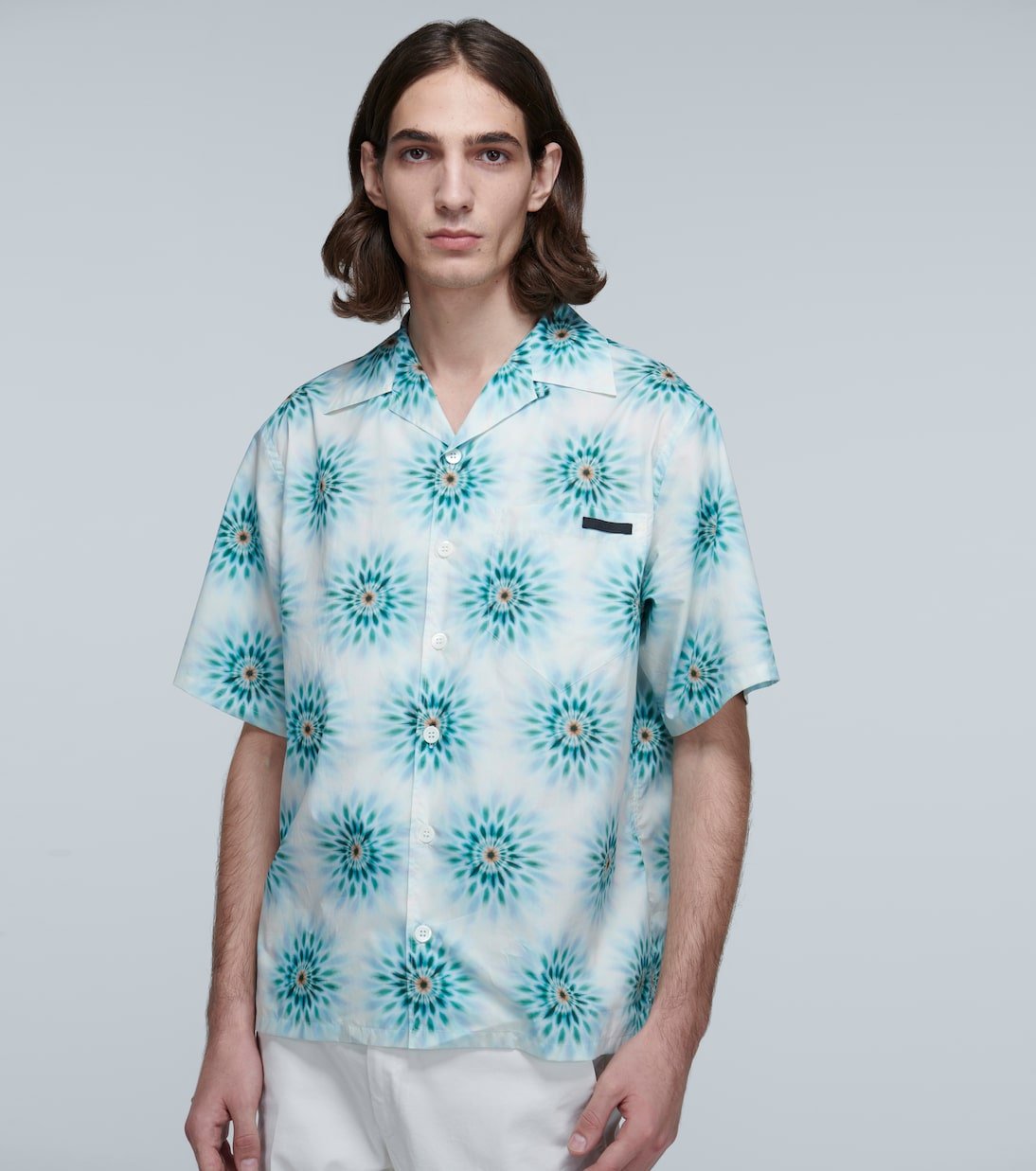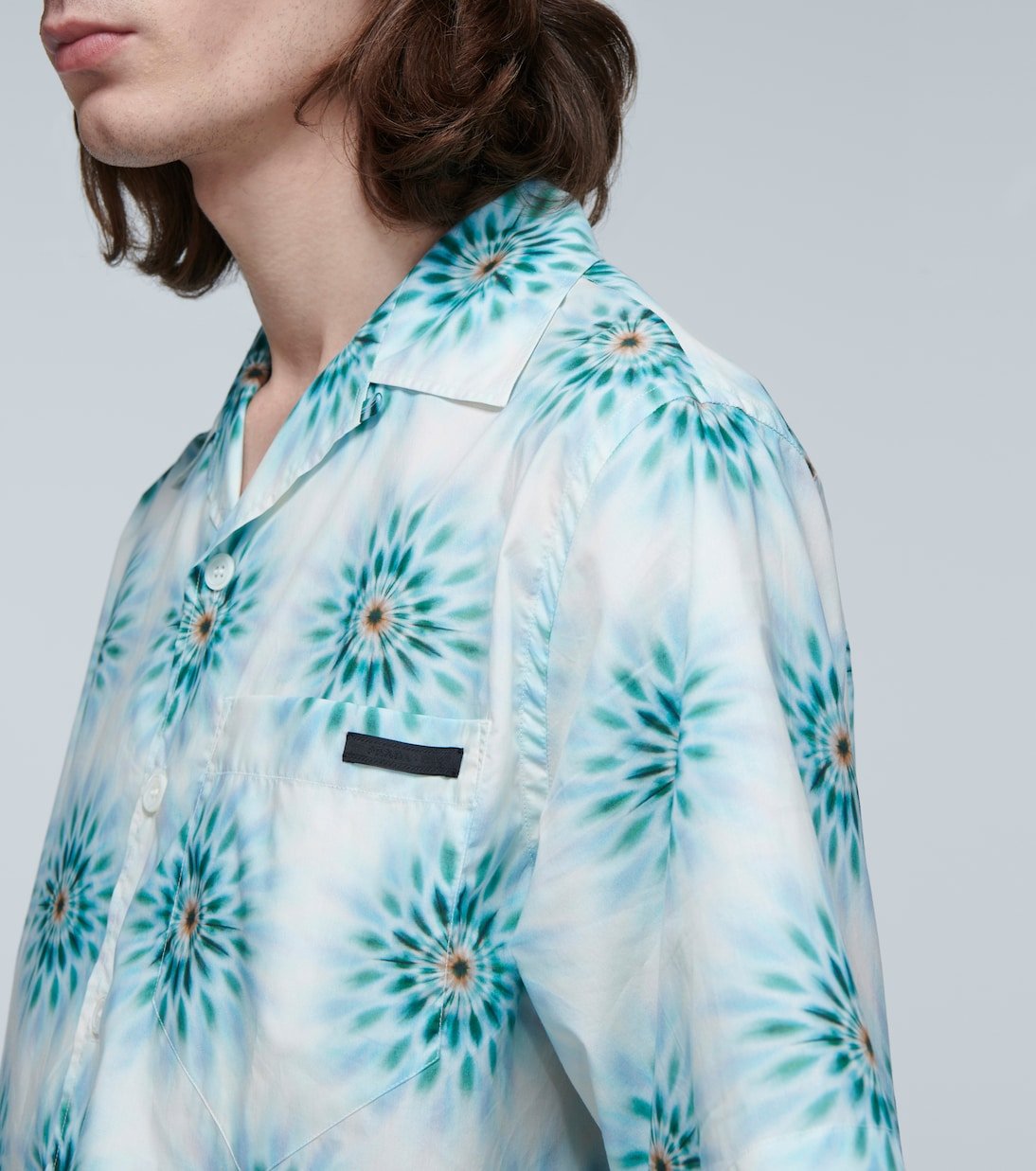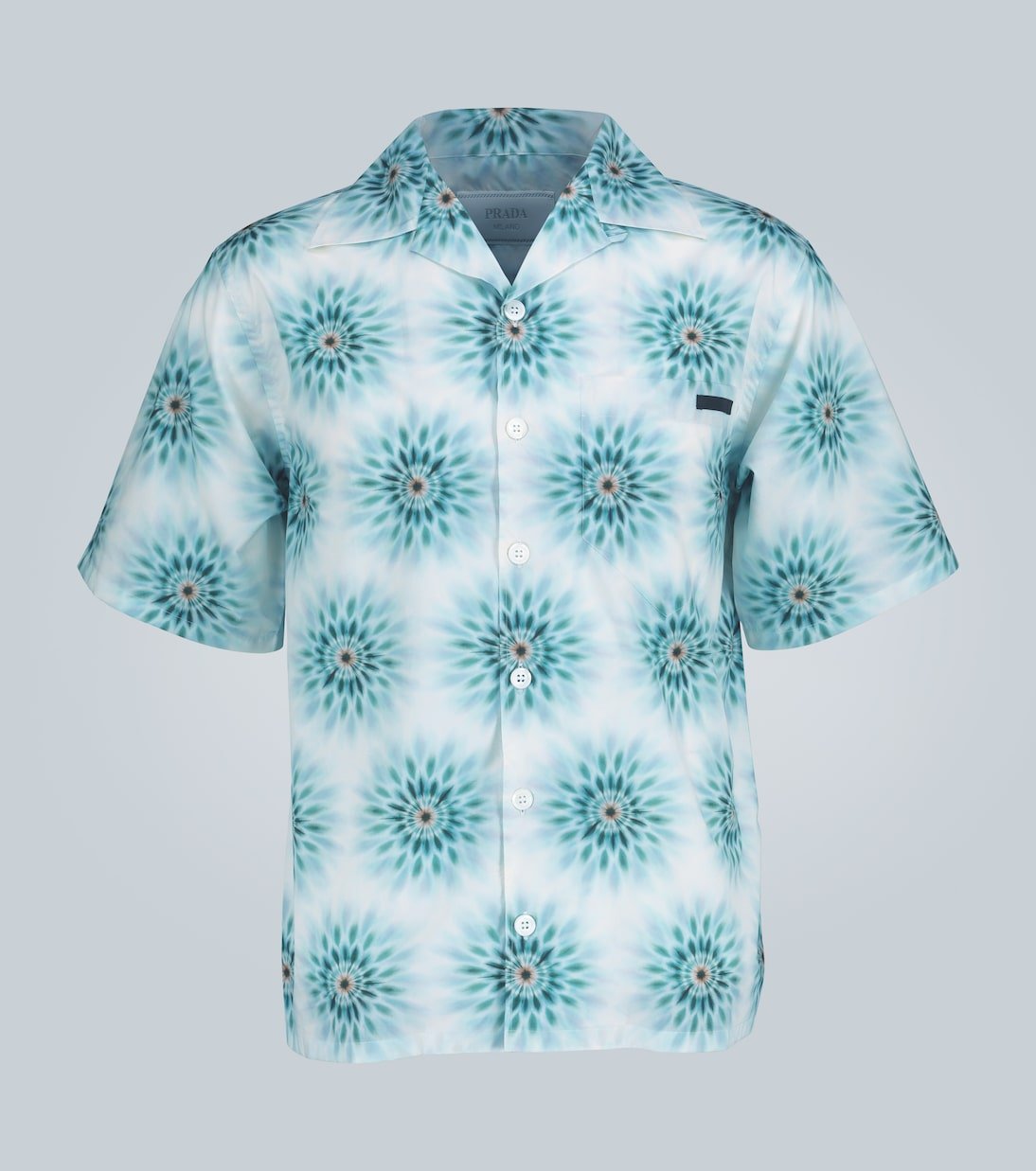 Confectionnée en Italie à base de popeline de coton, cette chemise à manches courtes de Prada présente une coupe décontractée et un imprimé dominant dans les tons bleus. Ce modèle boutonné sur le devant arbore le motif Prada en écusson sur la poche avant.