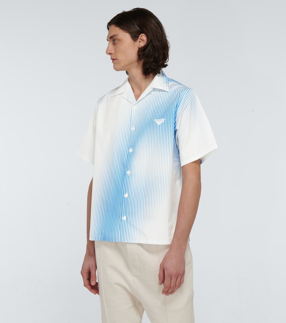 OrnĆ©e d’un imprimĆ© Ć  rayures numĆ©riques dĆ©gradĆ©es, cette chemise Ć  manches courtes blanche et bleue signĆ© Prada possĆØde un col cubain, un logo imprimĆ© sur la poitrine et une fermeture Ć  boutons en nacre.