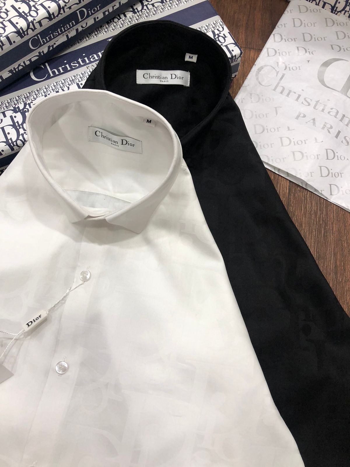 Ces élégantes chemises à manches longues sont confectionnées en coton importé teint en fil pour une coupe confortable. De coupe standard, elles sont disponibles en deux coloris : noir et blanc. Ces chemises arborent le motif n° 2023 (ARTICLE EN COURS) et sont livrées dans leur boîte d’origine et avec des boutons en relief de la même marque.