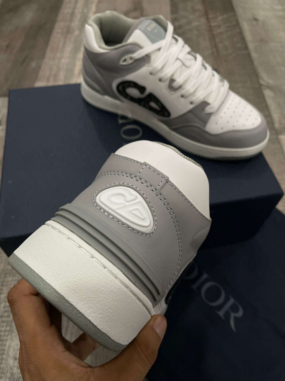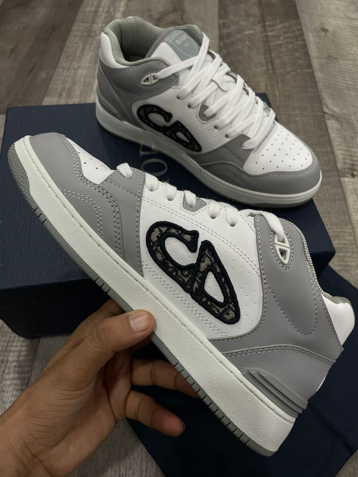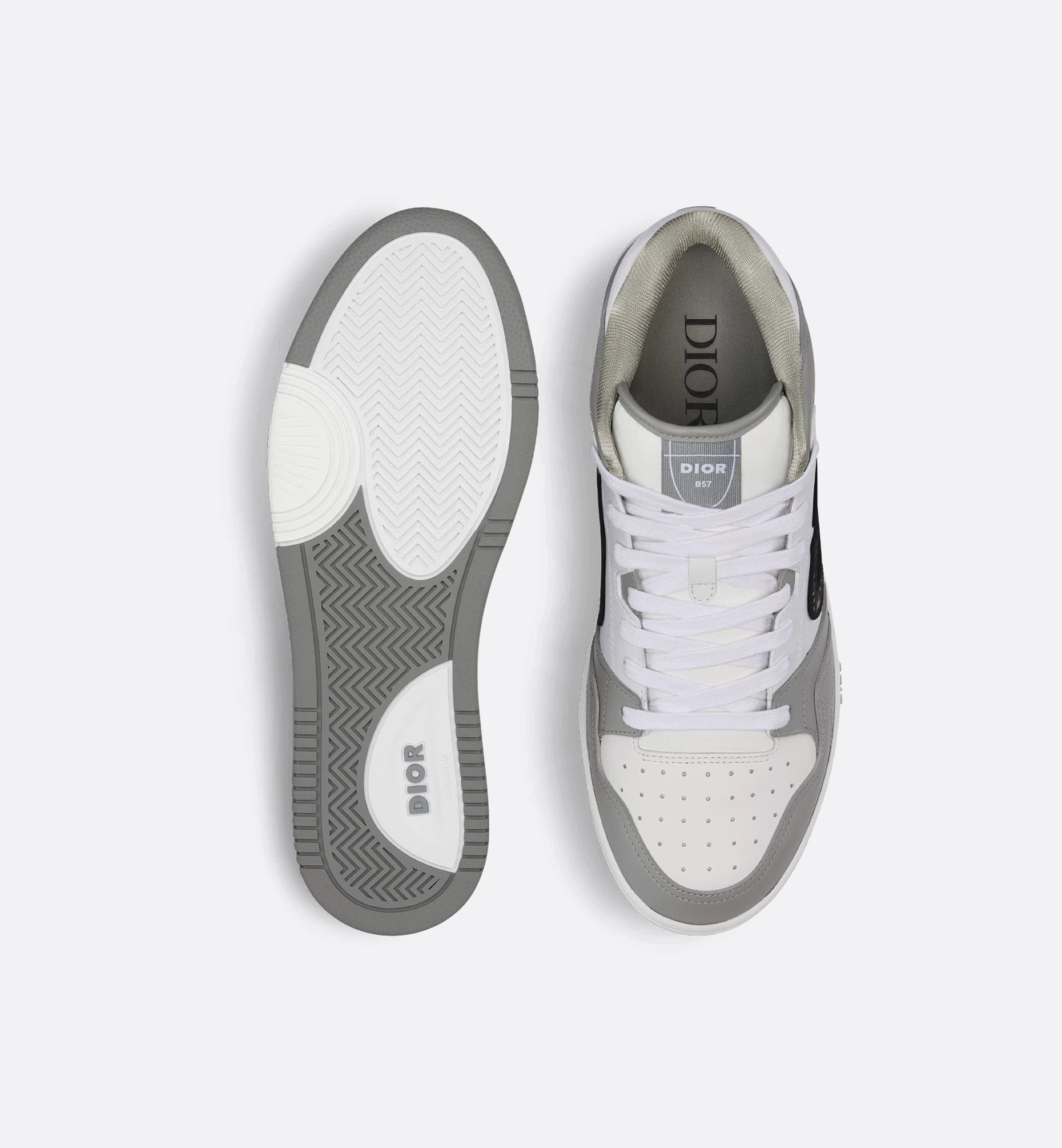 CHRISTIAN DIOR || Sneaker mi-haute en cuir de veau lisse gris et blanc; sneaker en jacquard oblique