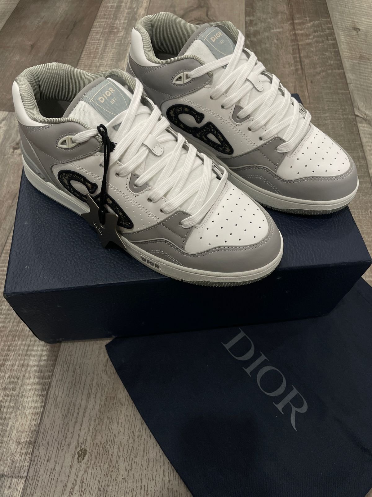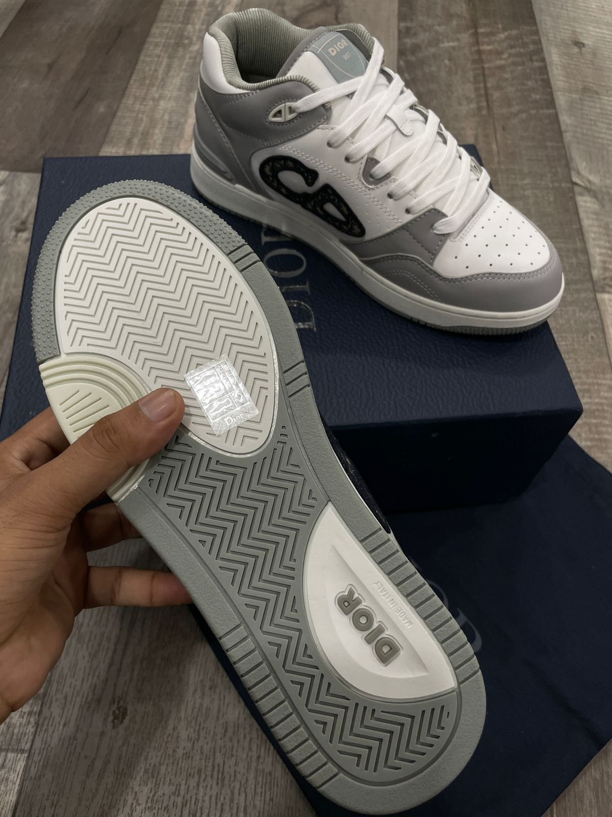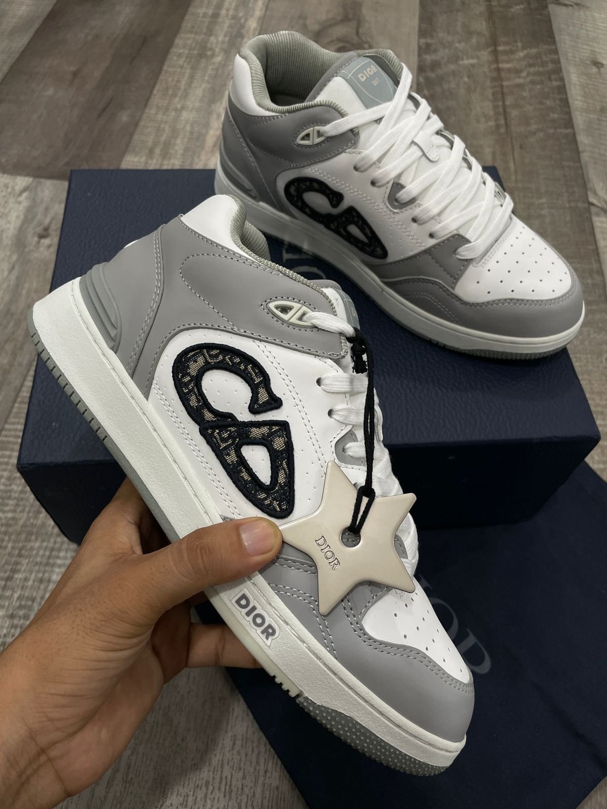 CHRISTIAN DIOR || Sneaker mi-haute en cuir de veau lisse gris et blanc; sneaker en jacquard oblique