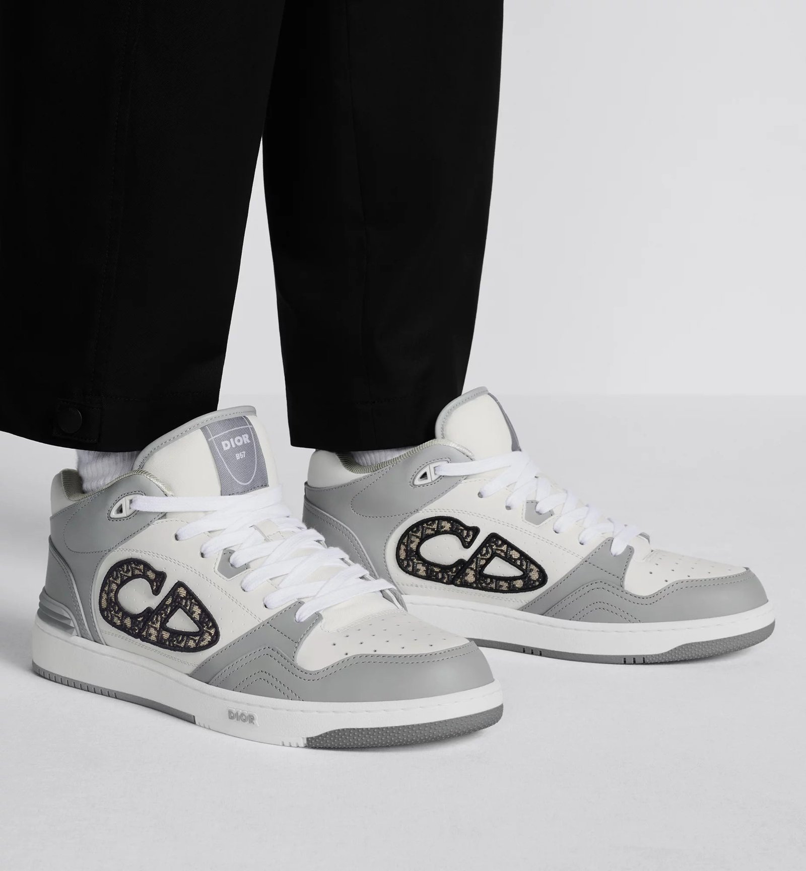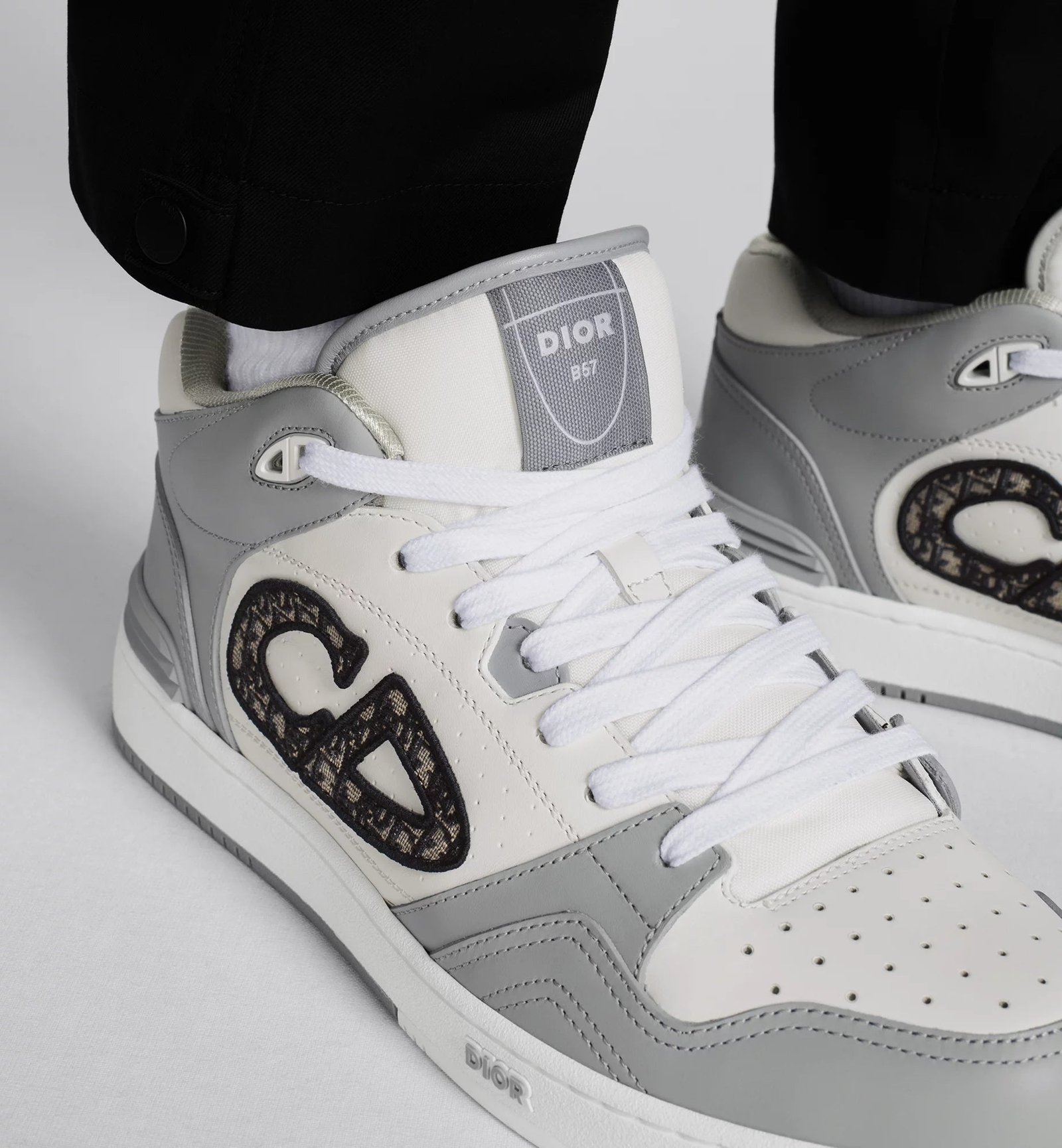 CHRISTIAN DIOR || Sneaker mi-haute en cuir de veau lisse gris et blanc; sneaker en jacquard obliqueCHRISTIAN DIOR || Sneaker mi-haute en cuir de veau lisse gris et blanc; sneaker en jacquard oblique