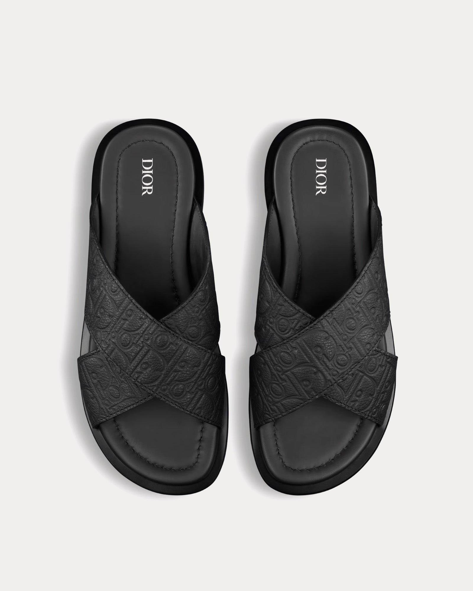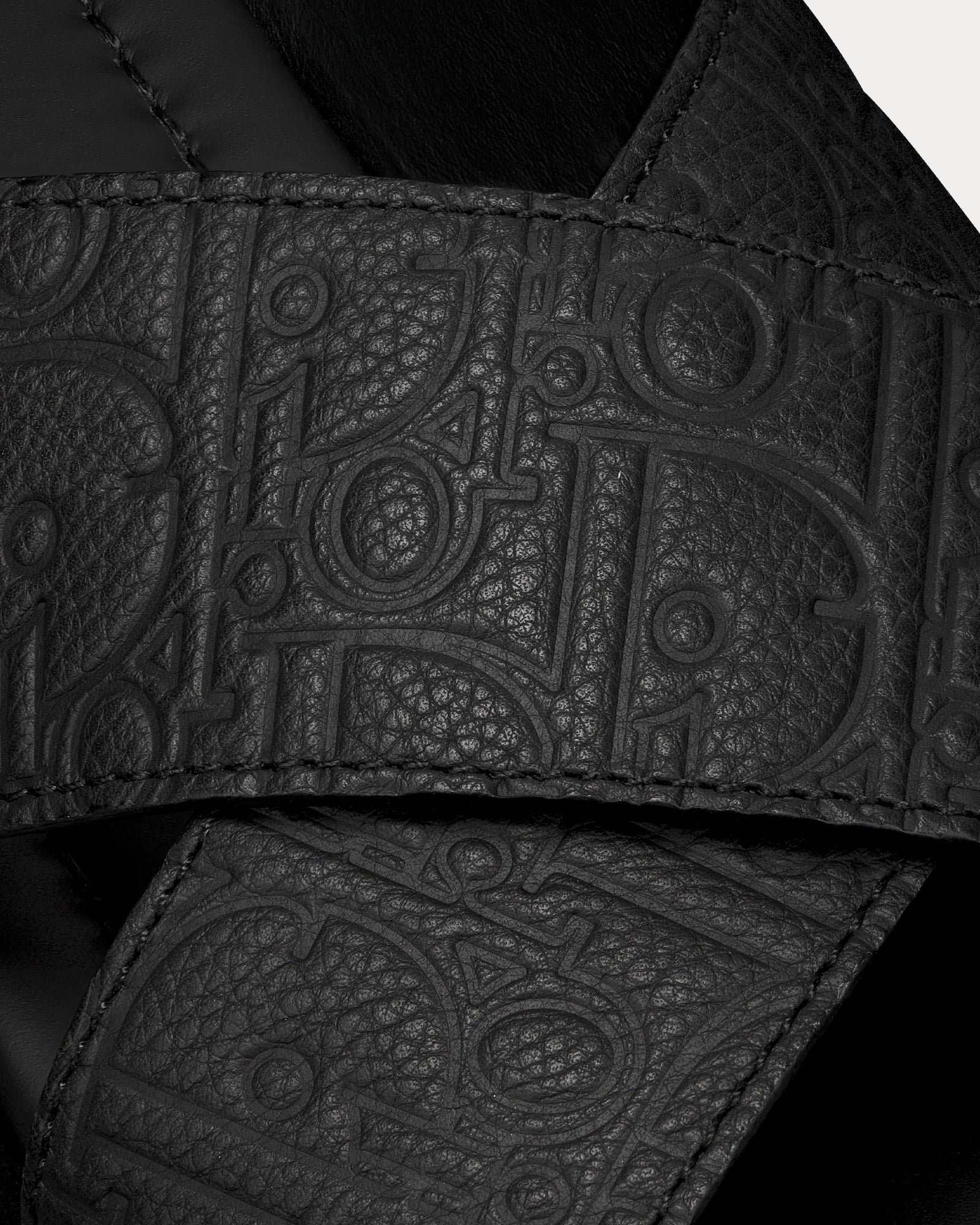 Les sandales DiorAlias pour homme en noir Dior gravity sont confectionnées en cuir et présentent une tige en cuir de veau grainé embossé, des semelles intérieures en cuir de veau, des semelles extérieures en caoutchouc avec inserts antidérapants Dior Oblique et une construction soudée. Fabriquées en Italie.