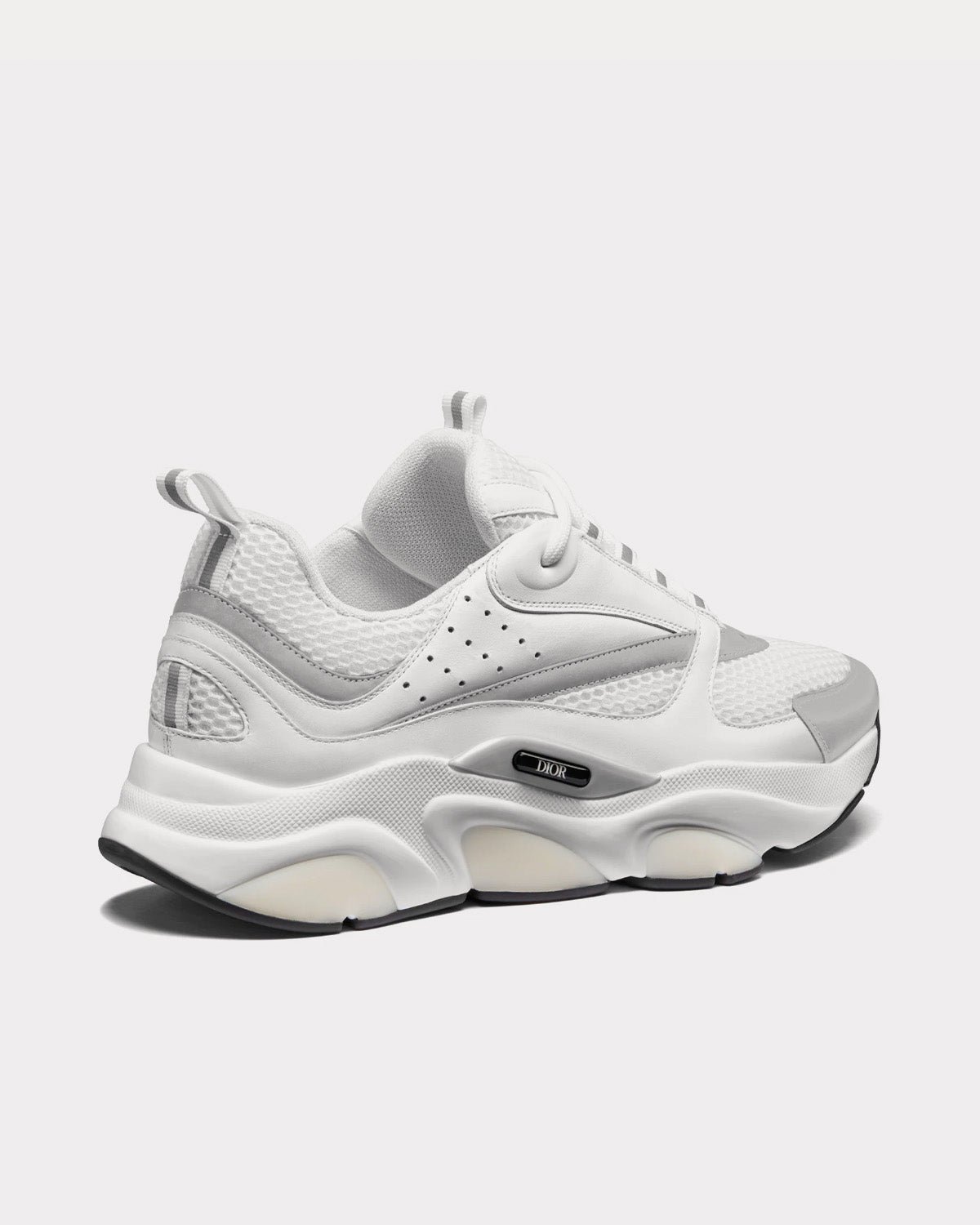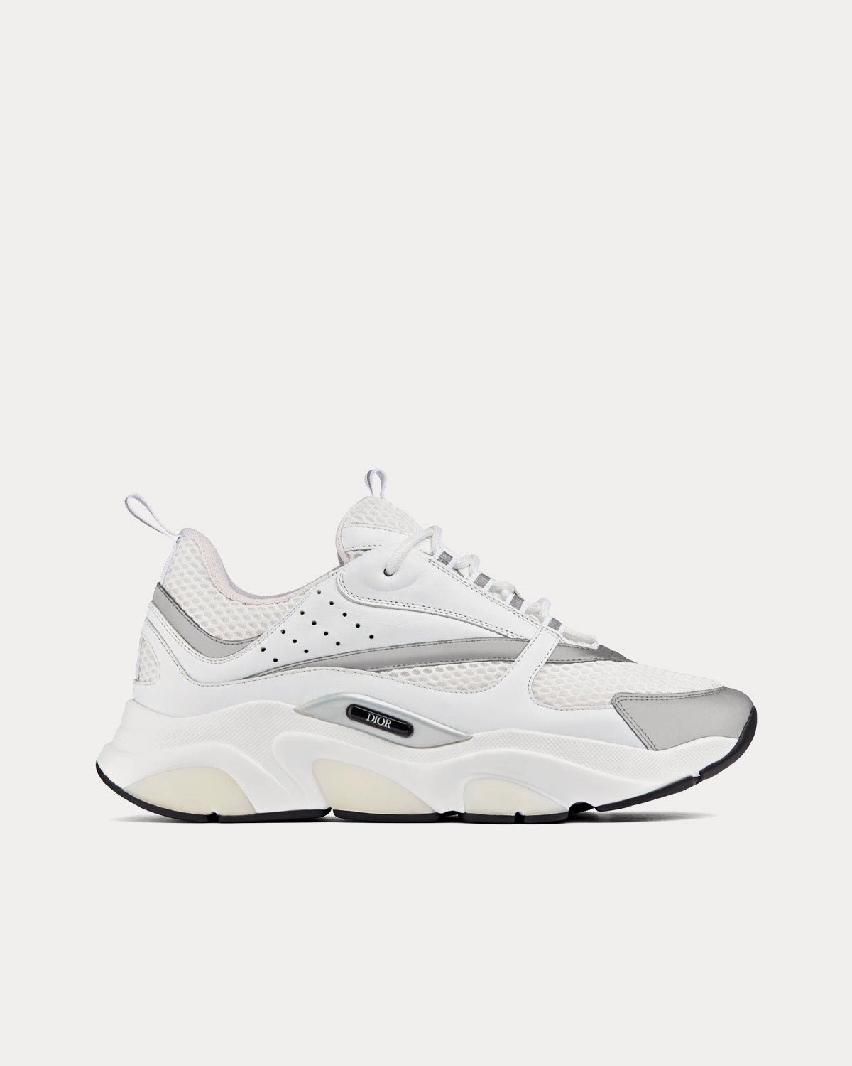 Baskets basses Dior B22 pour homme en mesh technique blanc, cuir de veau lisse blanc et argent, signature « DIOR » sur le côté, languettes et lacets en nylon, doublure en nylon et cuir de veau, et semelle extérieure sculptée en caoutchouc blanc avec liseré noir. Fabriquées en Italie.