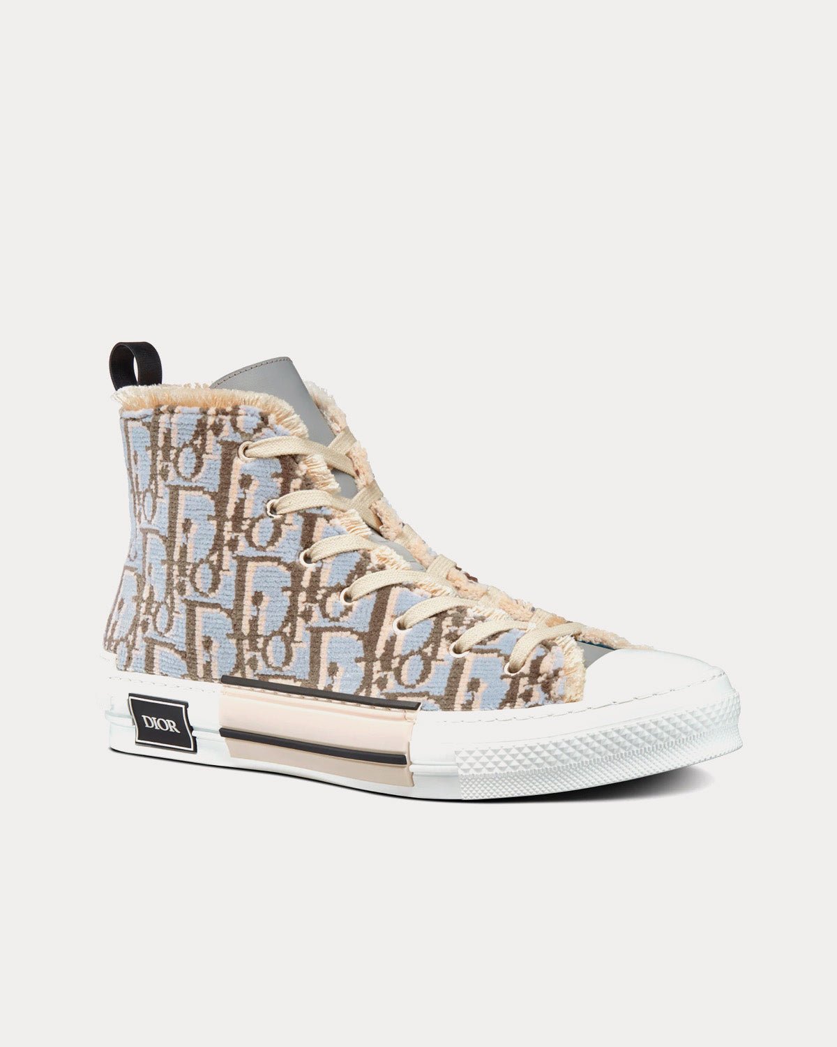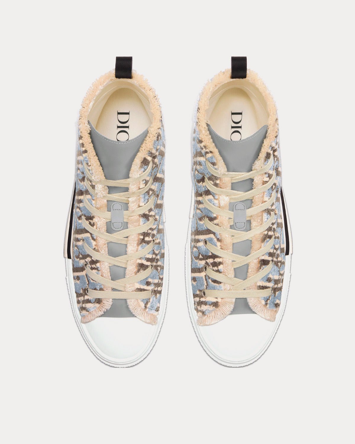 La sneaker montante B23, revisitée avec audace par Kim Jones, arbore le motif Dior Oblique grège emblématique brodé de fil de laine. Des détails essentiels, tels que des œillets et un lacet sur le devant, une semelle en caoutchouc blanc à empiècements contrastés, un bout arrondi et renforcé ainsi qu’une languette arrière au talon, rappellent les codes de la chaussure montante classique, le tout complété par une doublure en cuir de veau souple. Cette sneaker s’accorde parfaitement avec toutes les tenues décontractées.