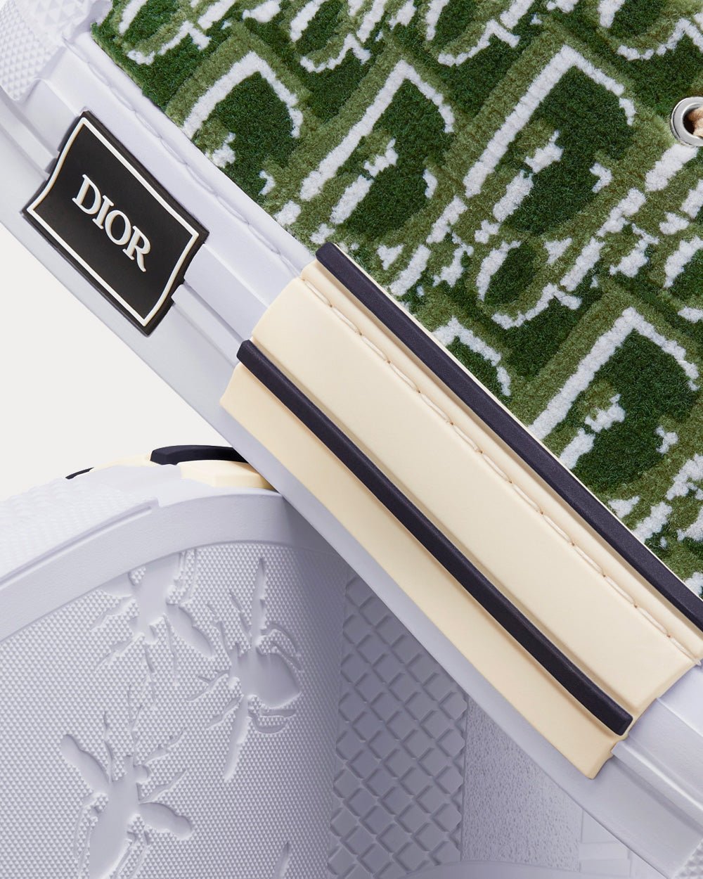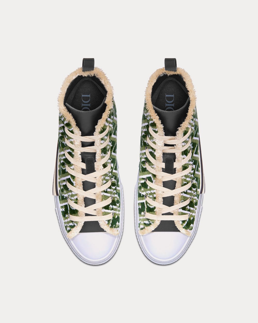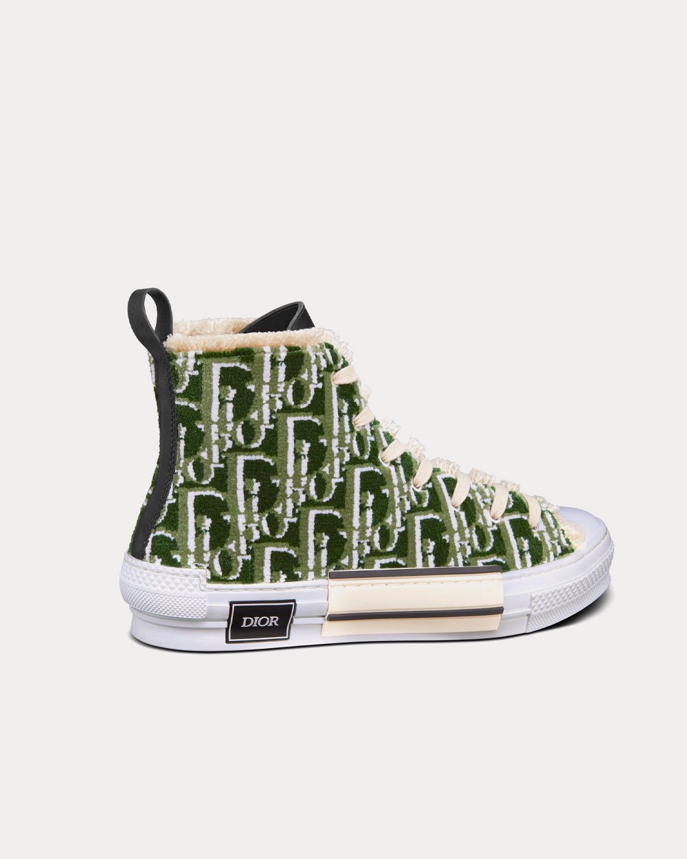 La sneaker montante B23, revisitée avec audace par Kim Jones, arbore le motif Dior Oblique olive emblématique brodé de fil de laine. Des détails essentiels, tels que des œillets et un lacet sur le devant, une semelle en caoutchouc blanc à empiècements contrastés, un bout arrondi et renforcé ainsi qu’une languette arrière au talon, rappellent les codes de la chaussure montante classique, le tout agrémenté d’une doublure en cuir de veau souple. Cette sneaker s’accorde parfaitement avec toutes les tenues décontractées.