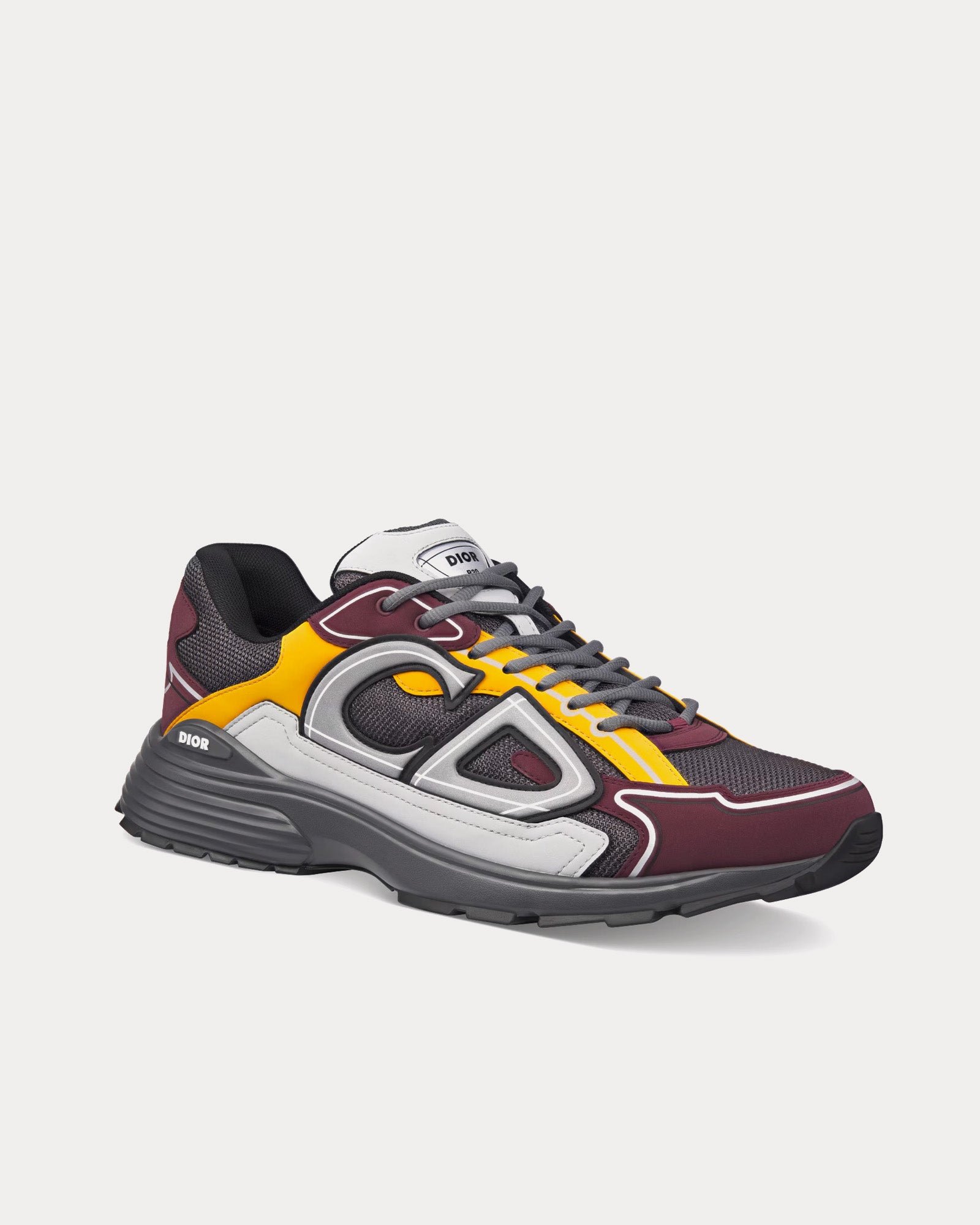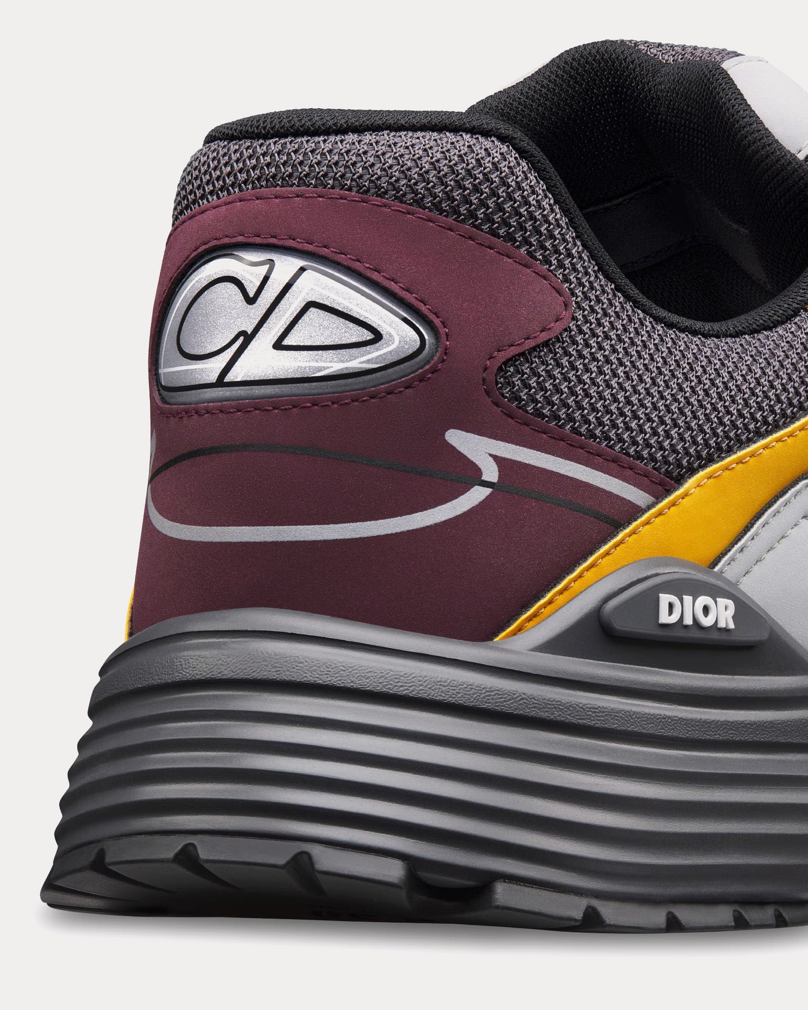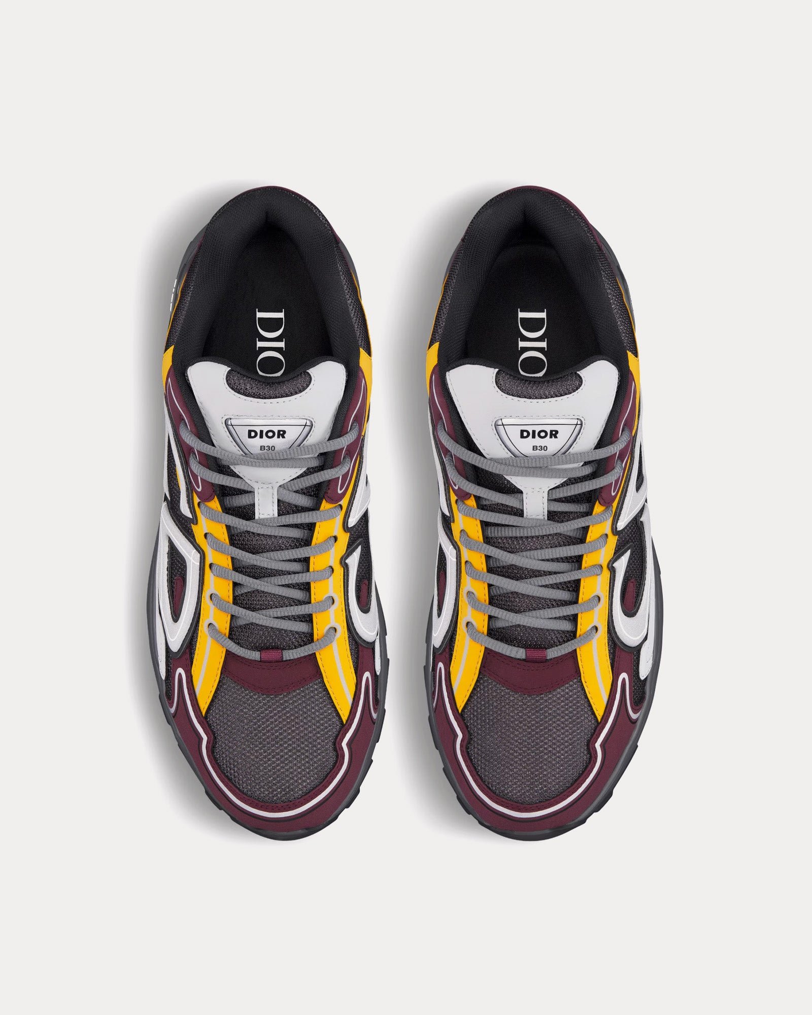 Les baskets basses pour homme Dior B30 en résille gris foncé avec tissu technique bordeaux, jaune et gris sont confectionnées en maille et tissu technique et présentent une languette signature Dior B30, une fermeture à lacets, une doublure en cuir de veau et maille technique, une semelle extérieure en caoutchouc sculpté ultra-légère avec bordure signature Dior, une semelle bicolore avec signature Dior, B30 et CD30, et une construction soudée.