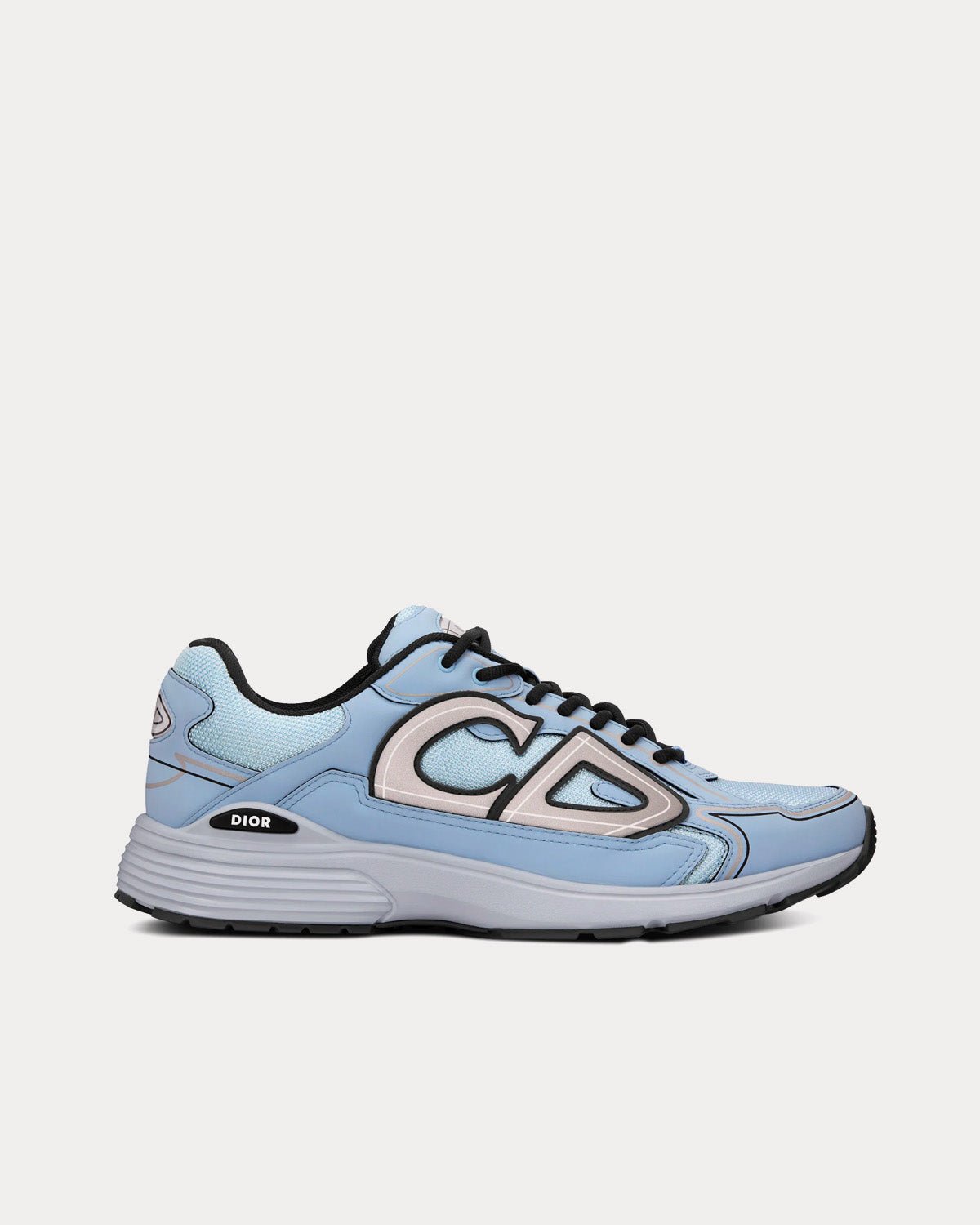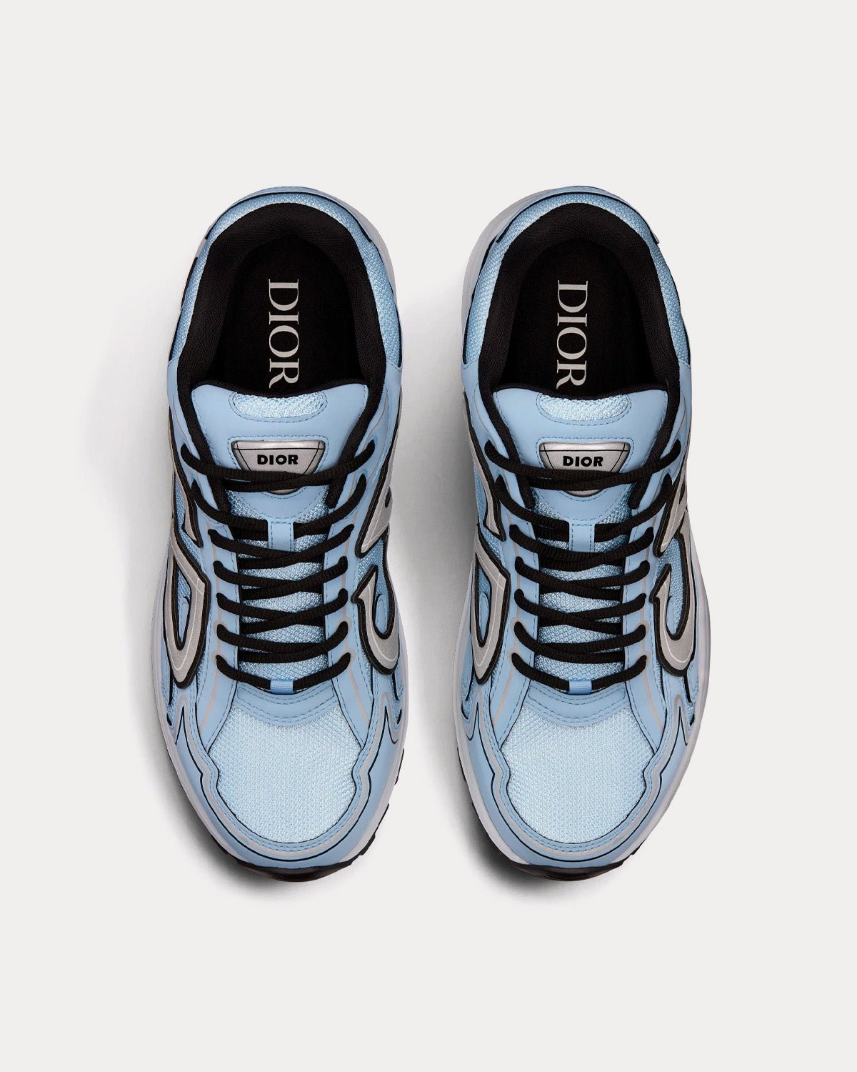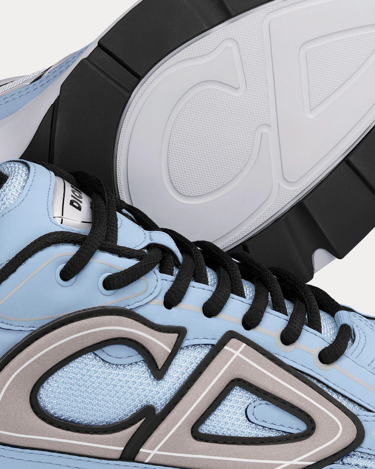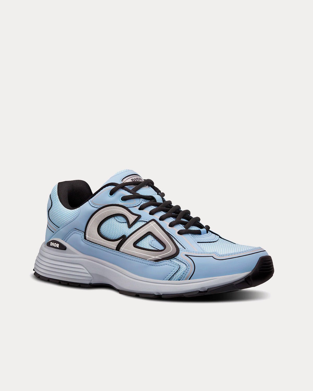 Baskets basses Dior B30 pour homme en mesh bleu et tissu technique, avec signatures CD30 réfléchissantes grises à l’arrière et sur les côtés, languette signature Dior B30, fermeture à lacets, doublure en cuir de veau et mesh technique, semelle extérieure en caoutchouc sculpté ultra-légère grise avec signature Dior et liseré noir, semelle bicolore avec signatures Dior, CD30 et B30, et construction soudée. Fabriquées en Italie.