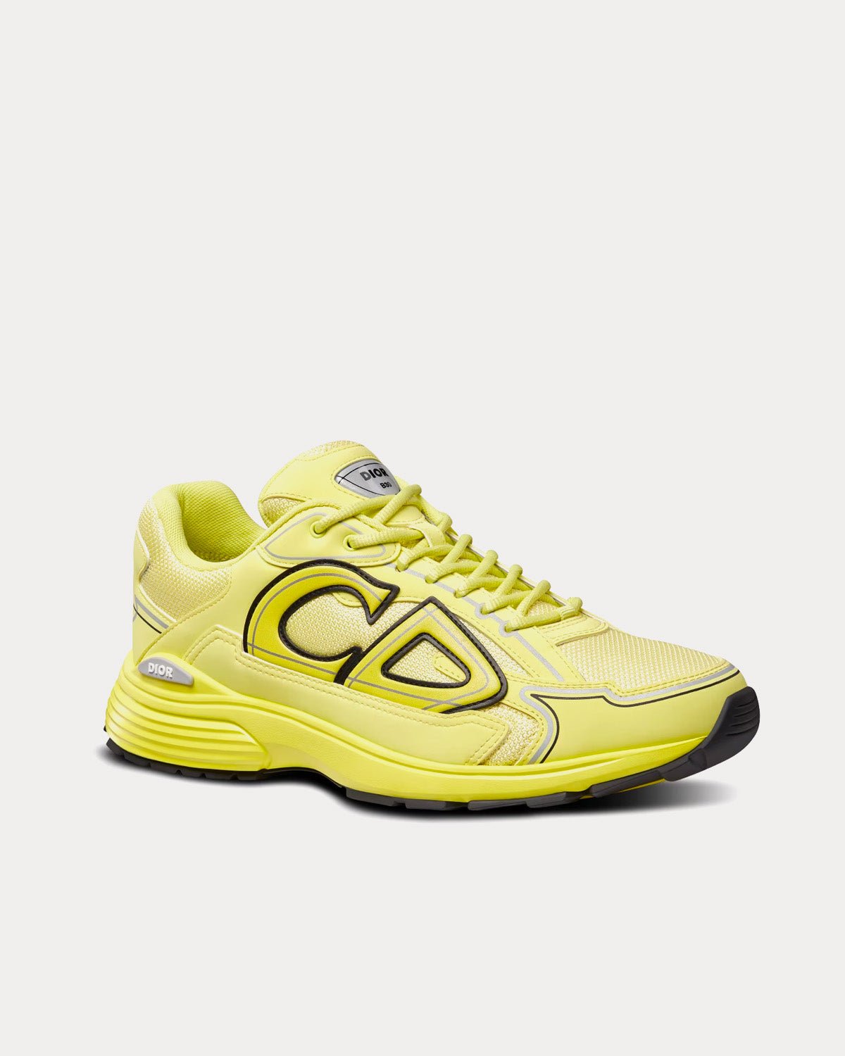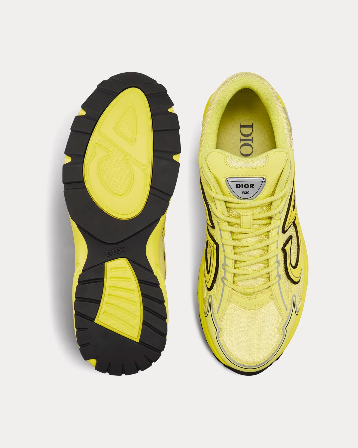 Les baskets basses DiorB30 pour homme en maille jaune et tissu technique présentent des signatures CD30 réfléchissantes à l’arrière et sur les côtés, une languette signature Dior B30, une doublure en cuir de veau et maille technique, une semelle extérieure en caoutchouc sculpté ultra-légère avec la signature Dior, une tige avec les signatures Dior, CD30 et B30, et une construction soudée. Fabriquées en Italie.