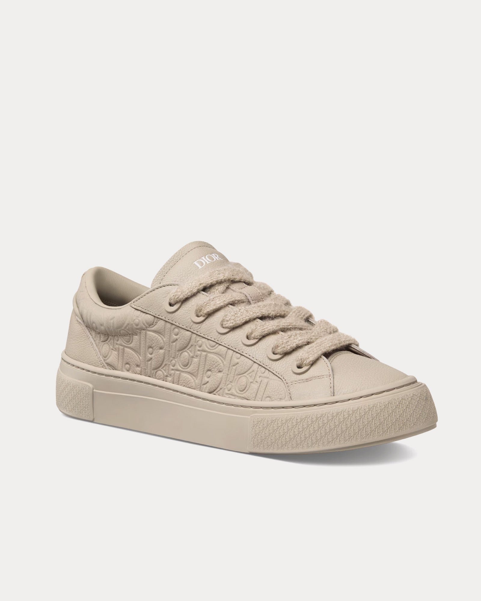 Les baskets basses pour homme Dior B33 en cuir de veau grainé beige et cuir Dior Gravity beige s’inspirent des tennis intemporelles et arborent la signature Dior embossée sur la languette, la signature Dior 30 Avenue Montaigne embossée à l’arrière, des œillets en laiton mat avec fermeture à lacets en mohair, un col matelassé, une doublure en cuir, une semelle en caoutchouc et une semelle extérieure à motifs Cannage Warped et Dior Oblique. Fabriquées en Italie.