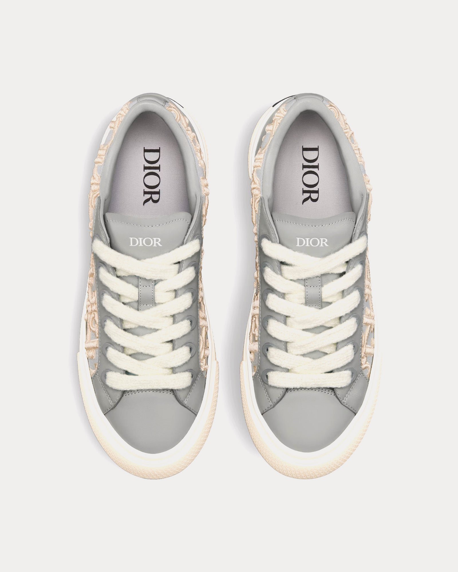 Les baskets basses pour homme Dior B33 en Cuir de veau lisse gris avec broderie Dior Oblique en relief crème s’inspirent des chaussures de tennis intemporelles et arborent une broderie Dior Oblique en relief crème, la signature Dior embossée sur la languette, la signature Dior 30 Avenue Montaigne à l’arrière, une fermeture à lacets en mohair blanc avec œillets en laiton mat, un col rembourré, des pattes arrière, une doublure en cuir, des semelles en caoutchouc Dior Oblique crème et des semelles extérieures à motifs Warped Cannage et Dior Oblique. Fabriquées en Italie.