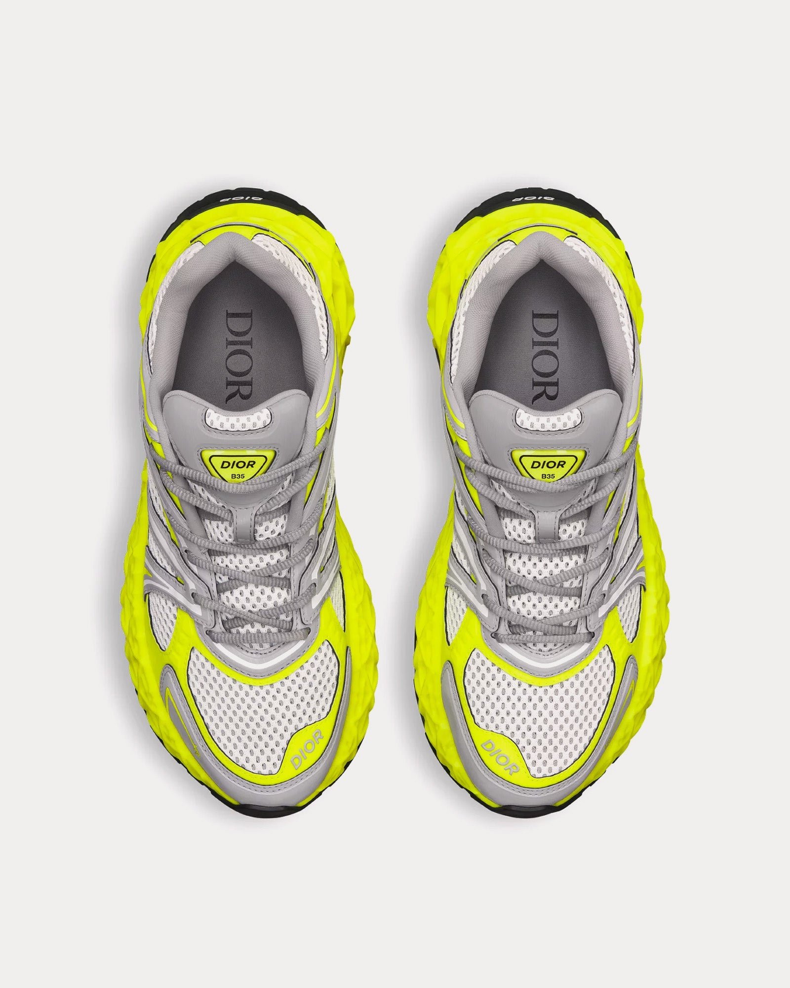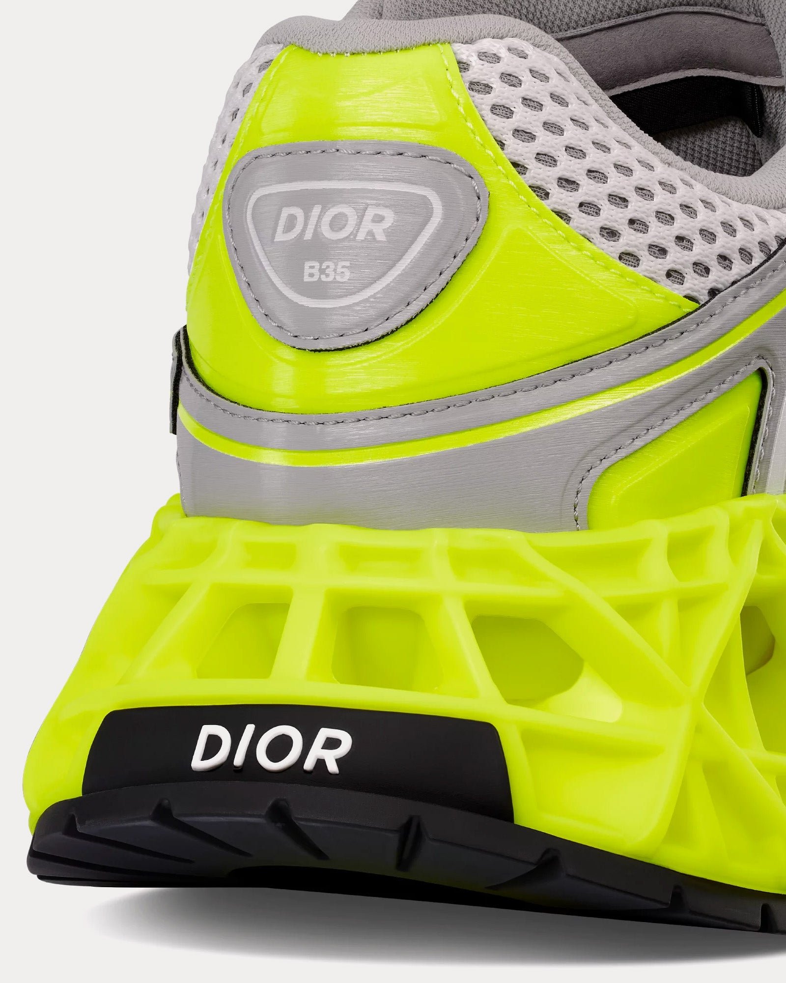 Les baskets basses pour homme Dior B35 NXXT en jaune fluo et gris clair sont une fusion saisissante de savoir-faire traditionnel et de design futuriste. Limitée à seulement 888 pièces numérotées, cette silhouette exclusive reflète la volonté constante de Dior d’innover et d’intégrer le numérique. Elle est dotée d’une puce NFC sécurisée intégrée à la languette qui donne accès à un certificat d’authenticité numérique et à des aperçus des futures collections.