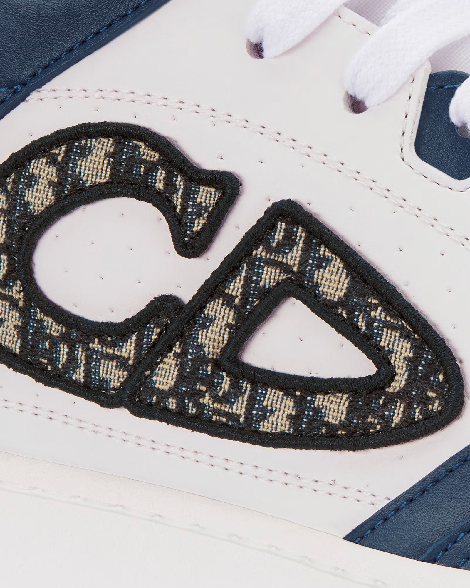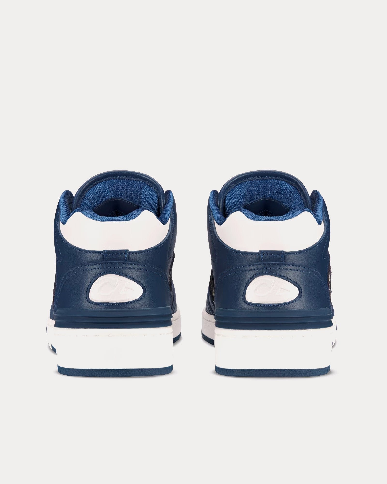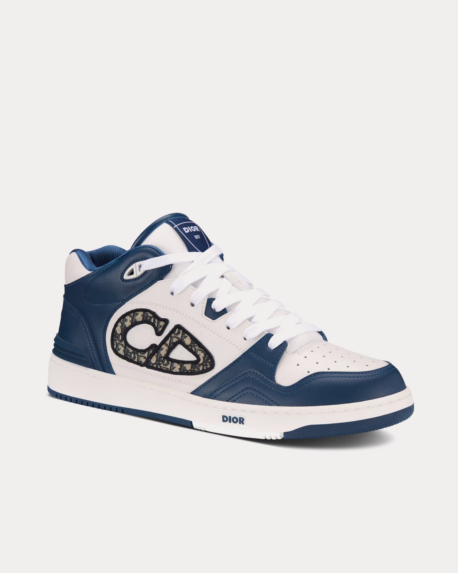 Les baskets mi-montantes Dior B57 pour homme en cuir de veau lisse bleu marine et blanc avec jacquard Dior Oblique beige et noir présentent la signature CD en cuir sur les côtés, une languette signature Dior B57, la signature CD sur les talons, une conception mi-montante avec cheville rembourrée, une fermeture à lacets avec œillets signature CD bicolores, des détails reforés sur les orteils, une doublure en mesh technique, une semelle extérieure en caoutchouc avec signature Dior et une construction soudée et cousue sur les côtés. Fabriquées en Italie.
