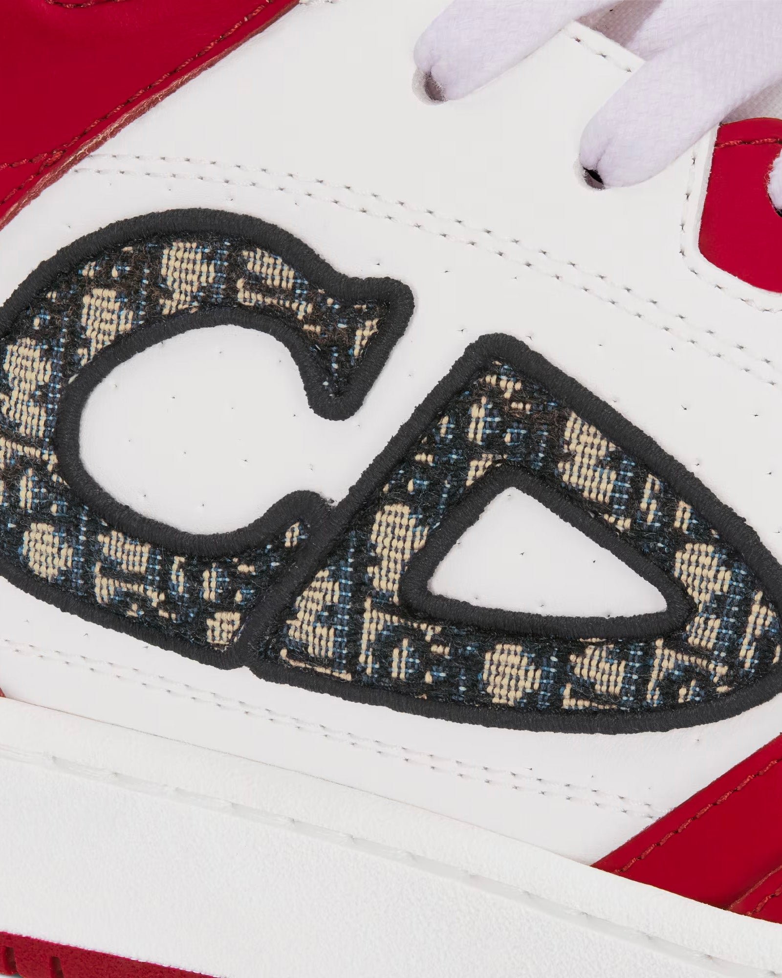 Les baskets mi-montantes Dior B57 pour homme en cuir de veau lisse rouge et blanc avec jacquard Dior Oblique beige et noir présentent la signature CD en cuir sur les côtés, une languette signature Dior B57, la signature CD sur les talons, une conception mi-montante avec cheville matelassée, une fermeture à lacets avec œillets bicolores signature CD, des détails reforés sur les orteils, une doublure en mesh technique, une semelle extérieure en caoutchouc avec signature Dior et une construction soudée et cousue sur les côtés. Fabriquées en Italie. Partie de la capsule Dior & Otani Workshop.