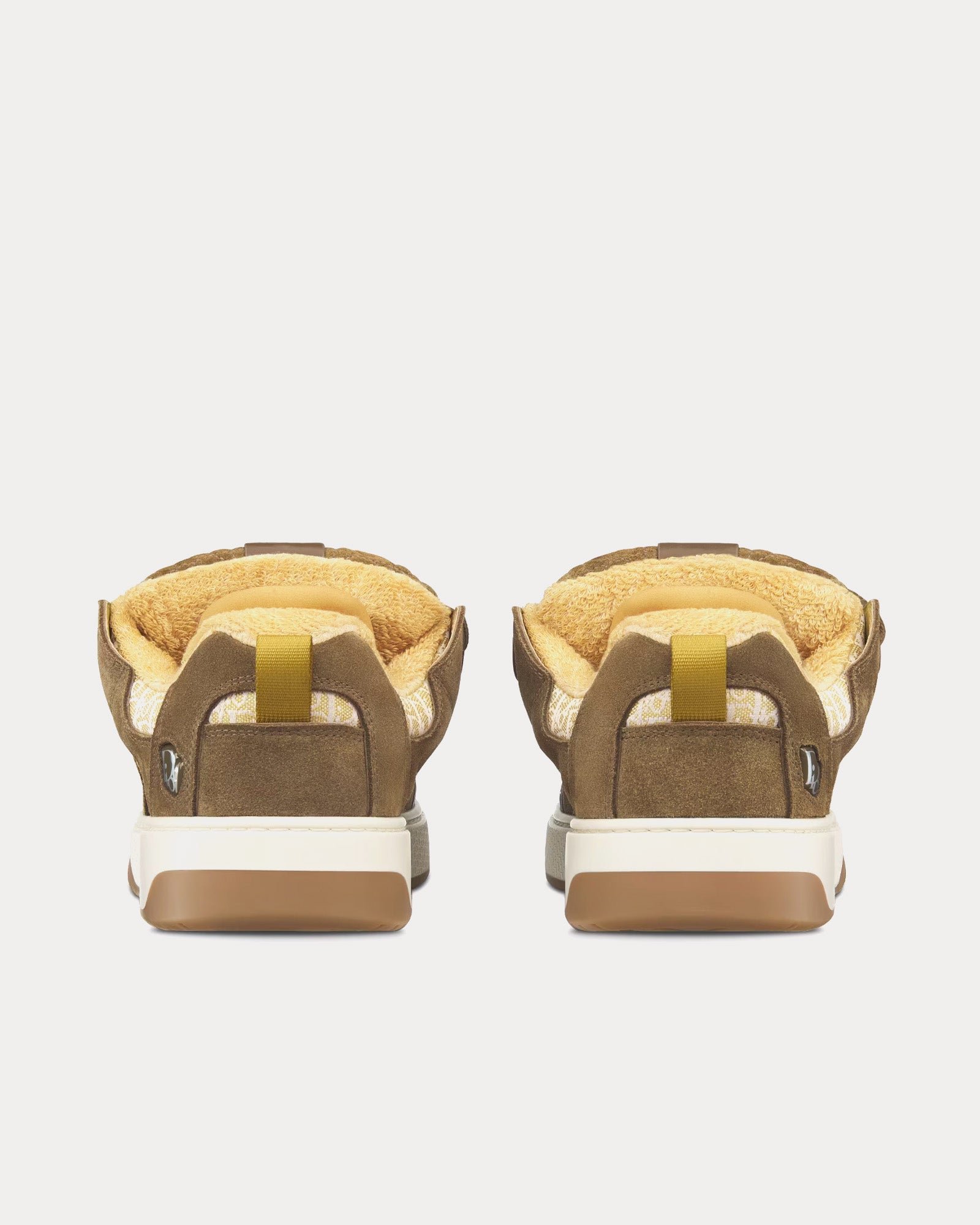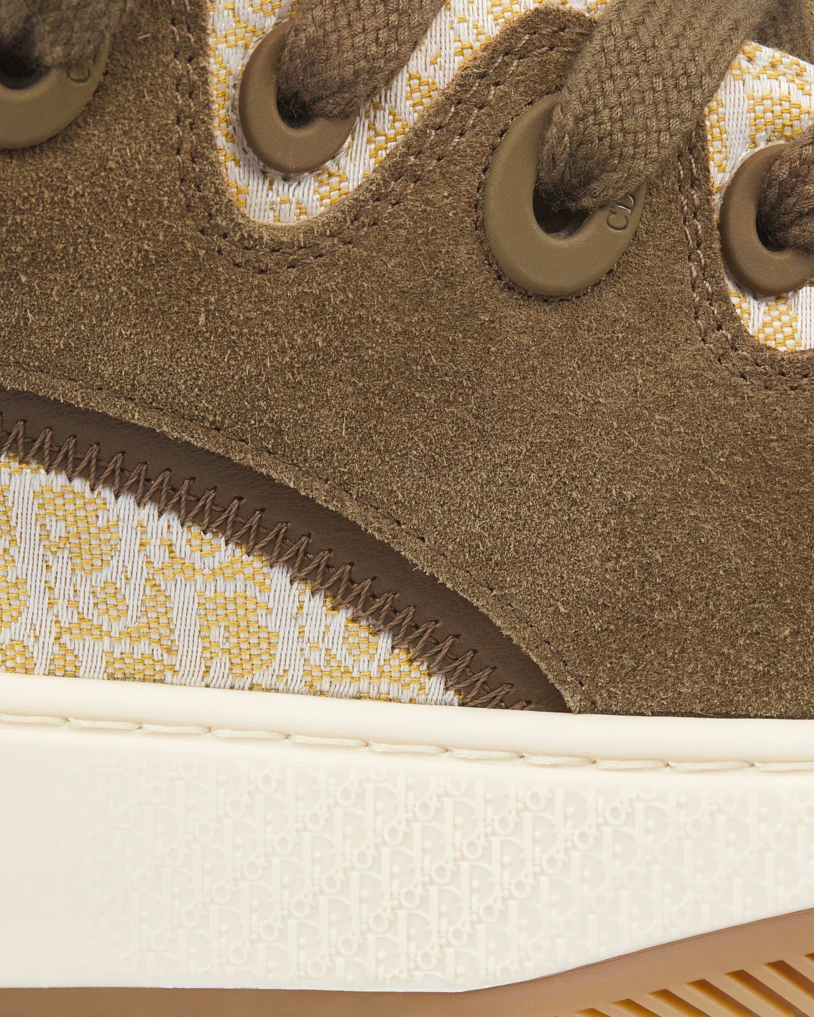 Les baskets basses pour homme DiorB9S Skater en suède kaki avec jacquard Dior Oblique vert et beige présentent des étiquettes en cuir avec la signature Dior brodée sur la languette, un empiècement signature Dior sur les côtés, une languette rembourrée Cannage, des fermetures à lacets avec œillets Dior, des bouts renforcés en caoutchouc Cannage, des semelles en caoutchouc bicolores avec motif Dior Oblique dégradé et signature Dior, des semelles extérieures en caoutchouc avec motif Cannage et signature Dior, une semelle intérieure de maintien en tissu technique et une doublure en polaire ton sur ton. Fabriquées en Italie.