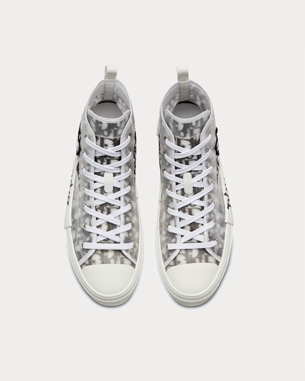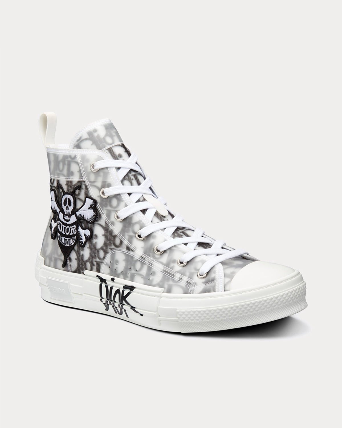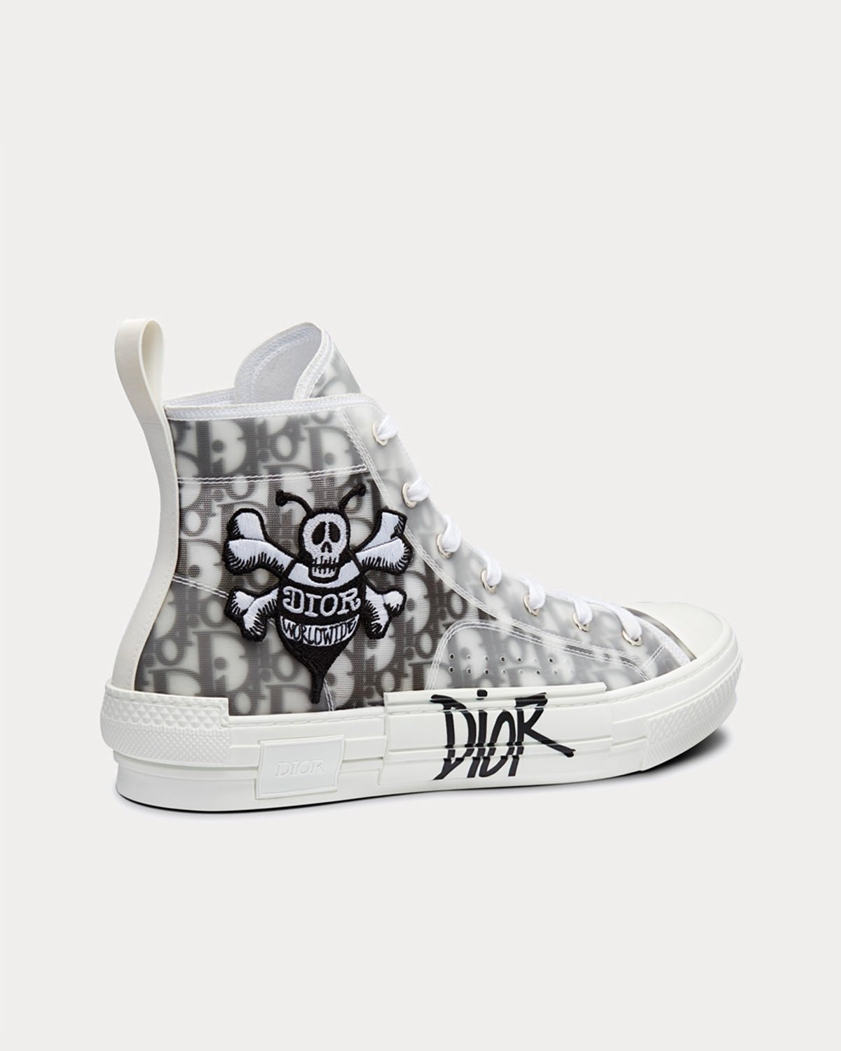 La sneaker montante B23 est une interprétation élégante d’une sneaker classique. Confectionnée en mesh transparent orné du motif emblématique Dior Oblique, elle arbore l’écusson abeille brodé DIOR AND SHAWN sur le côté et le logo sur la semelle. Une boucle arrière en caoutchouc blanc complète les lacets blancs et la semelle en caoutchouc blanc aux détails déstructurés et rapiécés.