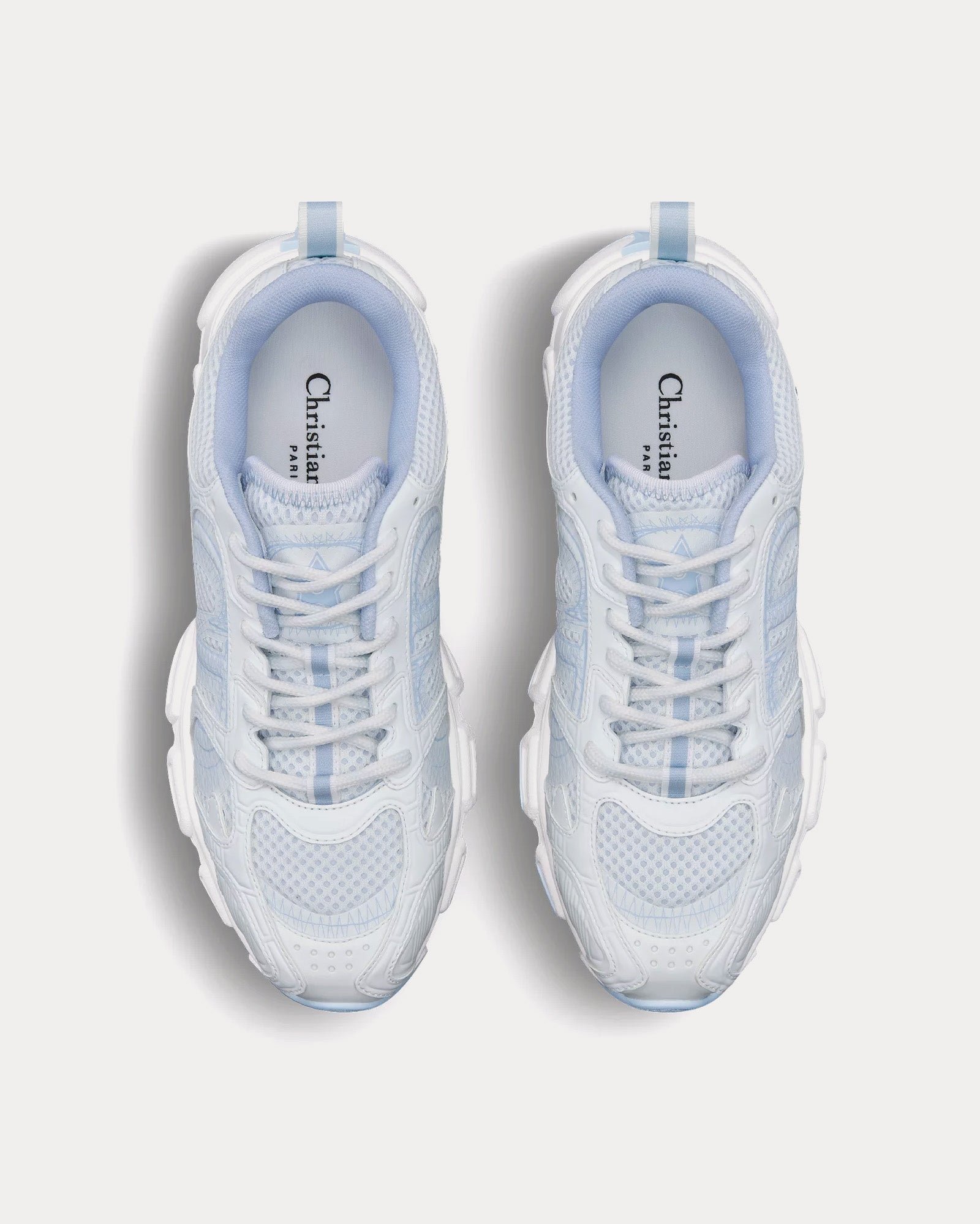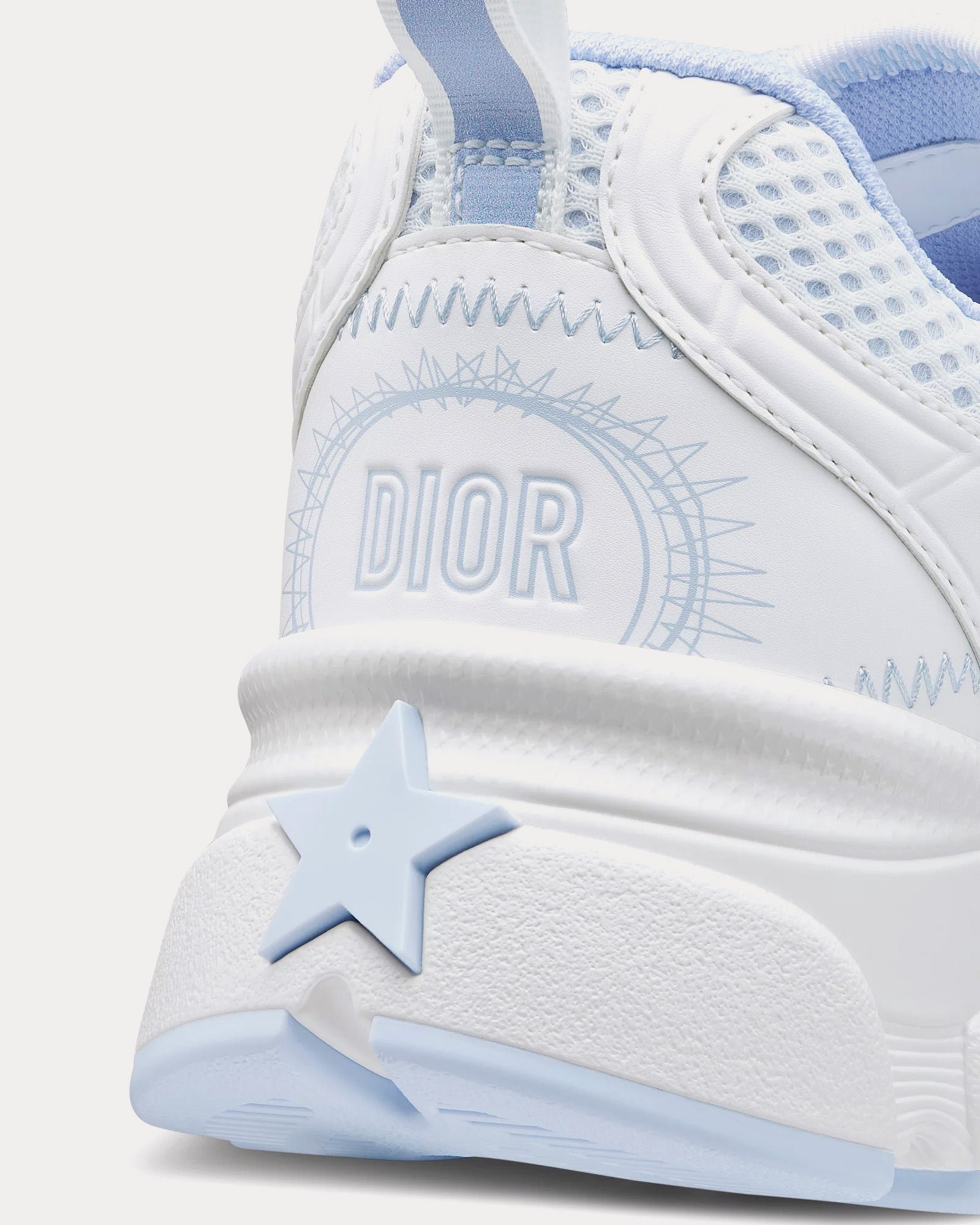 L’empeigne associe une maille respirante à des empiècements effet cuir blanc et bleu ciel, créant un contraste de textures moderne. Les détails Dior emblématiques incluent la signature CD sur les côtés, un patch étoile sur la languette et une signature Dior à l’arrière, ajoutant une touche subtile et emblématique à la marque. Les lacets bicolores rehaussent le design dynamique de la sneaker, tandis que la semelle EVA ultra-légère arbore le motif étoile signature de Dior, symbolisant le porte-bonheur de Christian Dior.