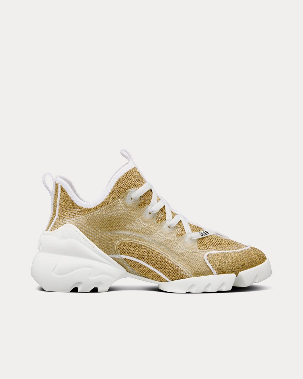 La sneaker D-Connect, signature de la Maison, est revisitée avec élégance par Maria Grazia Chiuri. Ce modèle en mesh laminé doré présente une semelle extérieure épaisse, des détails en caoutchouc transparent et un bout arrondi orné de découpes en mesh laminé doré. Cette sneaker affiche un style contemporain grâce à son association de matières et à sa signature « DIOR ».