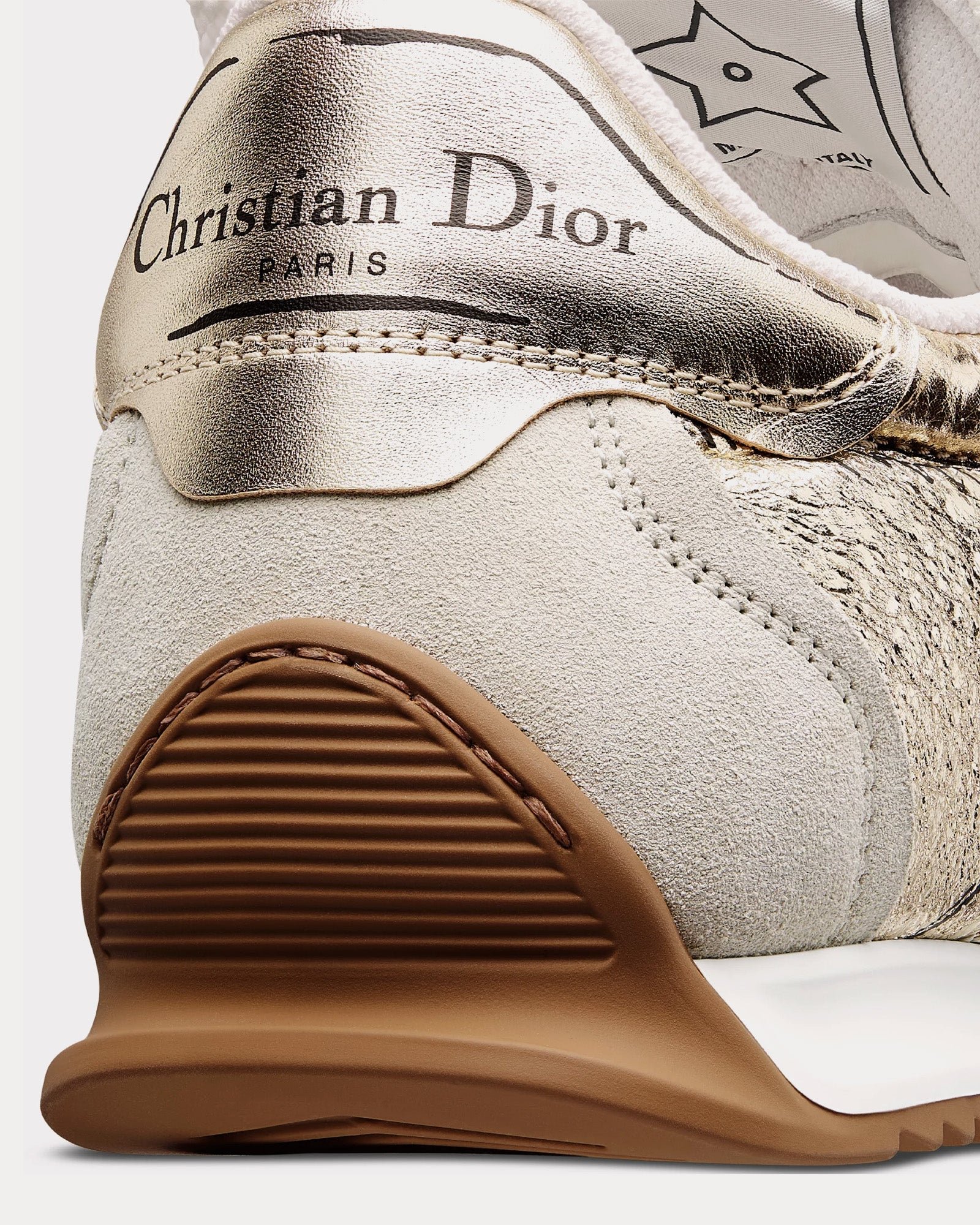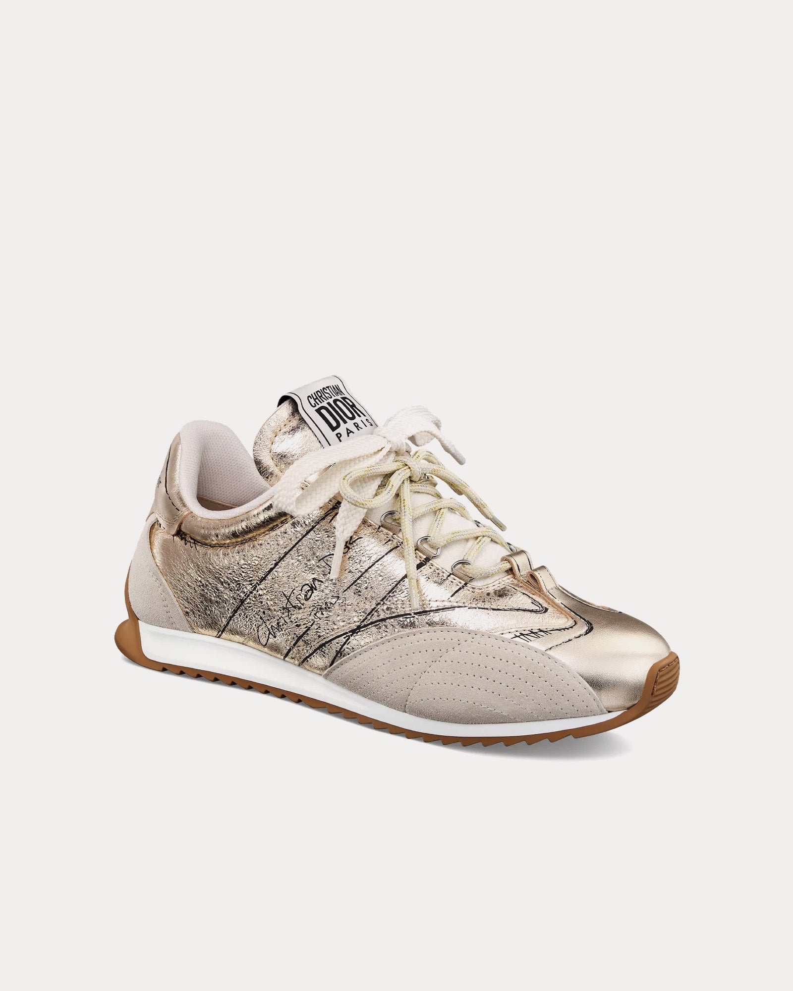 Confectionnées en cuir d’agneau froissé doré et en cuir de veau laminé, ces baskets présentent des inscriptions imprimées inspirées du processus de fabrication de chaussures. Les empiècements en cuir de veau velours beige ajoutent profondeur et texture, tandis que le double laçage rehausse leur look distinctif. La signature manuscrite Christian Dior Paris apparaît élégamment sur les côtés, complétée par un empiècement et une étiquette Christian Dior Paris sur le contrefort et la languette.