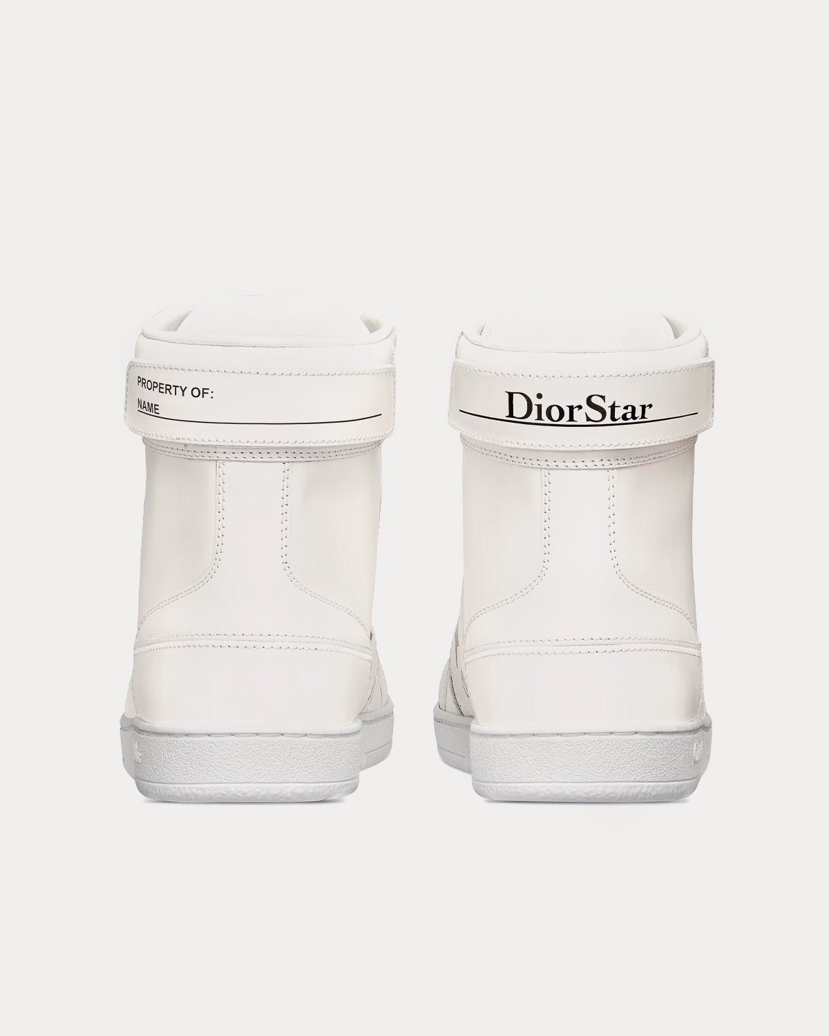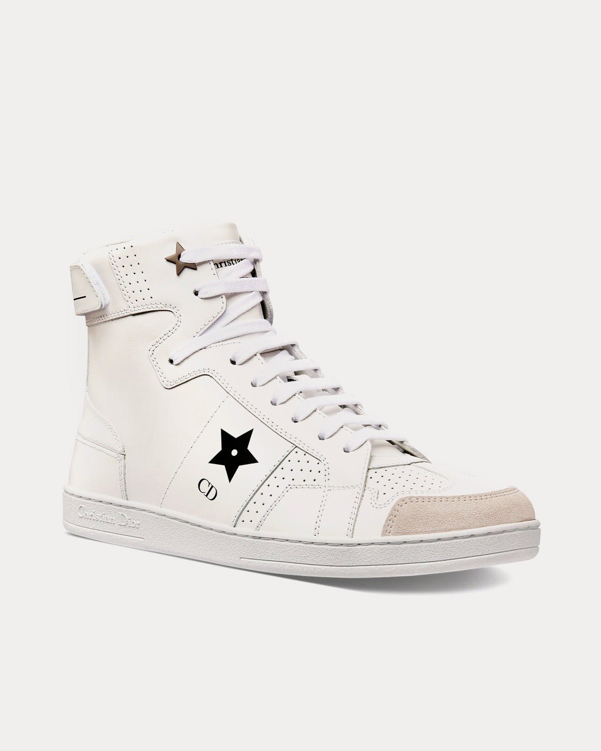 Baskets montantes Dior Star pour femme avec signature Christian Dior Paris sur la languette, signature CD avec étoile noire sur le côté, une étiquette amovible Dior Star et Property Of à l’arrière, une étoile en métal sur un œillet de laçage et une semelle en caoutchouc griffée avec étoile, le symbole porte-bonheur de Christian Dior. Fabriquées en Italie.