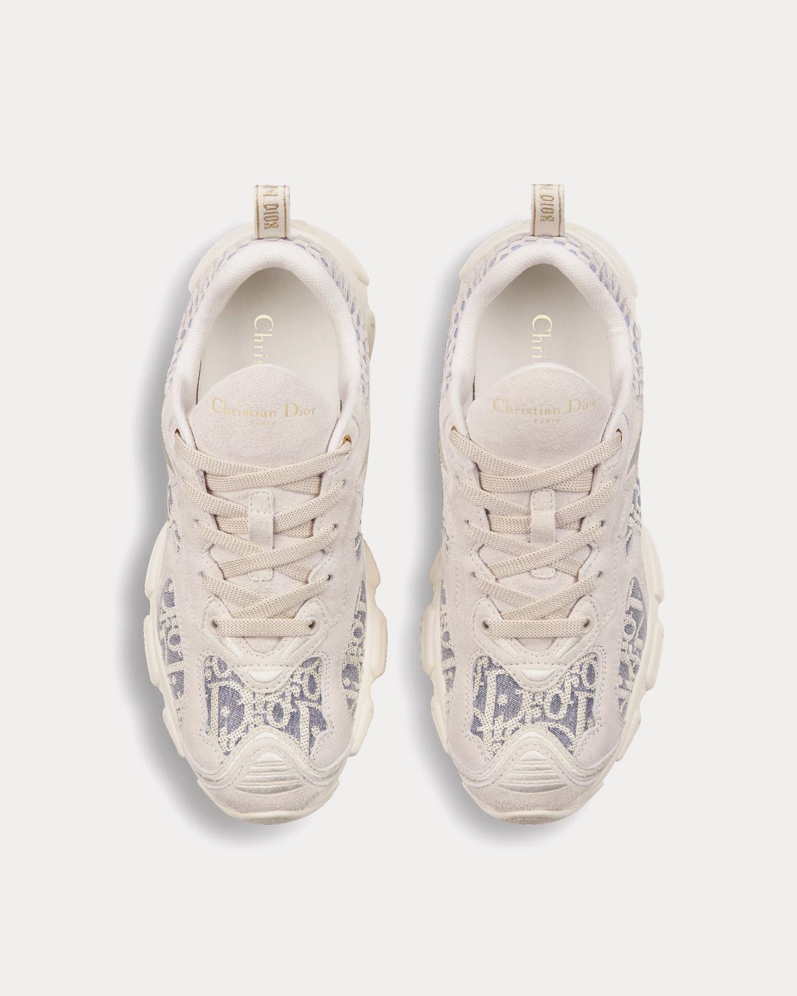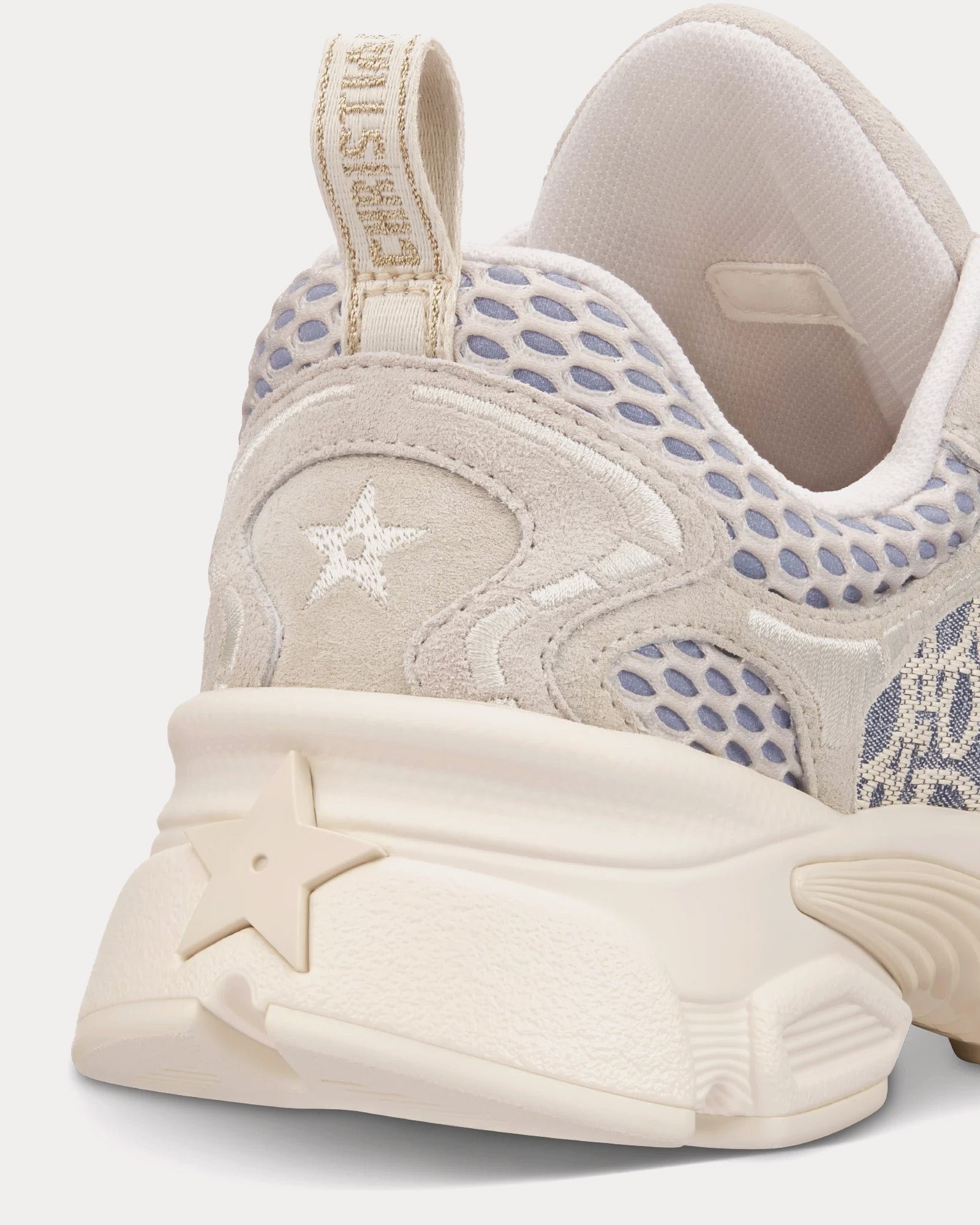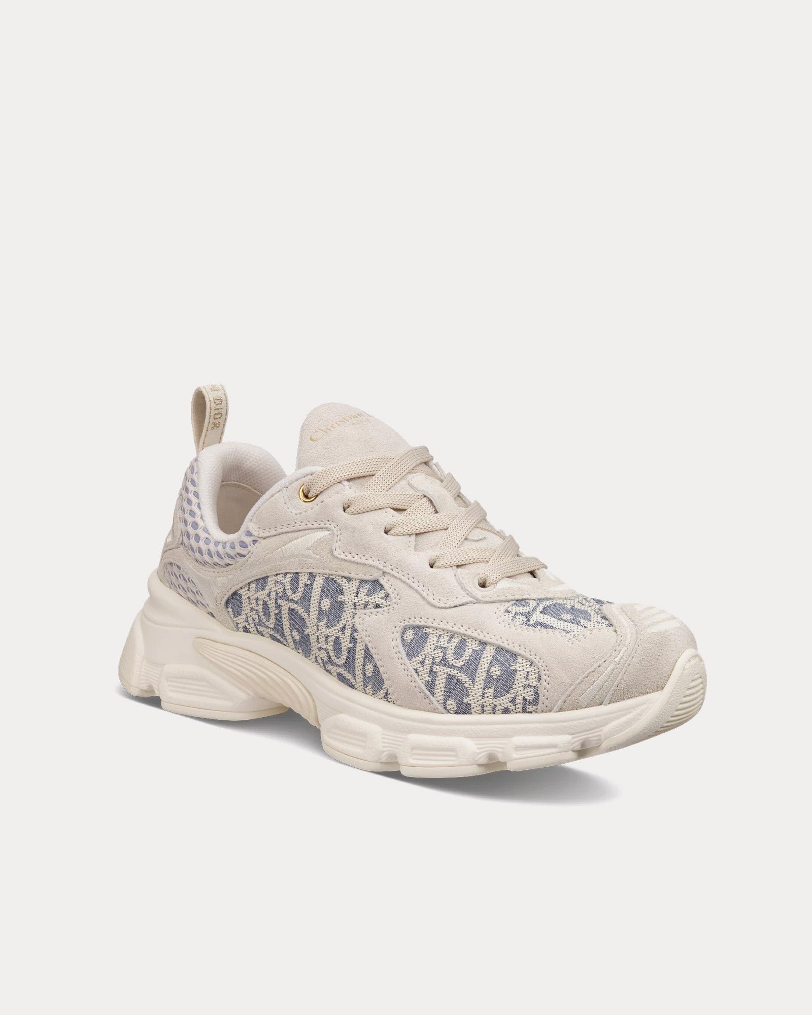 La tige associe un jacquard bleu chambray à un motif Dior Oblique en raphia écru, complété par des empiècements en mesh écru et en cuir de veau velours pour un contraste sophistiqué. Les détails emblématiques incluent des détails effet 3D, une étoile porte-bonheur brodée à l’arrière et les signatures Christian Dior sur la languette et la languette arrière, renforçant l’esthétique raffinée de la sneaker.