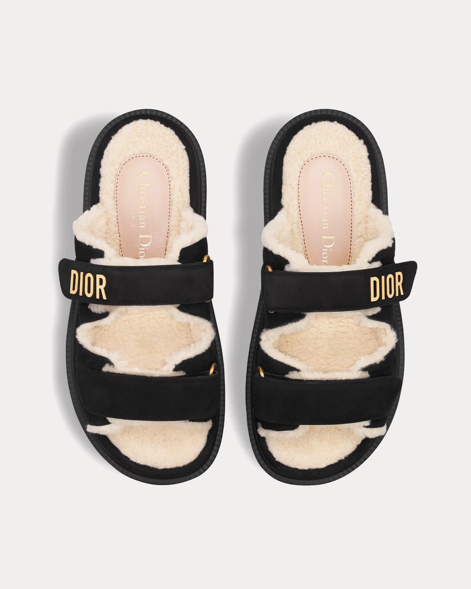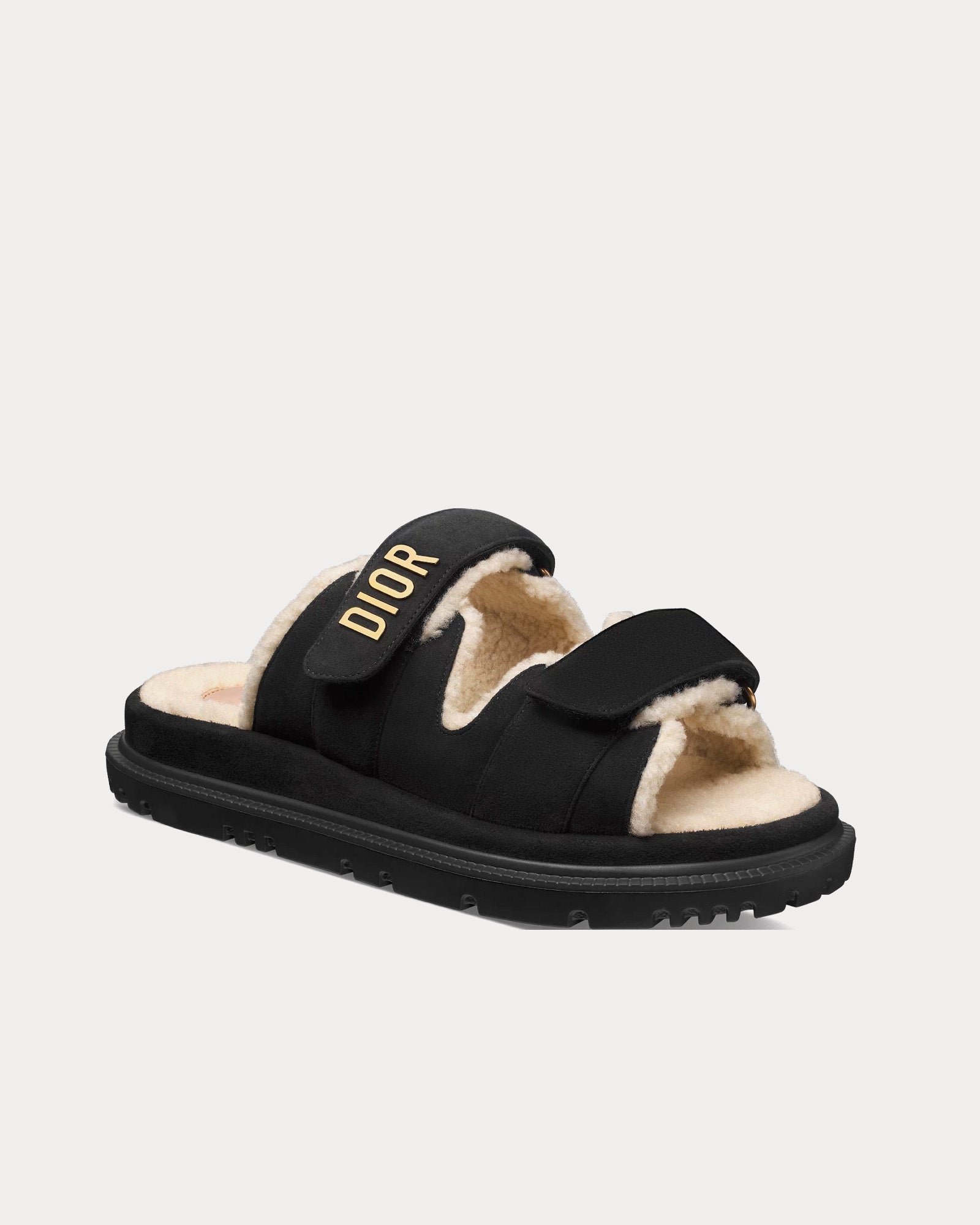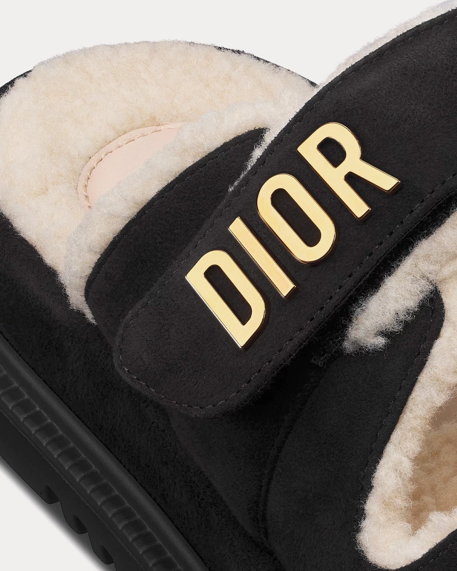 Les mules Dior Dioract pour femme, de couleur noire, présentent une tige en cuir de chèvre velours, une doublure en tissu technique, des signatures Dior en métal finition dorée, deux brides réglables à fermeture automatique, des semelles intérieures anatomiques effet peau lainée et des semelles crantées en EVA ornées d’une étoile, symbole porte-bonheur de Christian Dior. Fabriquées en Italie.
