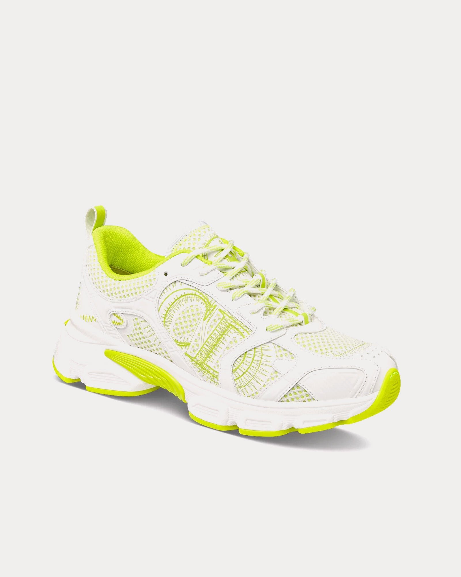 Les baskets basses DiorMiss Dior Chrono pour femme en maille blanche et vert citron avec empiècements effet cuir présentent la signature CD sur les côtés, un patch étoile sur la languette, la signature Dior à l’arrière, des lacets bicolores et des semelles en EVA signature avec étoile, symbole porte-bonheur de Christian Dior. Fabriquées en Italie.